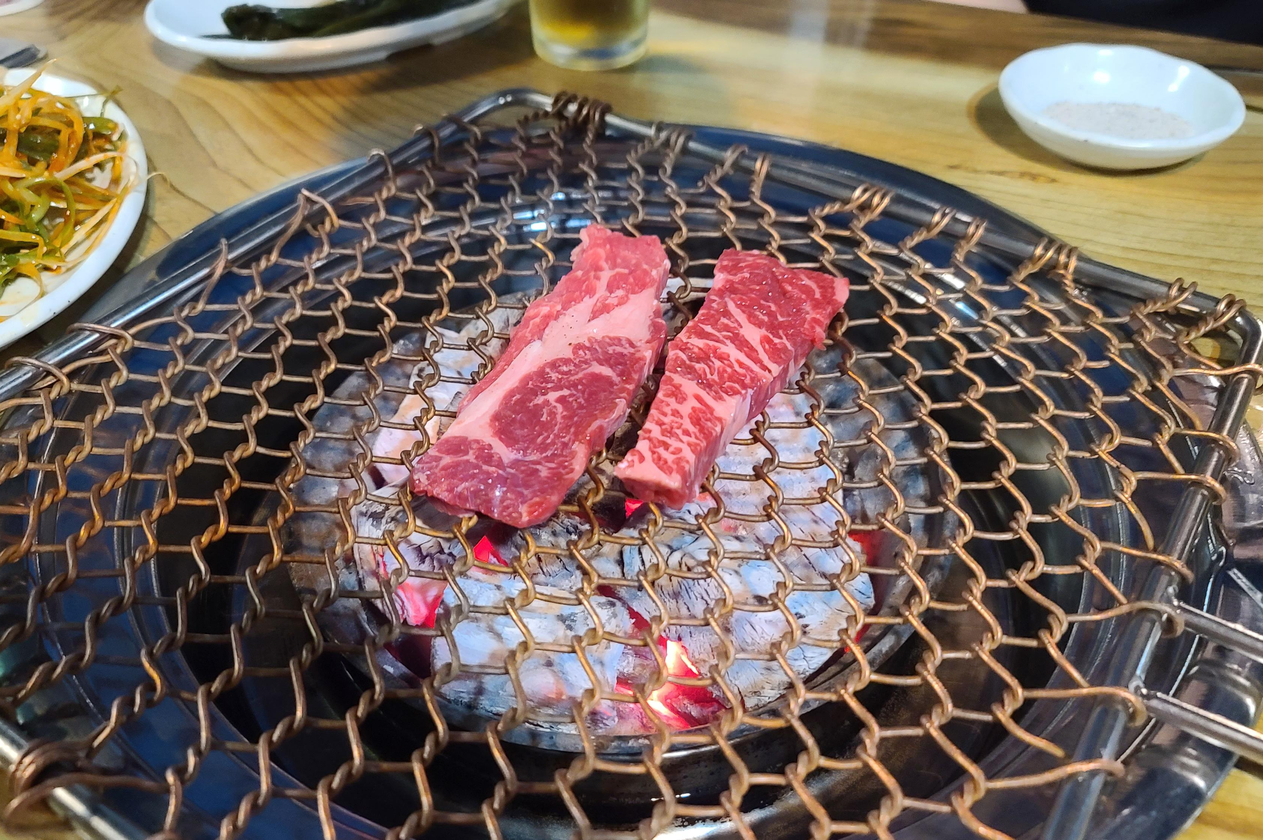 진갈비살이 나왔습니다. 미국산 소고기 답지 않게 빛깔이 살아있는게 느껴집니다. 참숯위에 소고기를 먹을만큼 올려서 구워봅니다. 참숯과 구릿빛의 그릴 아는 사람은 아는 최고의 고기맛을 내주는 조합입니다.