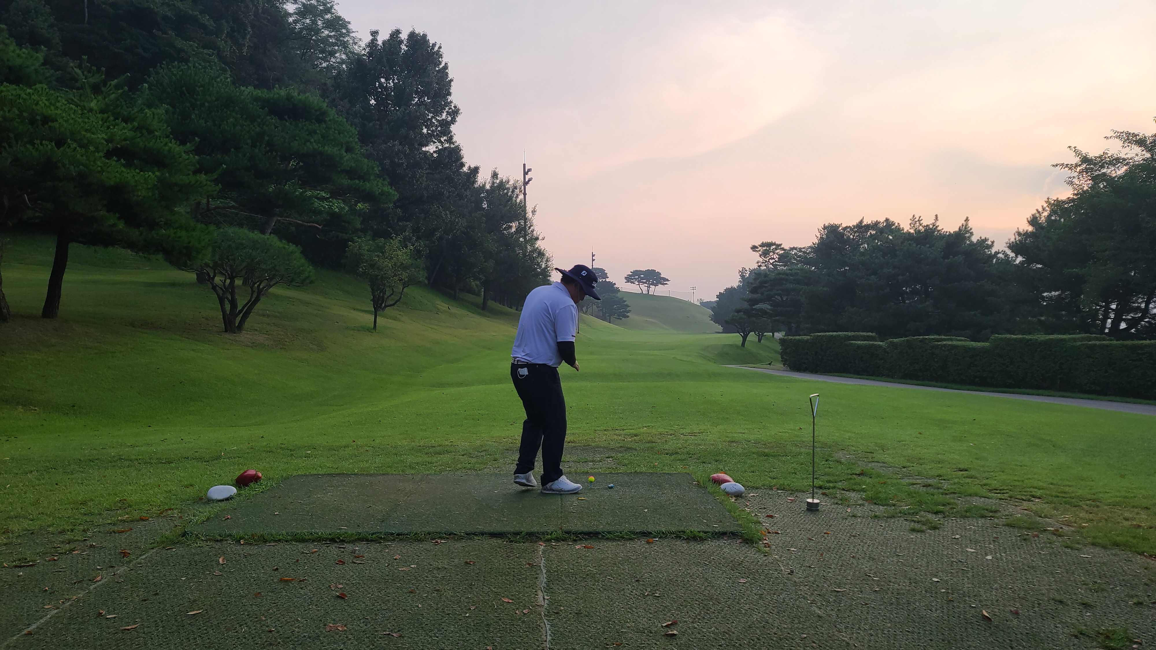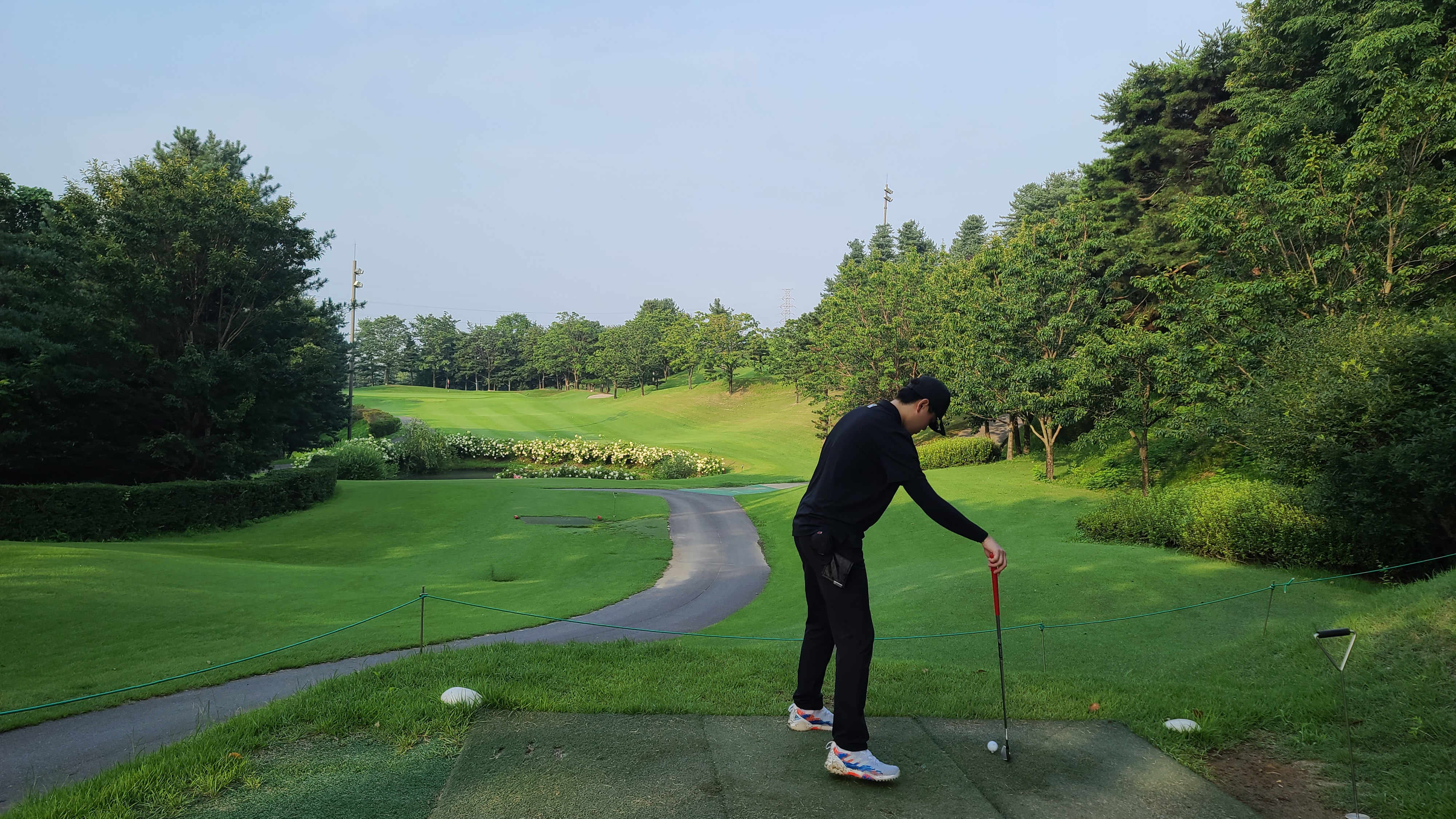 맛있게 식사를 하고 후반전을 시작합니다. 같은 코스의 반복이니 어디로 티샷을 날릴지 더욱 명확해집니다. 자신감있는 스윙으로 260m를 보내는 모습입니다. 9홀은 지루하게 느껴질 수도 있지만 연습을 하기에 최고의 장소일 수도 있습니다.