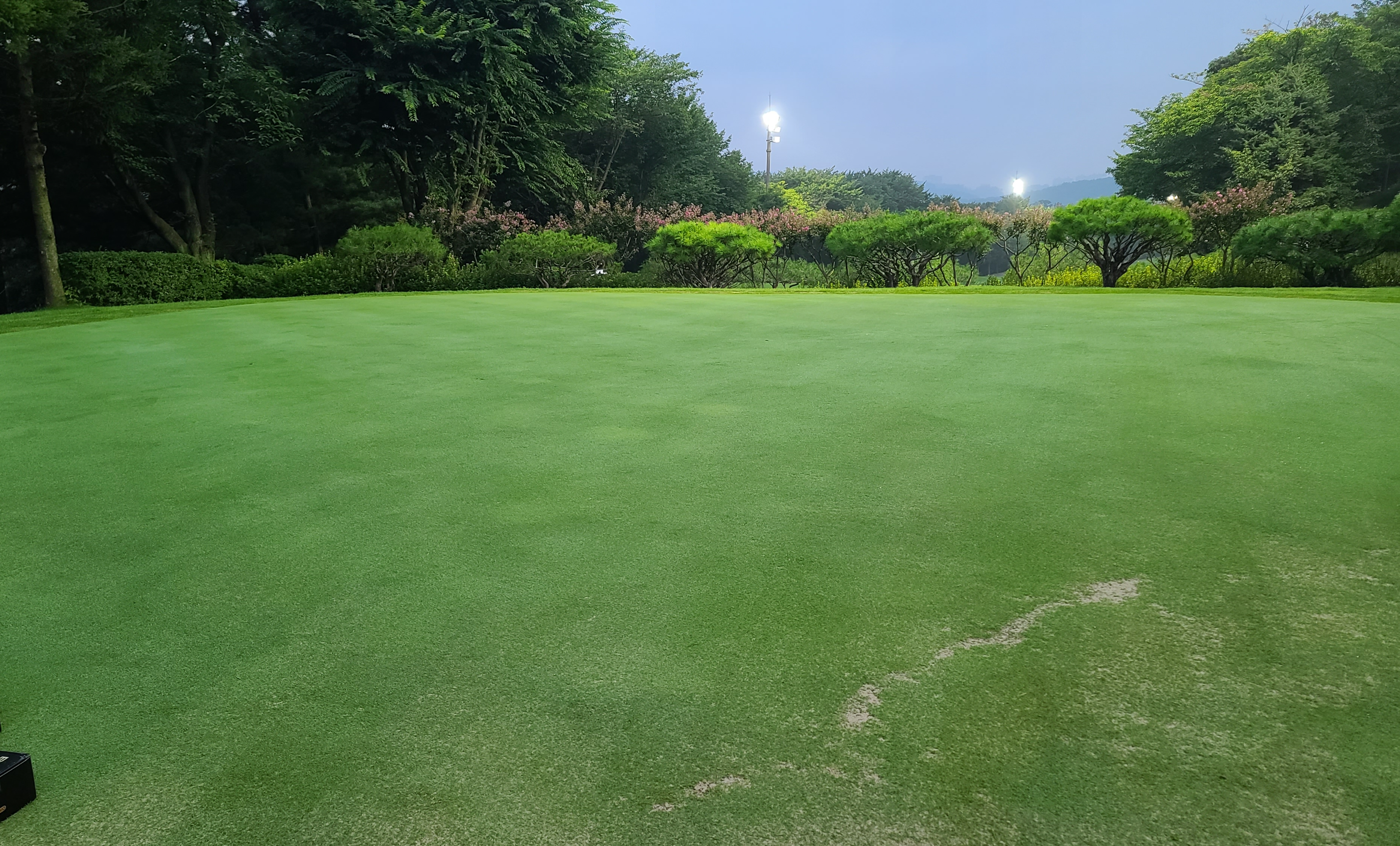 홀컵주변 그린과 페어웨이의 잔디상태를 살펴봅니다. 조금 패인곳이 있지만 비교적 잘 관리되어 있는 모습이 인상적이며 연습을 한다는 목적으로 치기에 매우 좋은 컨디션을 보여주고 있습니다.