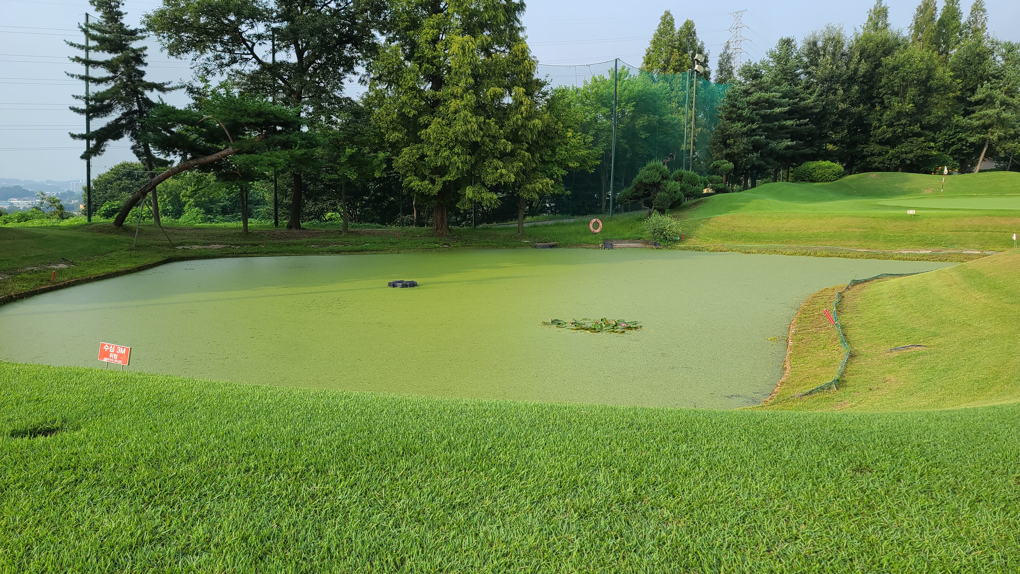티샷후 세컨지점에서 그린까지 잘 보이지 않지만 왼쪽으로 워터해저드가 자리잡고 있으므로 마지막까지 집중력을 잃지않고 마무리하는 것이 중요합니다.