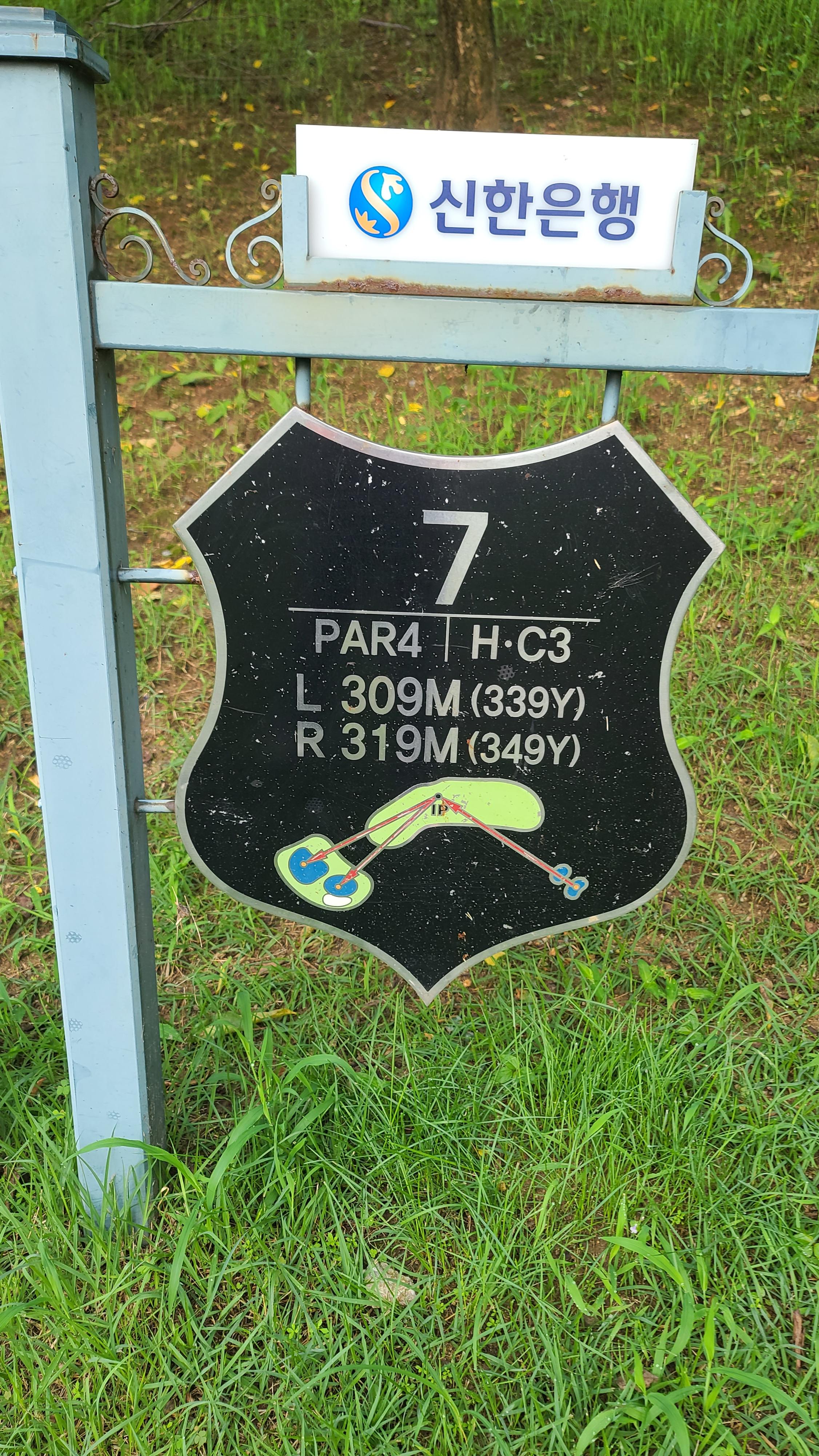 7번홀은 319m 거리의 좌측으로 완전히 꺾어진 파4홀입니다. 완전히 ㄱ자로 꺽여있기 때문에 한번에 쏘는것도 가능하지만 높은 나무로 가로막혀져 있기 때문에 정면으로 안정적으로 티샷하는것이 유리합니다.