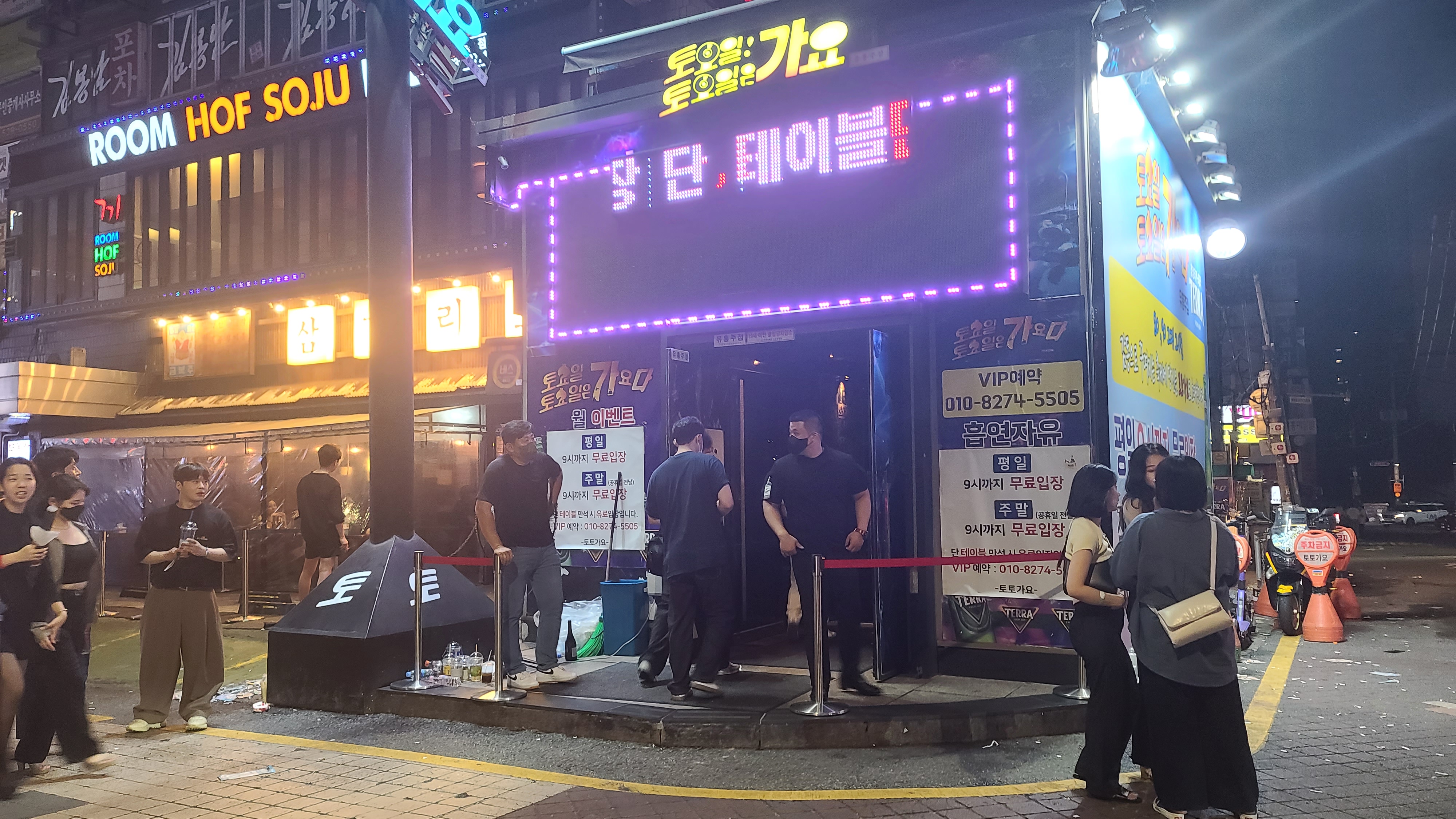 토토가요 입구의 모습입니다. 핫플레이스인 만큼 피크시간대에는 사람들이 줄을 서있고 입구에서 기도분이 철저한 신분증 검사 후 들여보내는 모습입니다. 주민증과 운전면허증, 여권 등 공식적인 신분증만 검사를 하며 학생증, 회원증 등 다른신분증은 통하지 않으니 꼭 신분증을 챙겨가야합니다.