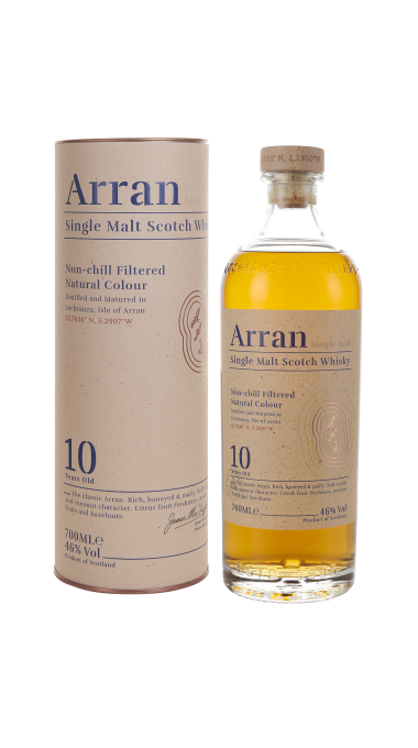 아란 싱글몰트 위스키 라인업의 가장 기본제품인 10년 숙성 제품으로 2019년 IWSC 및 WWA(World Whiskies Awards)에서 골드메달을 획득하여 유명해진 제품입니다. 버번캐스크와 셰리캐스크를 이용하여 위스키 원액을 숙성시켜, 바닐라와 풍부한 과일향으로 매우 달콤한 느낌의 위스키 제품으로 옆지방 캠블튼이나 아일라 지역의 피트나 스모키함과는 정반대의 특성을 보여주는 것이 특징입니다.
