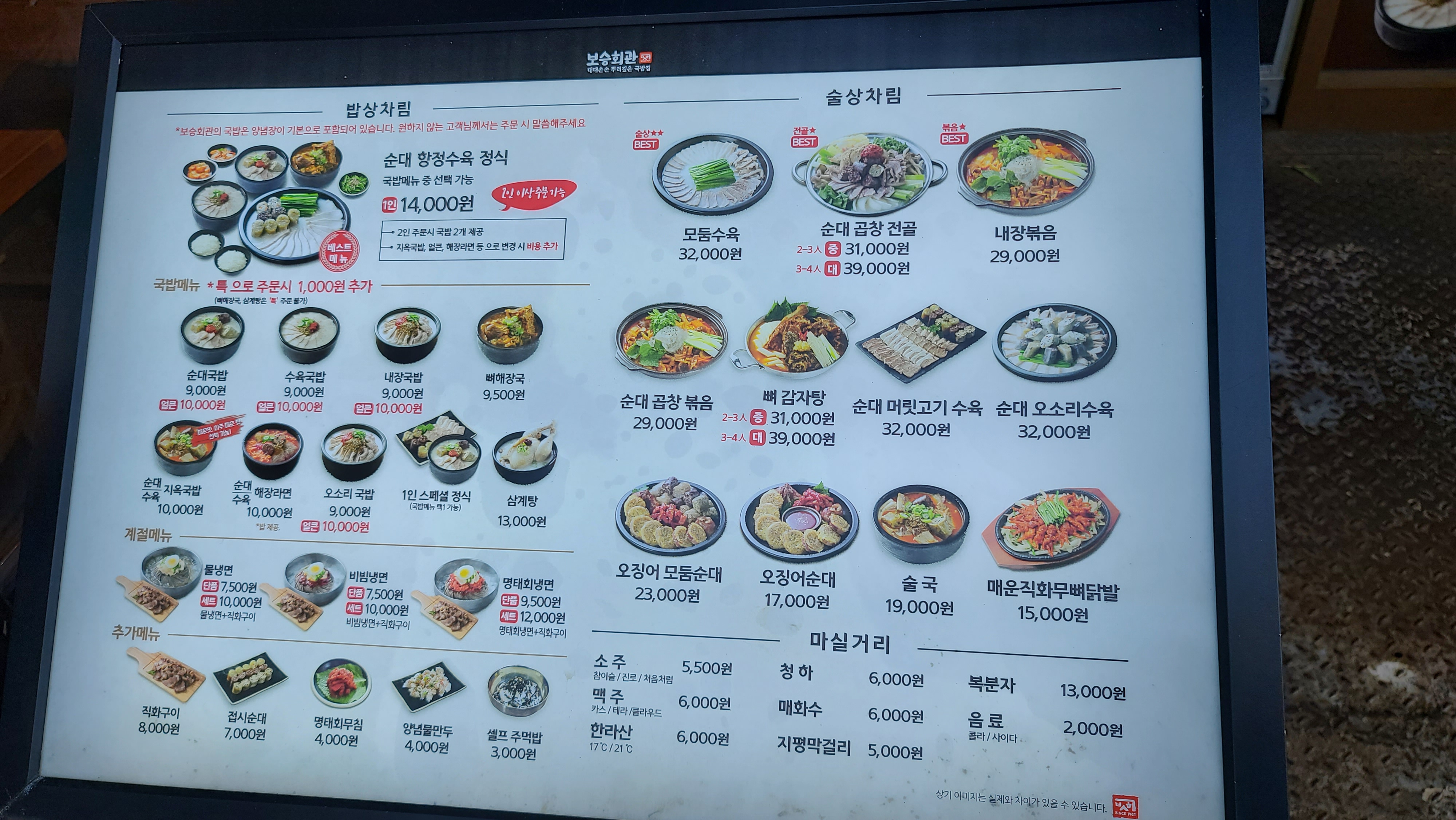메뉴판을 살펴봅니다. 순대국밥, 수육국밥, 내장국밥, 뼈해장국 등 다양한 국밥종류가 눈에 들어오고 수육, 오소리, 오징어순대 등 다양한 부속 메뉴도 보입니다.