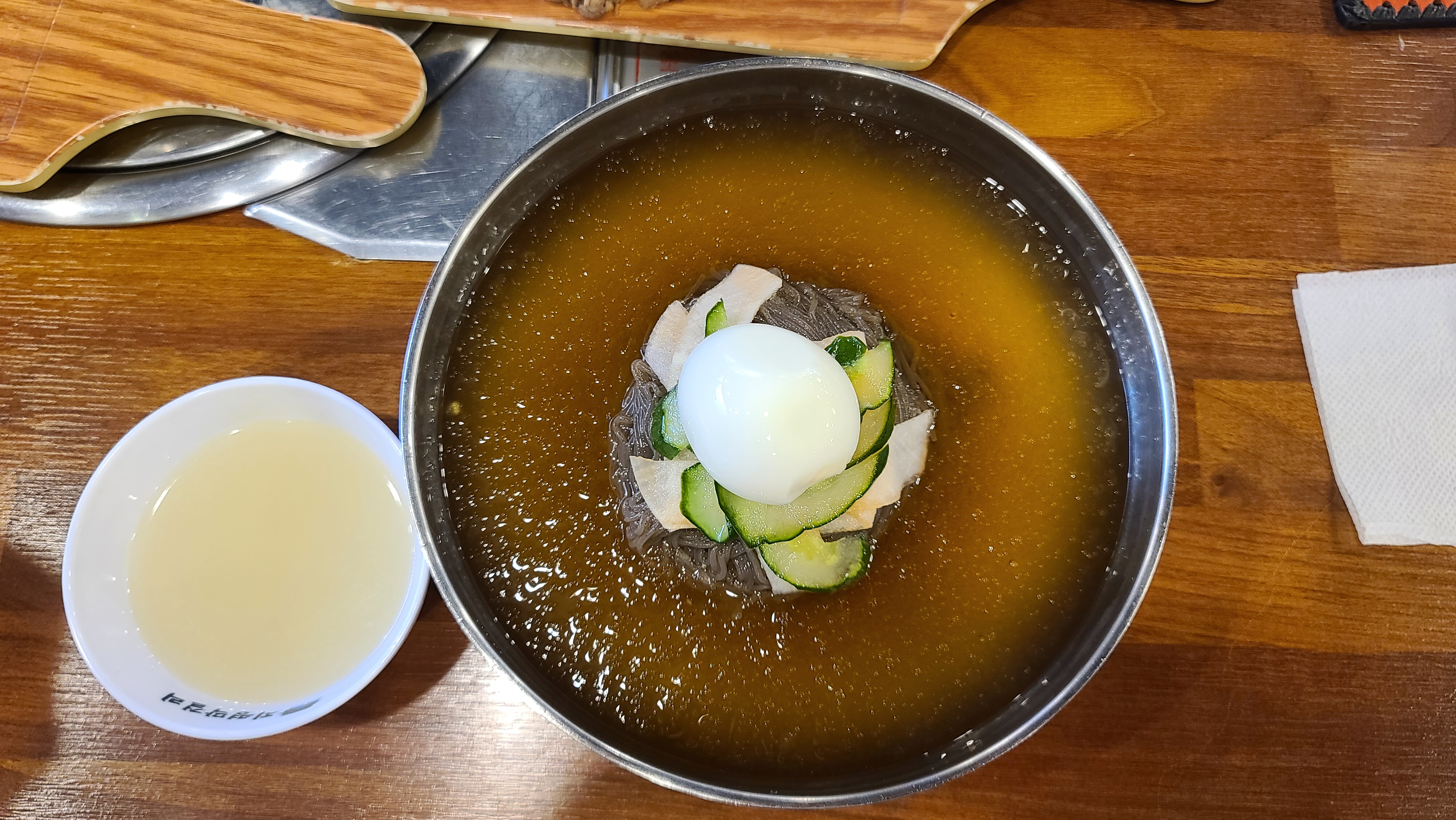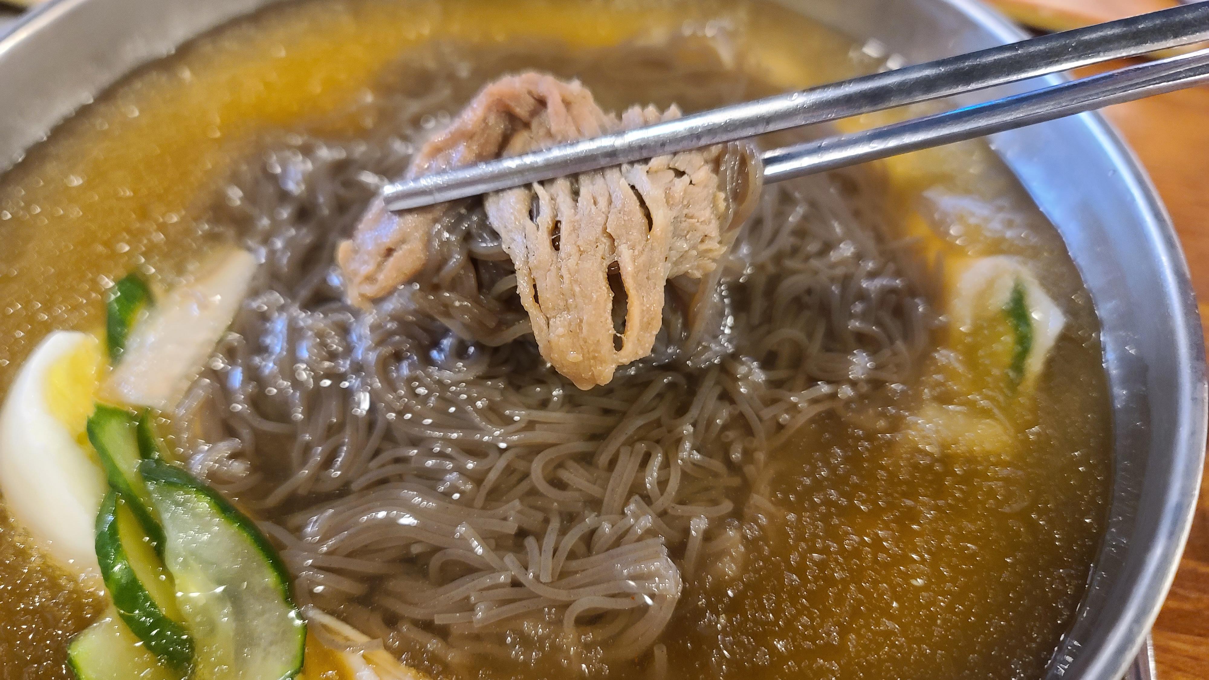 잠시 기다리자 주문한 물냉면이 나옵니다. 살얼음이 가득 떠있는 보기만 해도 시원해지는 비주얼의 물냉면입니다. 별도의 다대기는 없으며 맑은 육수가 흡사 평양냉면을 연상케도 하지만 육수맛을 보니 조미료의 감칠맛이 듬뿍 느껴지는 맛있는 냉면육수의 맛이 나고있습니다.