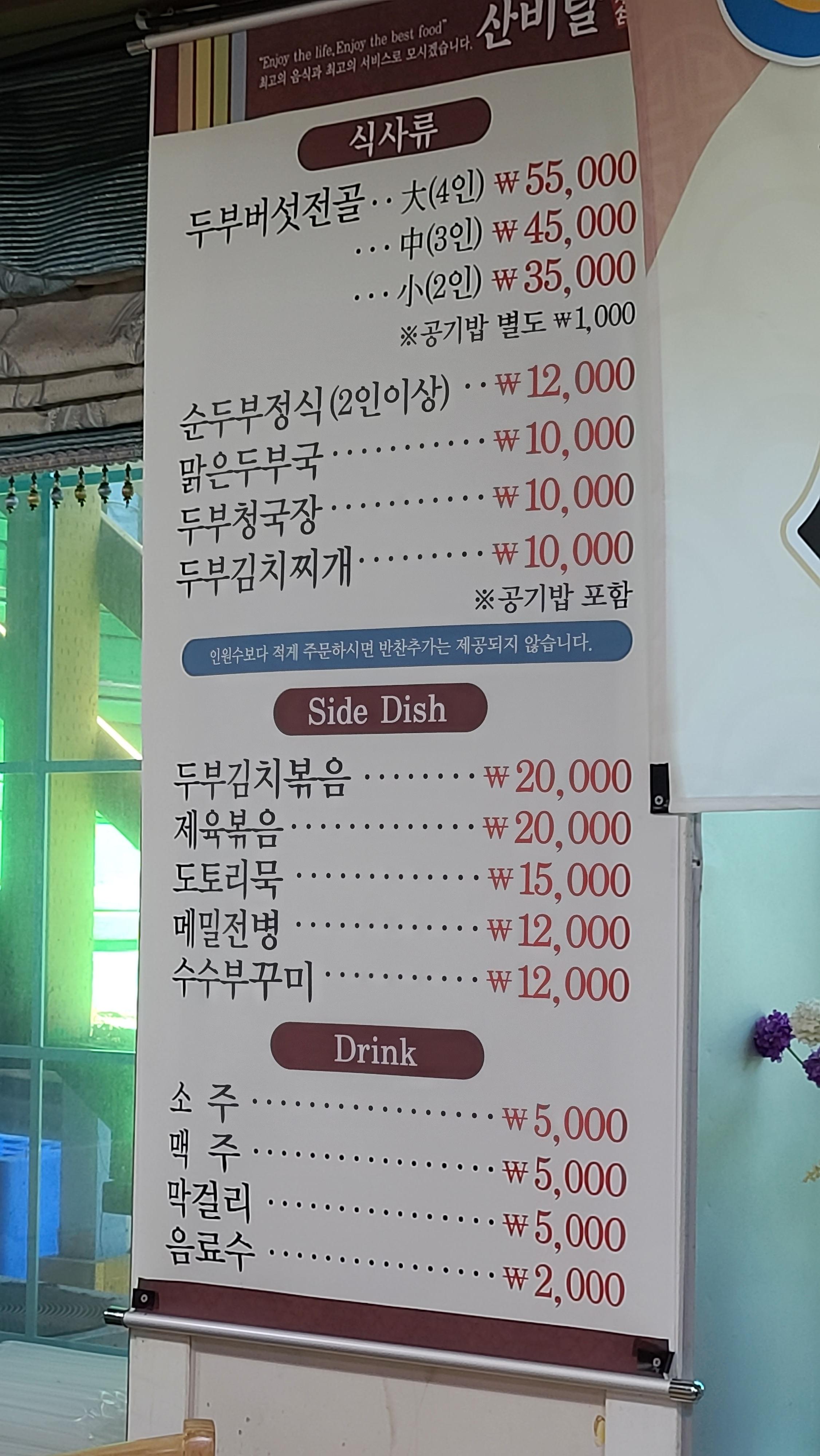 자리를 잡고 메뉴판을 살펴봅니다. 두부버섯전골이 메인메뉴이고 순두부, 청국장, 두부 김치찌개 등 두부 전문점의 메뉴답게 두부가 주류를 이루고 다양한 사이드 메뉴가 보입니다. 두부는 콩으로 만드는법 요리솜씨를 보기위해 청국장을 주문해봅니다.