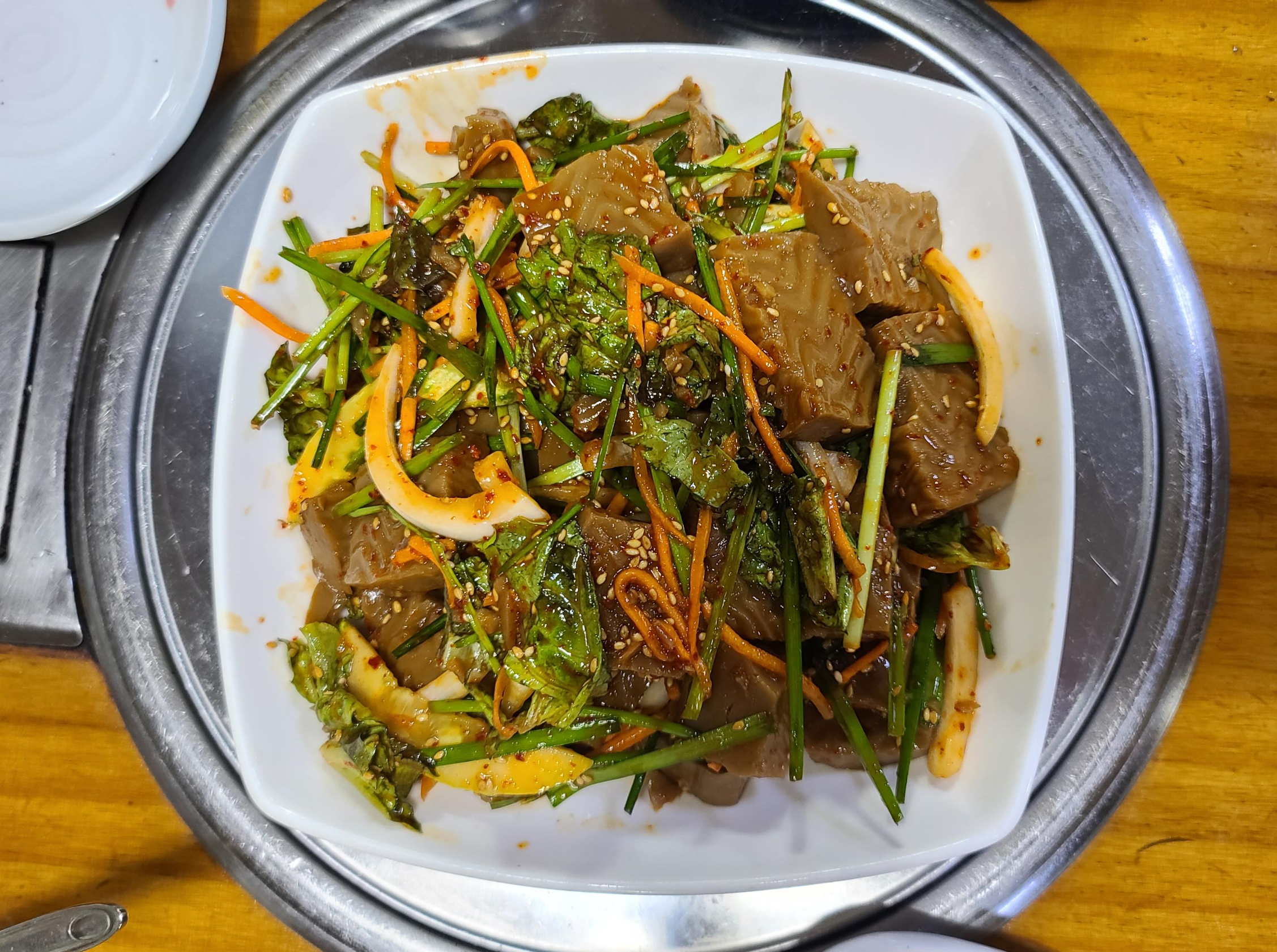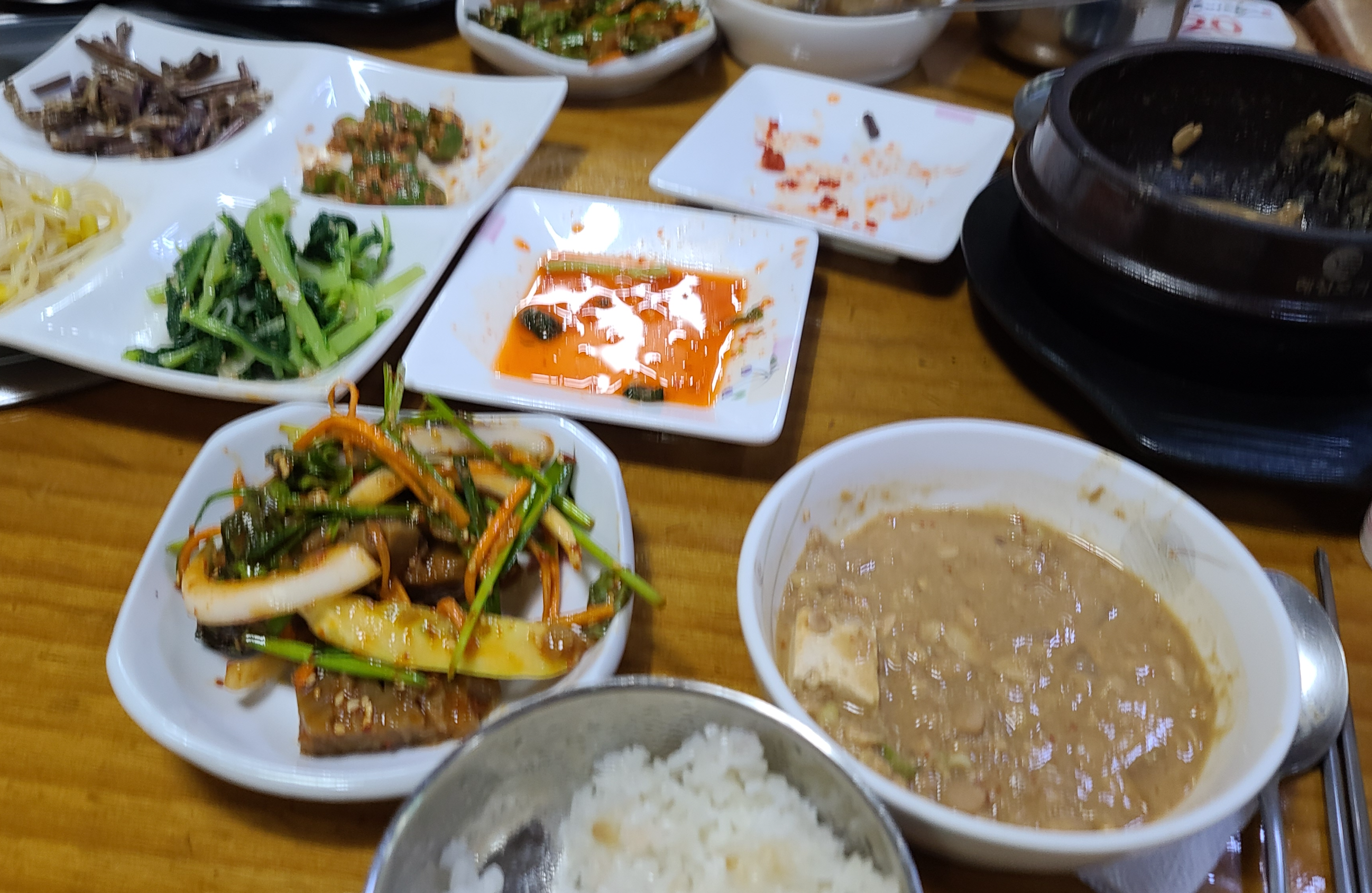 추가로 주문한 도토리묵도 나와서 청국장과 갖가지 반찬 그리고 도토리묵을 조합해서 식사를 합니다. 청국장의 건강한 발효맛과 여러나물반찬의 고소함 그리고 도토리묵 무침의 새콤달콤한 맛이 조화를 이루어 식욕이 폭발 반찬을 리필해 가며 밥상을 비우게 됩니다.