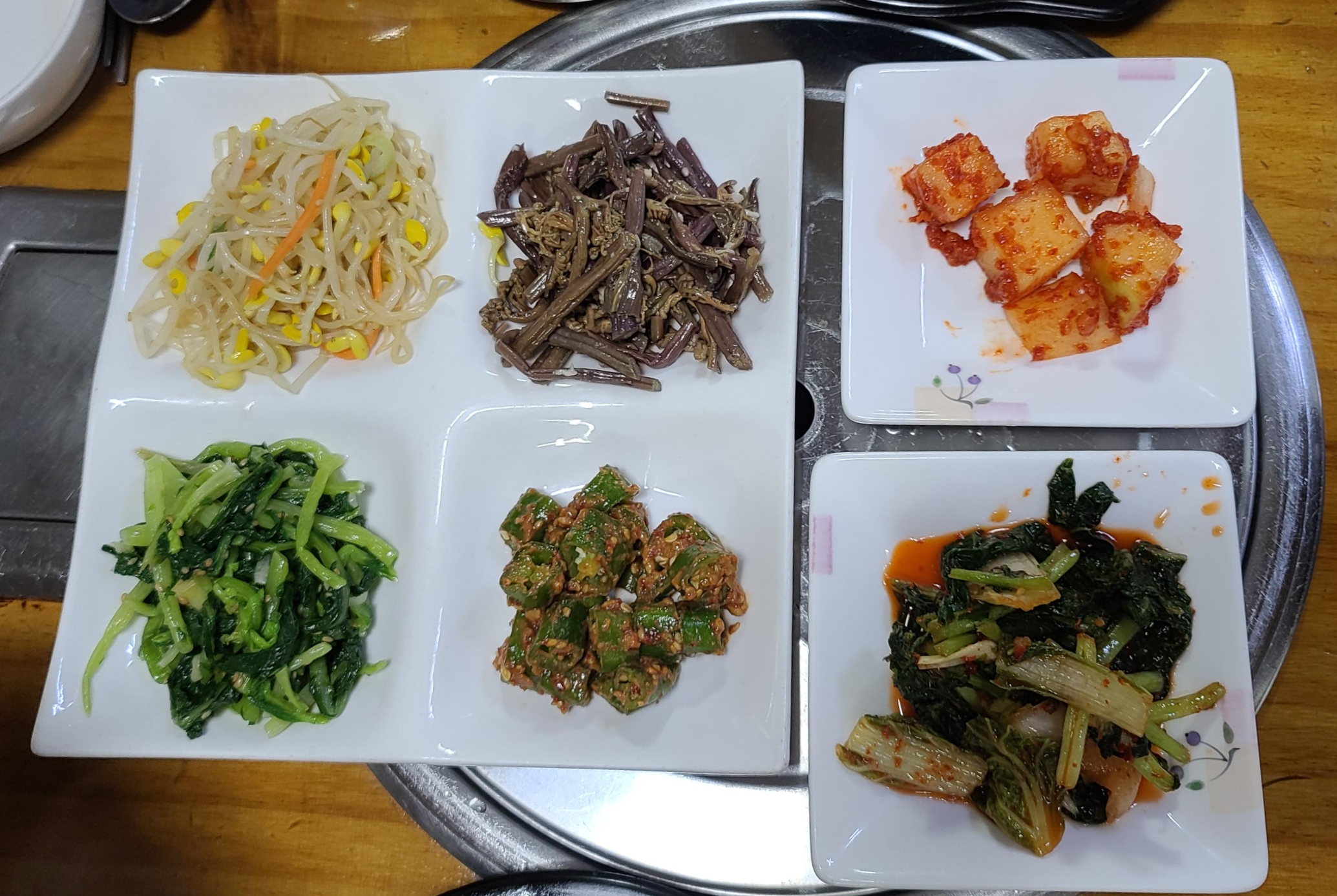 주문한 청국장과 반찬이 나왔습니다. 콩나물, 고사리, 깍두기, 고추, 열무 등 비빔밥을 해서 먹어도 좋을 반찬들과 구수한 청국장의 향기가 매우 조화롭게 느껴집니다. 청국장의 맛을보니 잘 발효된 콩에서 느껴지는 건강한 맛이 식욕을 돋우고 있습니다.