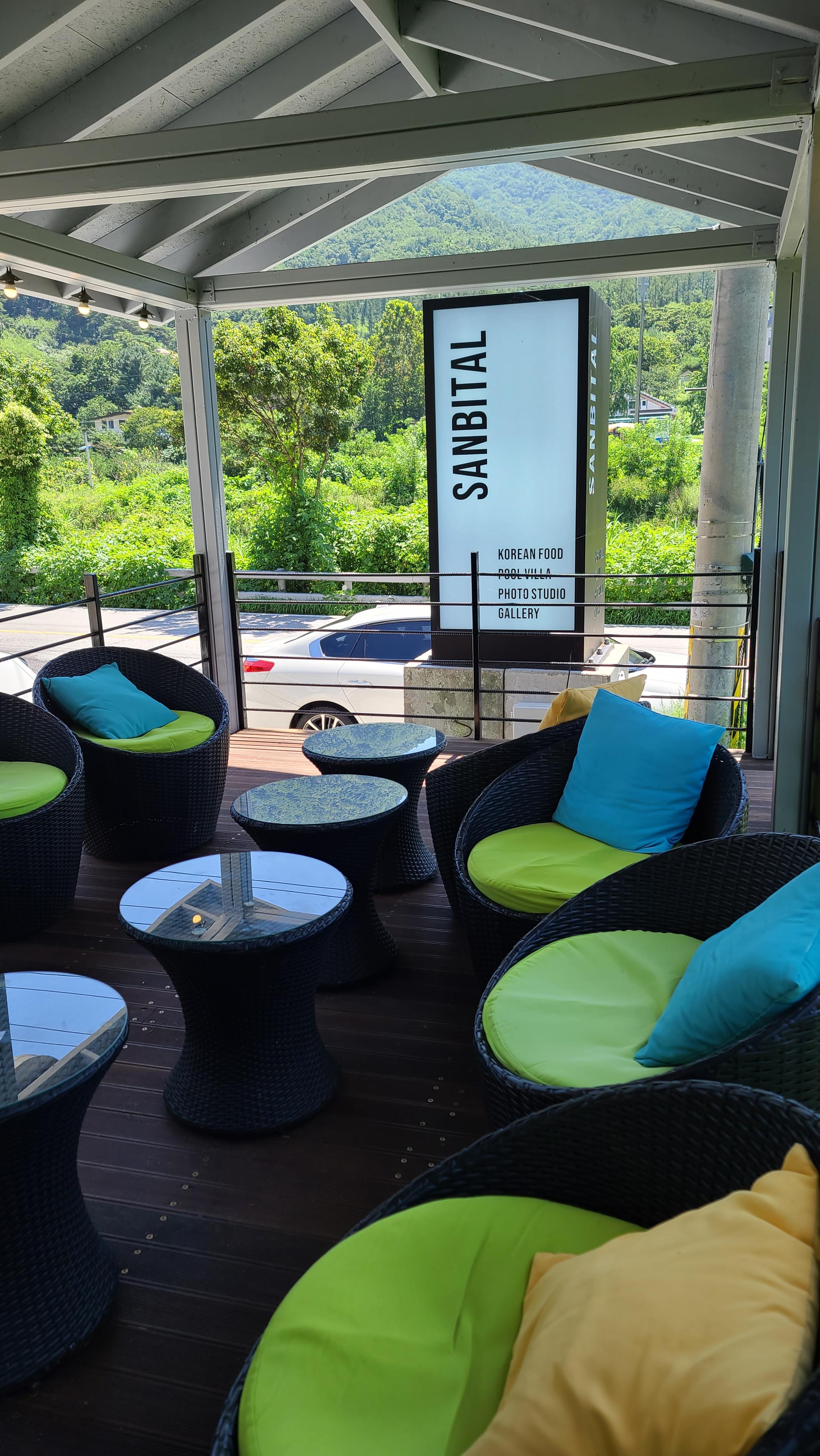 밖으로 나오면 커피를 마시며 휴식을 취할 수 있는 편안한 공간이 마련되어 있습니다. 세련된 소파에 산비탈 간판을 고유명사 영어로 표기해 세워놓으니 더욱 트렌디해보이는 느낌입니다.