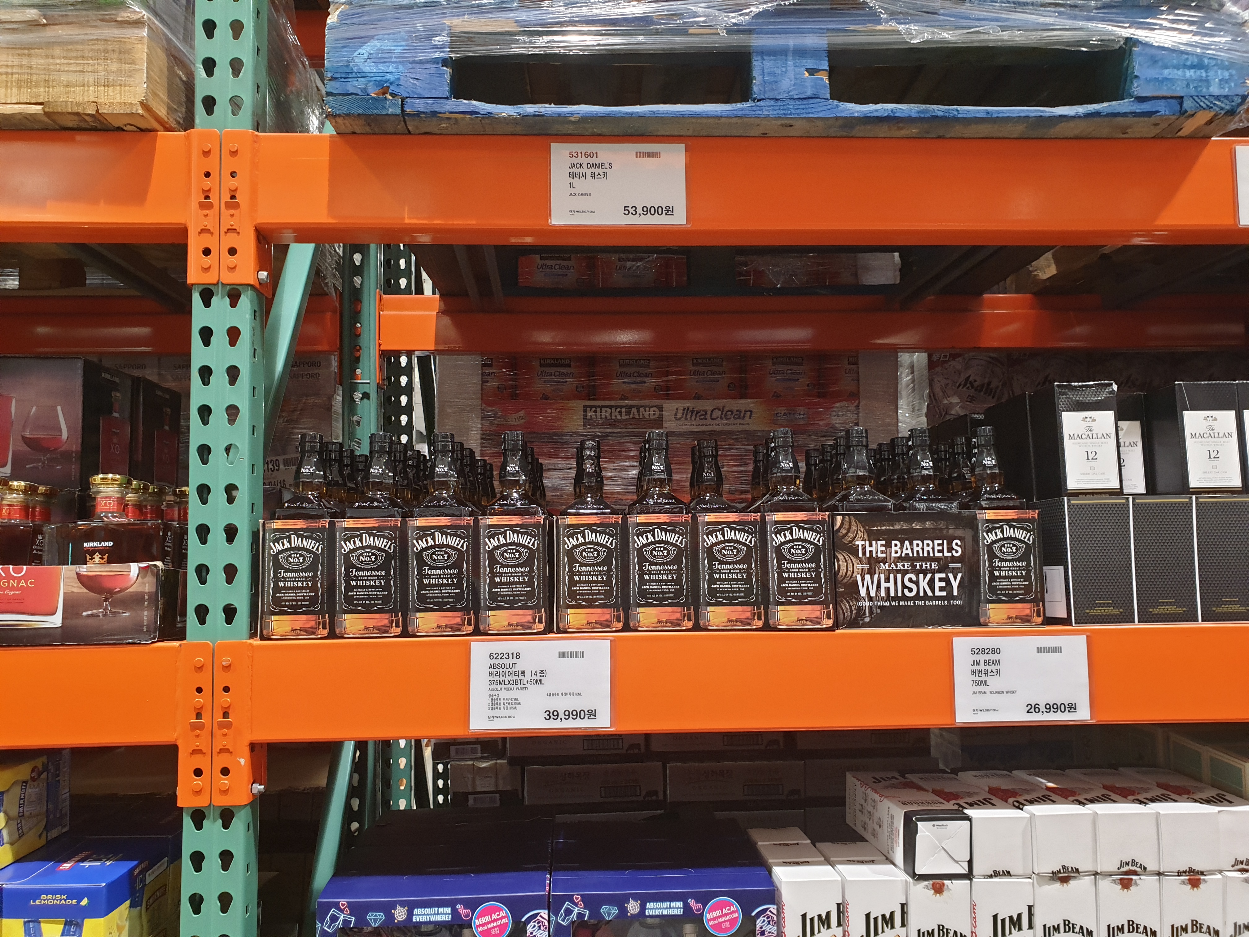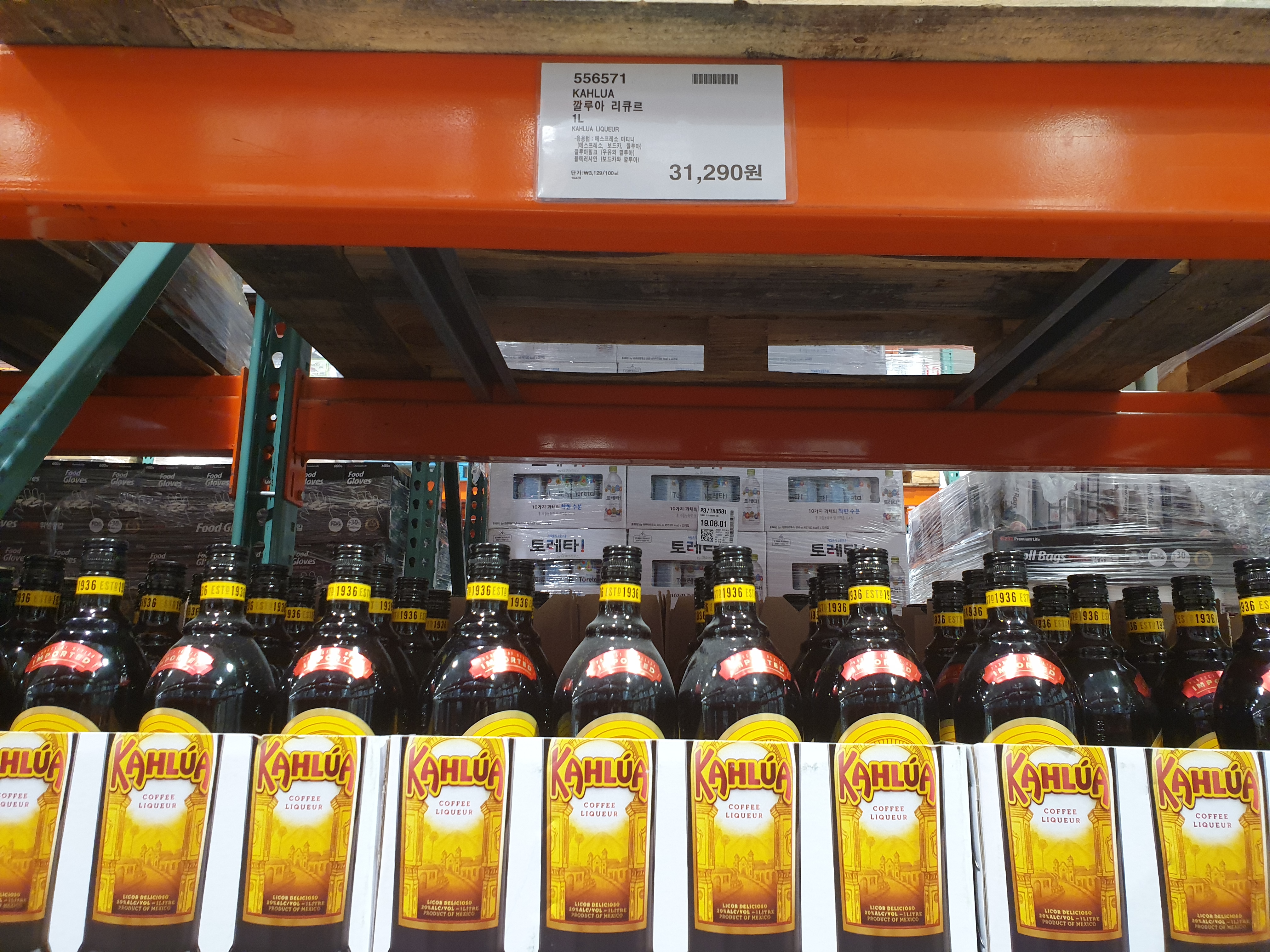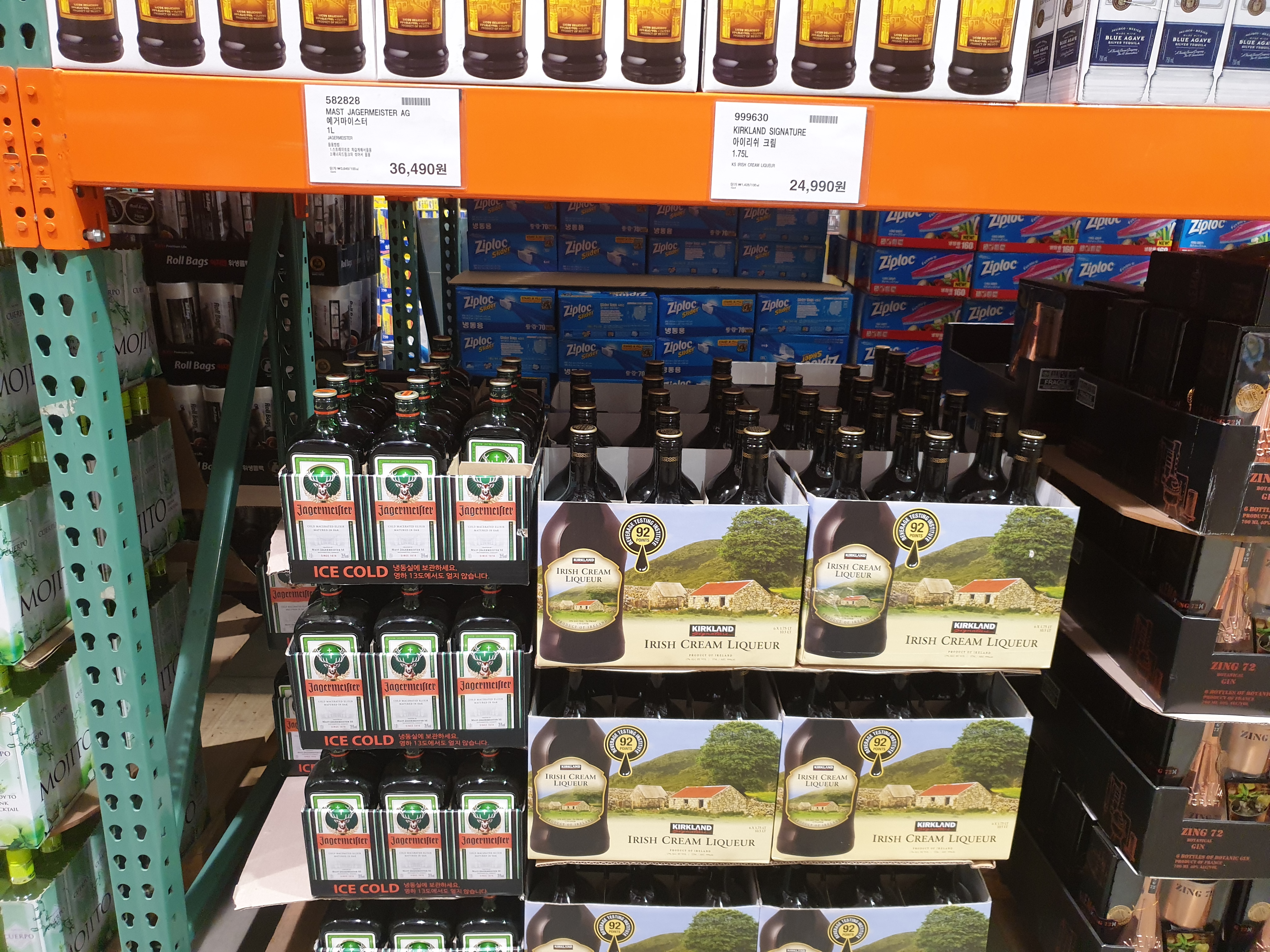 코스트코상표인 커클랜드 아이리시 크림과 독일의 전통 리큐르 예거마이스터가 진열되어 있습니다