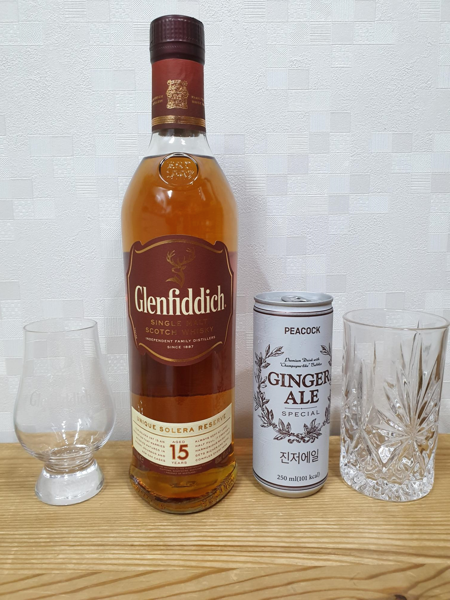 즐겁게 귀가하여 구매한 술을 시음해봅니다. 위스키의 향을 그대로 즐길수 있도록 클랜캐런잔을 하이볼로 음료처럼 즐길수 있도록 진저에일을 준비합니다.