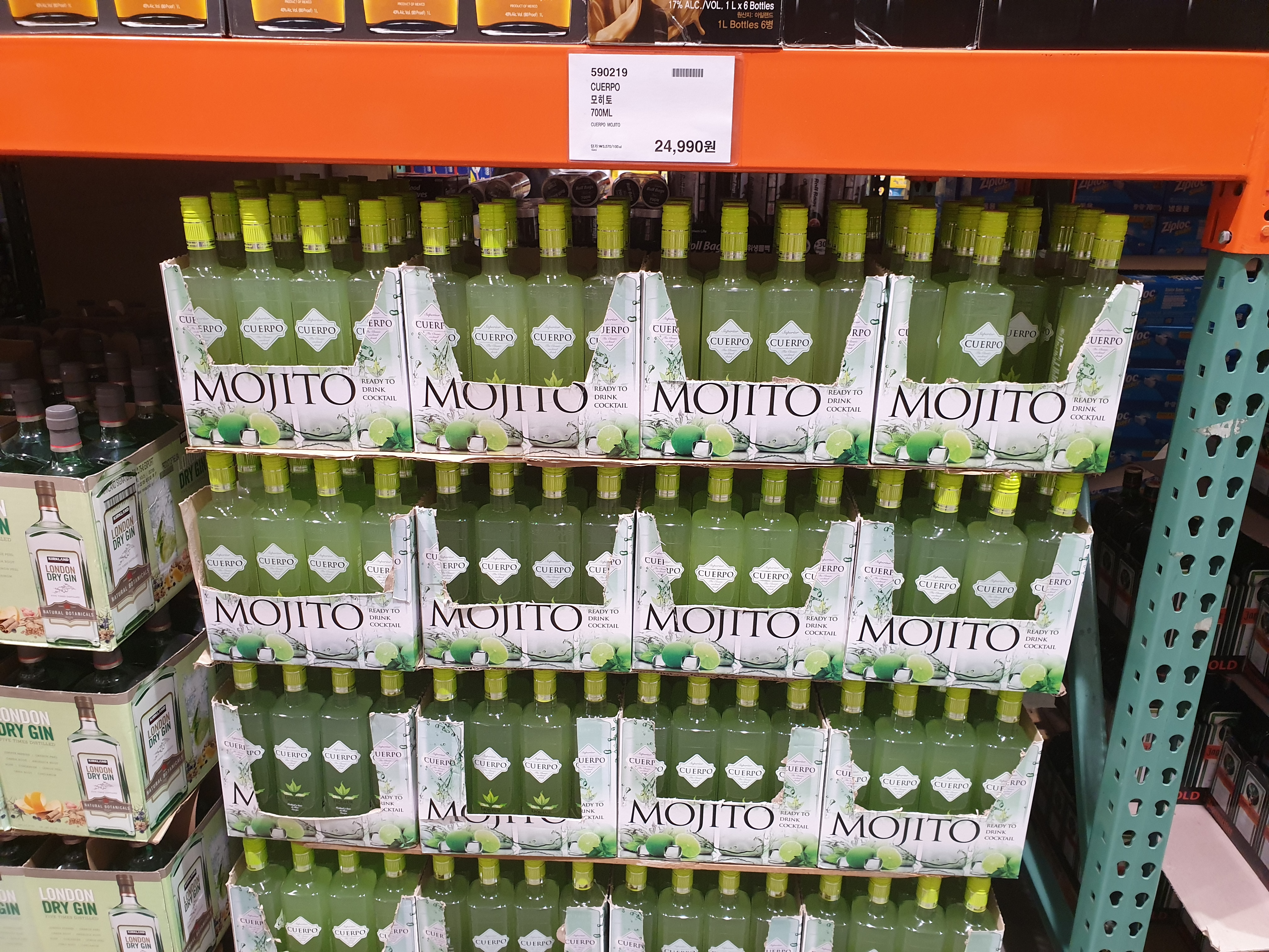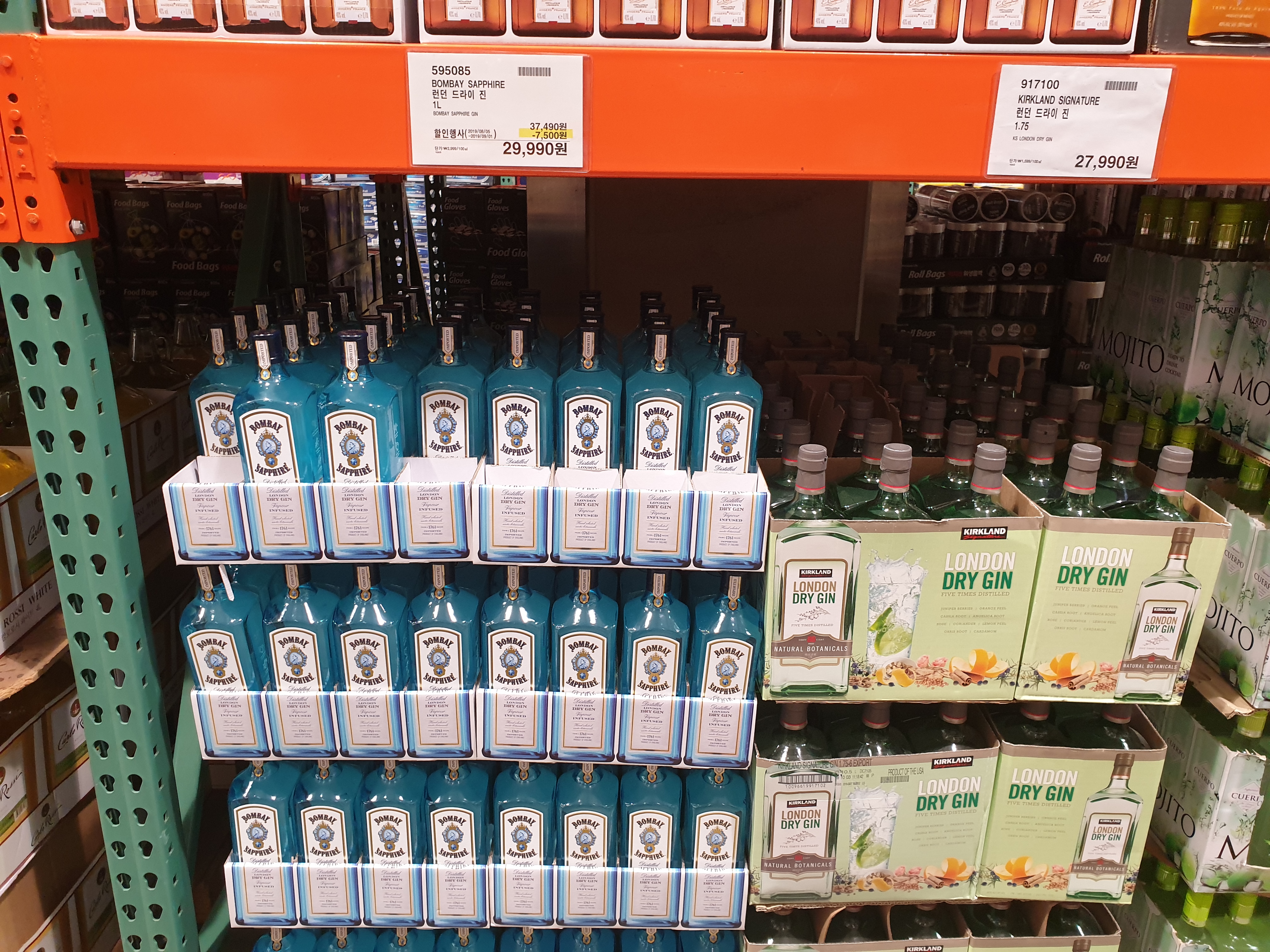 런던드라이진 시리즈가 진열되어 있습니다. 가장 유명한 봄베이사파이어와 코스트코상표인 커클랜드 시그니처 런던드라이 진이 보입니다. 진은 앞서 보았듯이 약용주와 같이 주니퍼베리등의 추출물이 가미되어 향이 강합니다만 이것이 영국에 건너가 상대적으로 향이 약해지고 단맛이 없어지며 맛이 드라이하게 변해버린것이죠. 가장 유명한 런던드라이진인 봄베이사파이어는 투명한 푸른색 디자인의 병으로 매우 유명합니다.
