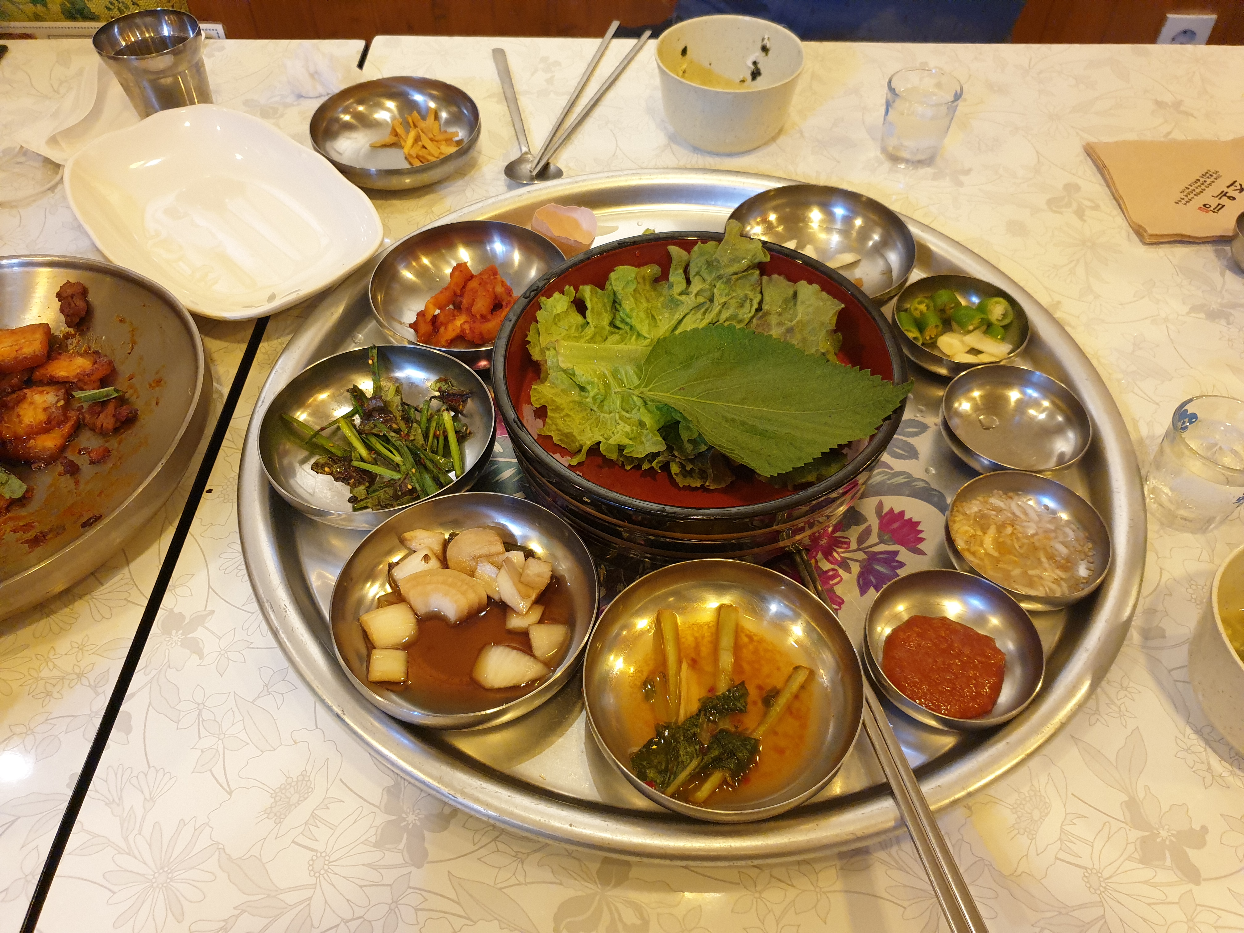 기본반찬들을 다시 리필하고 불보쌈을 즐겨봅니다. 불보쌈 중간중간 먹는 고깃국물이 아주 일품입니다.