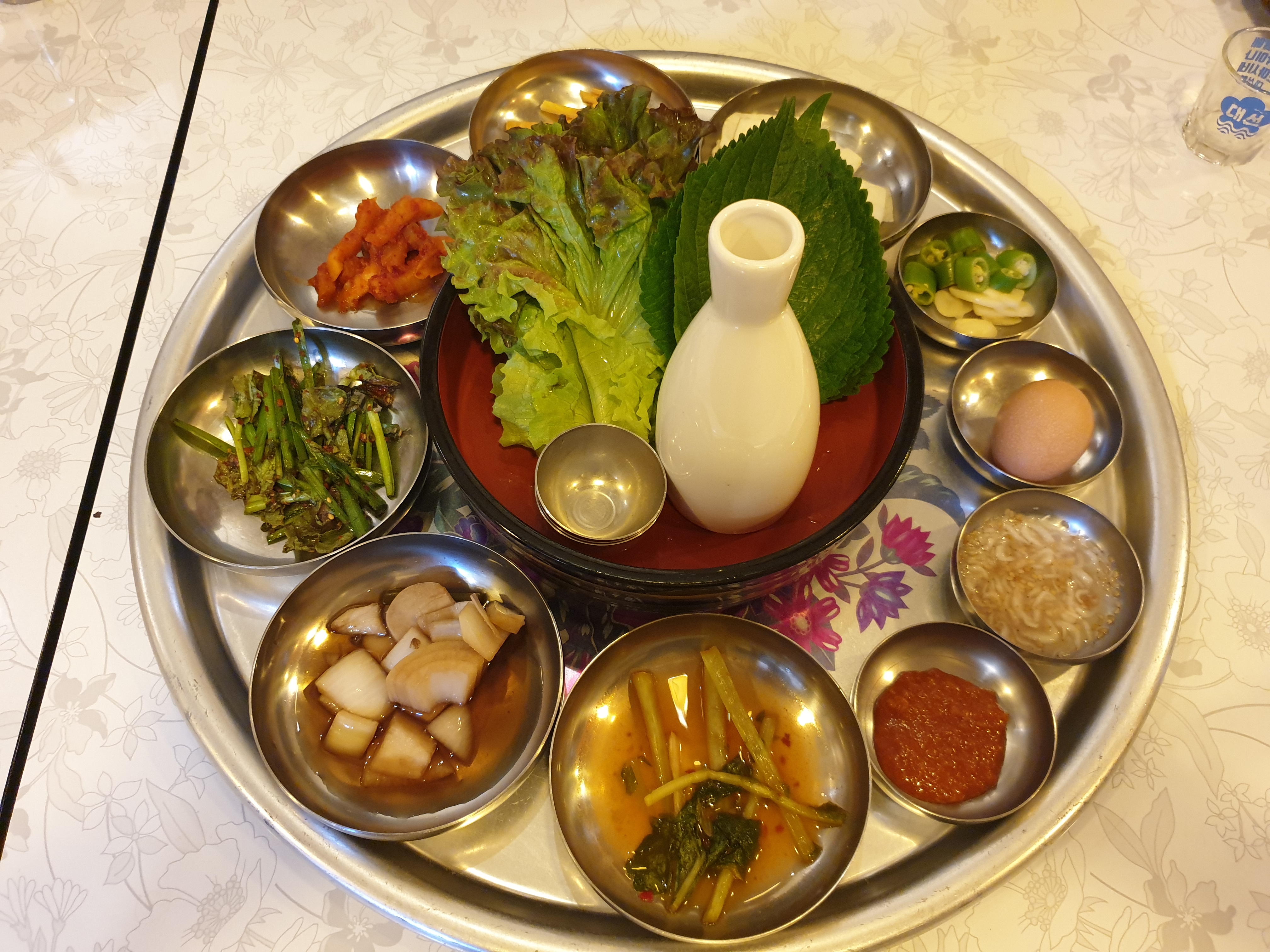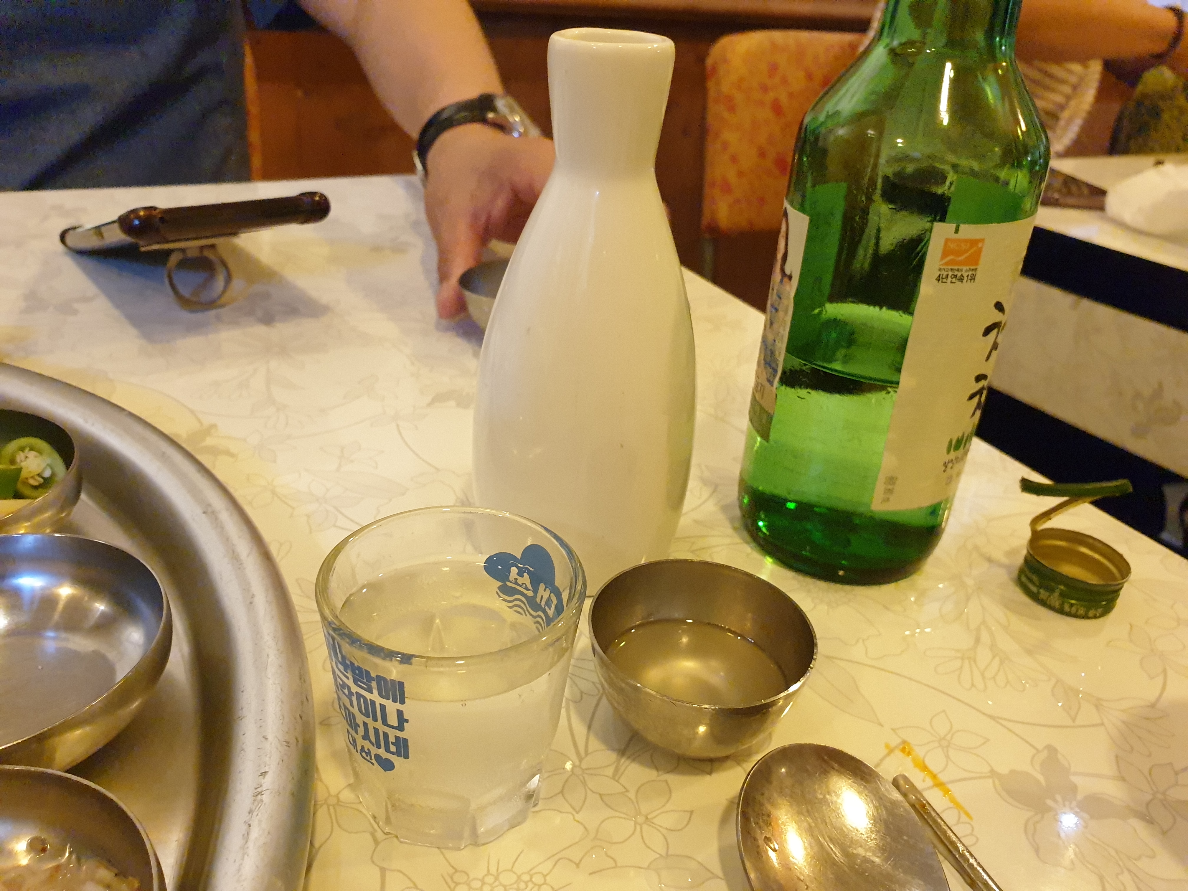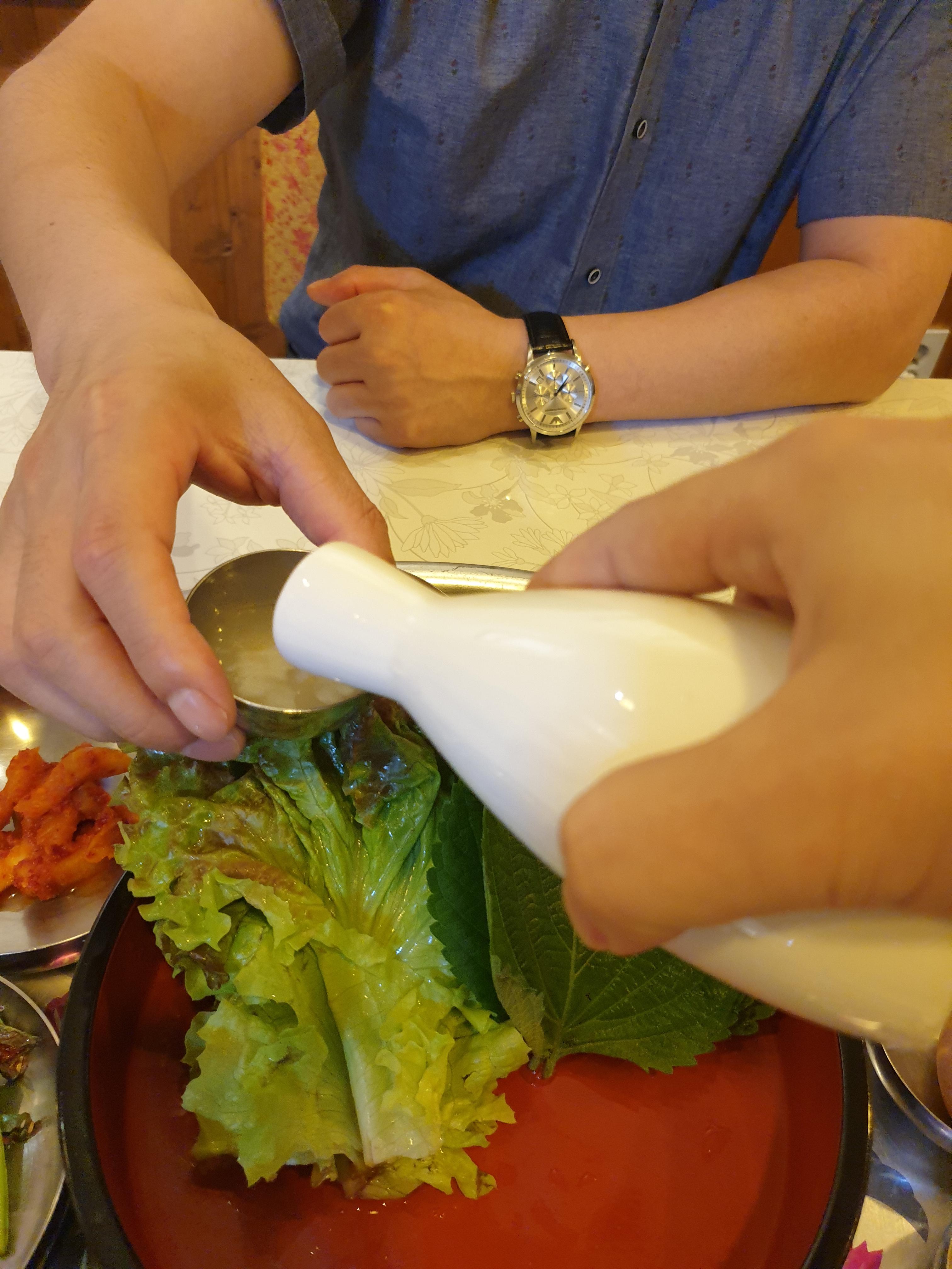 불보쌈을 주문하고 기다리니 여러 사이드 메뉴와 조그마한 술한병이 나옵니다. 조그마한 호리병에 담겨있는 술은 서비스로서 조옥주라고 불립니다.