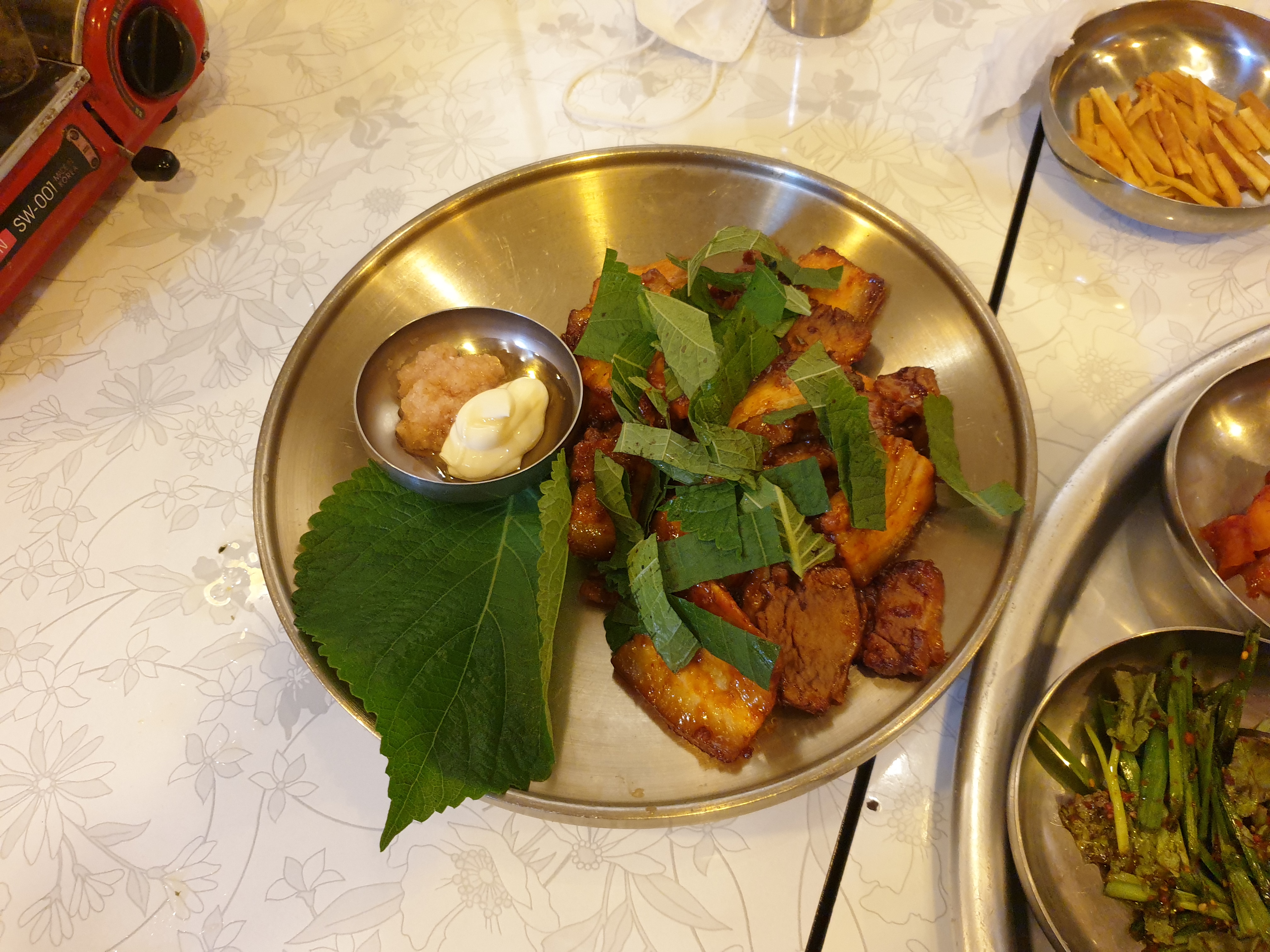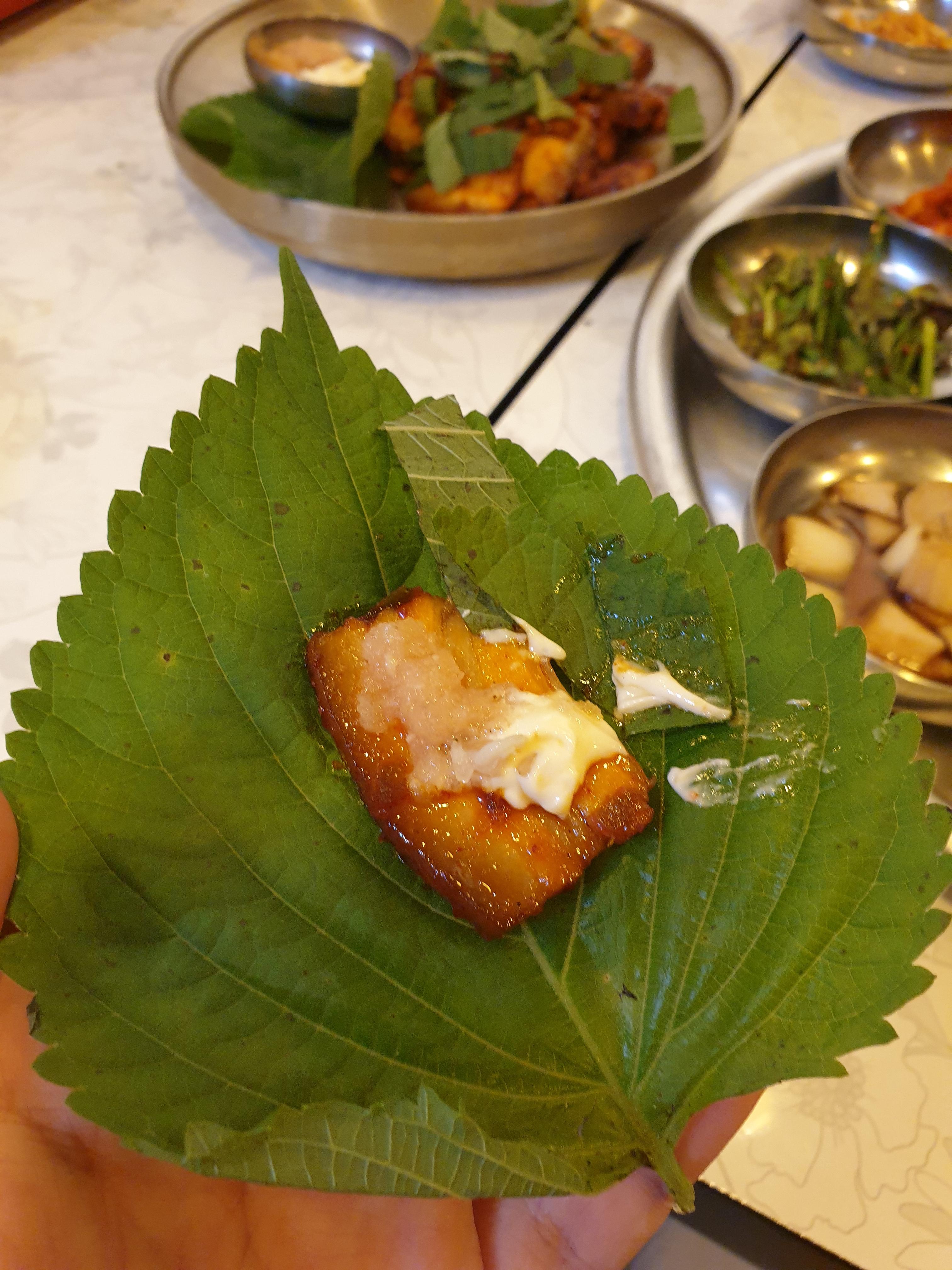 깻잎과 상추에 명란마요 소스를 얹어 맛을 봅니다. 각각의 맛이 있지만 깻잎의 고소함이 불보쌈과 어울려서 더욱 고소한맛이 강조됩니다. 쭈꾸미에 왜 깻잎을 싸먹는지 알것 같습니다.