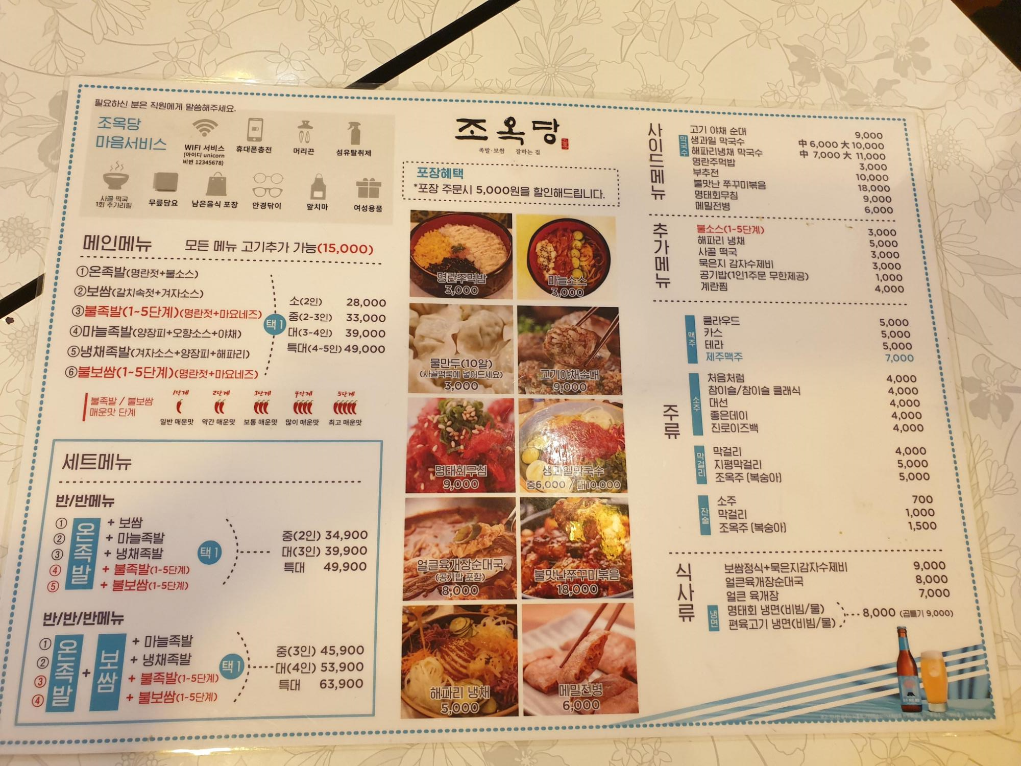 들어가서 메뉴판을 봅니다. 족발과 보쌈을 반반스타일로 매운맛으로 마늘,냉채등 다양한 조합으로 시킬수가 있으며 명란, 물만두, 명태회무침, 쭈꾸미, 해파리, 메밀전병 등 다양한 사이드메뉴가 보입니다.