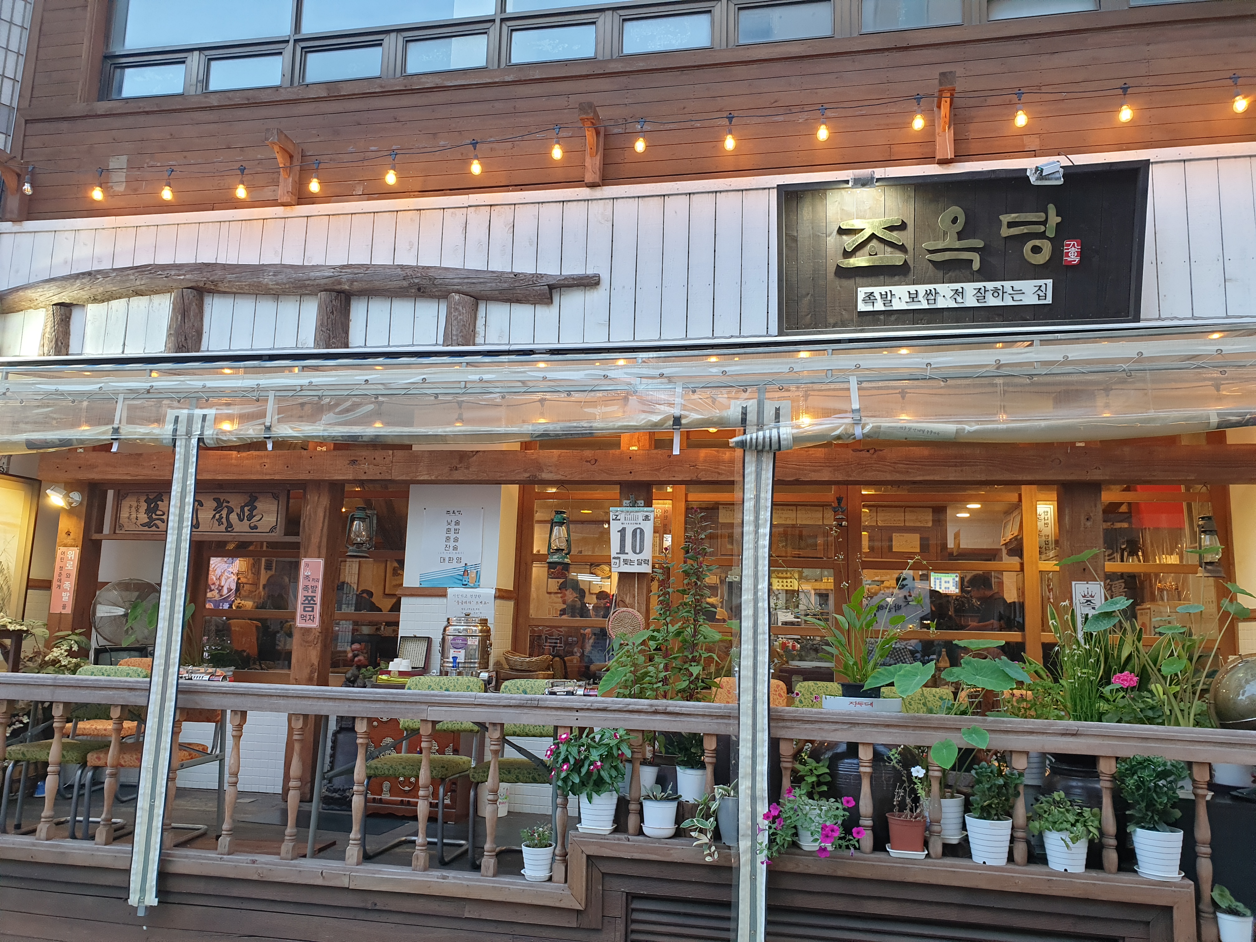 가게 외부 모습입니다. 발코니 같은 바깥에서도 식사가 가능하며 나무로 만든 가게에 여러화분을 놓아 토속적으로 꾸며놨습니다.