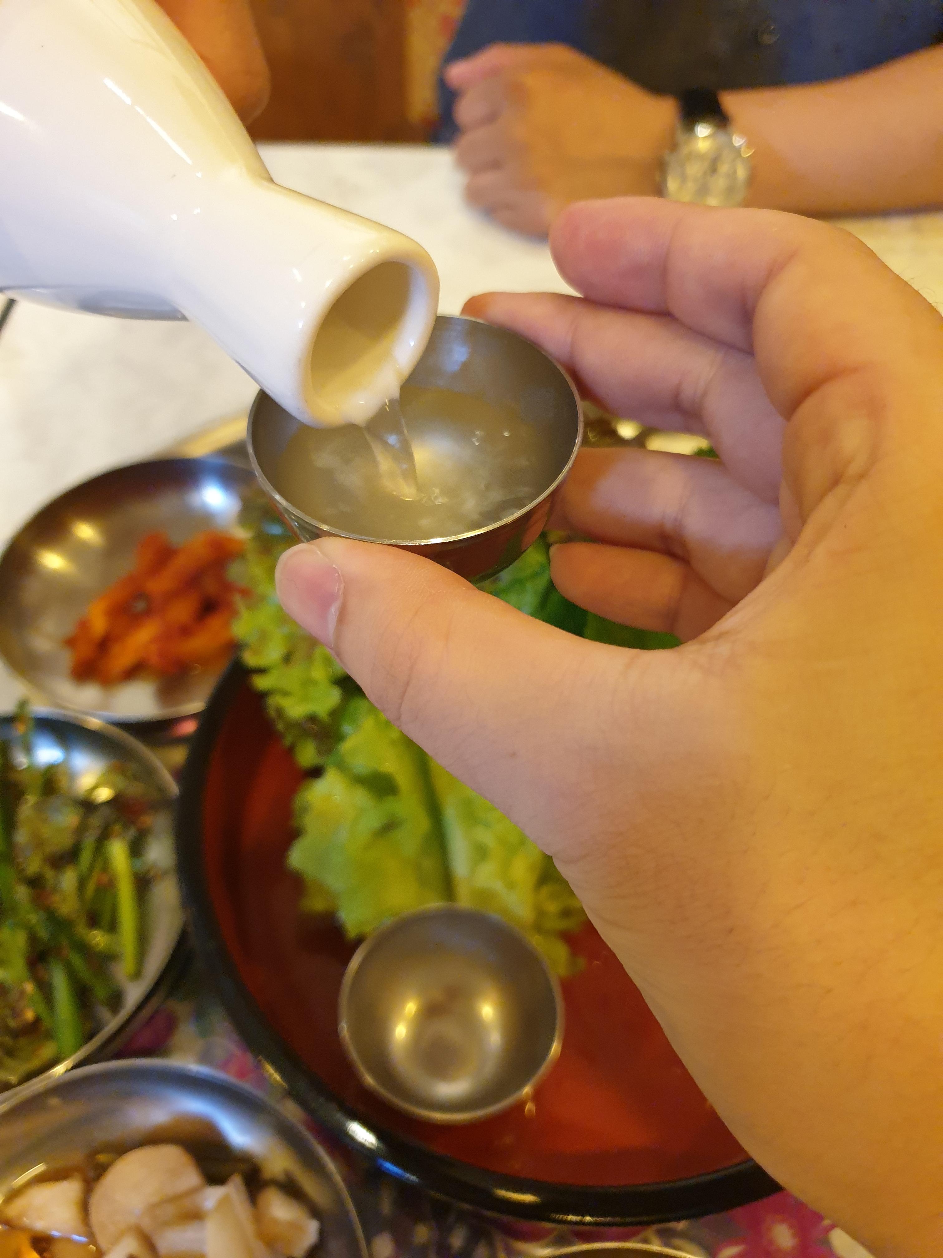 조옥주를 우선 사이좋게 한잔씩 따라마십니다. 조옥주는 복숭아향이 나는 술로서 전통적인 호리병에 따라마시니 무척이나 이채롭습니다.
