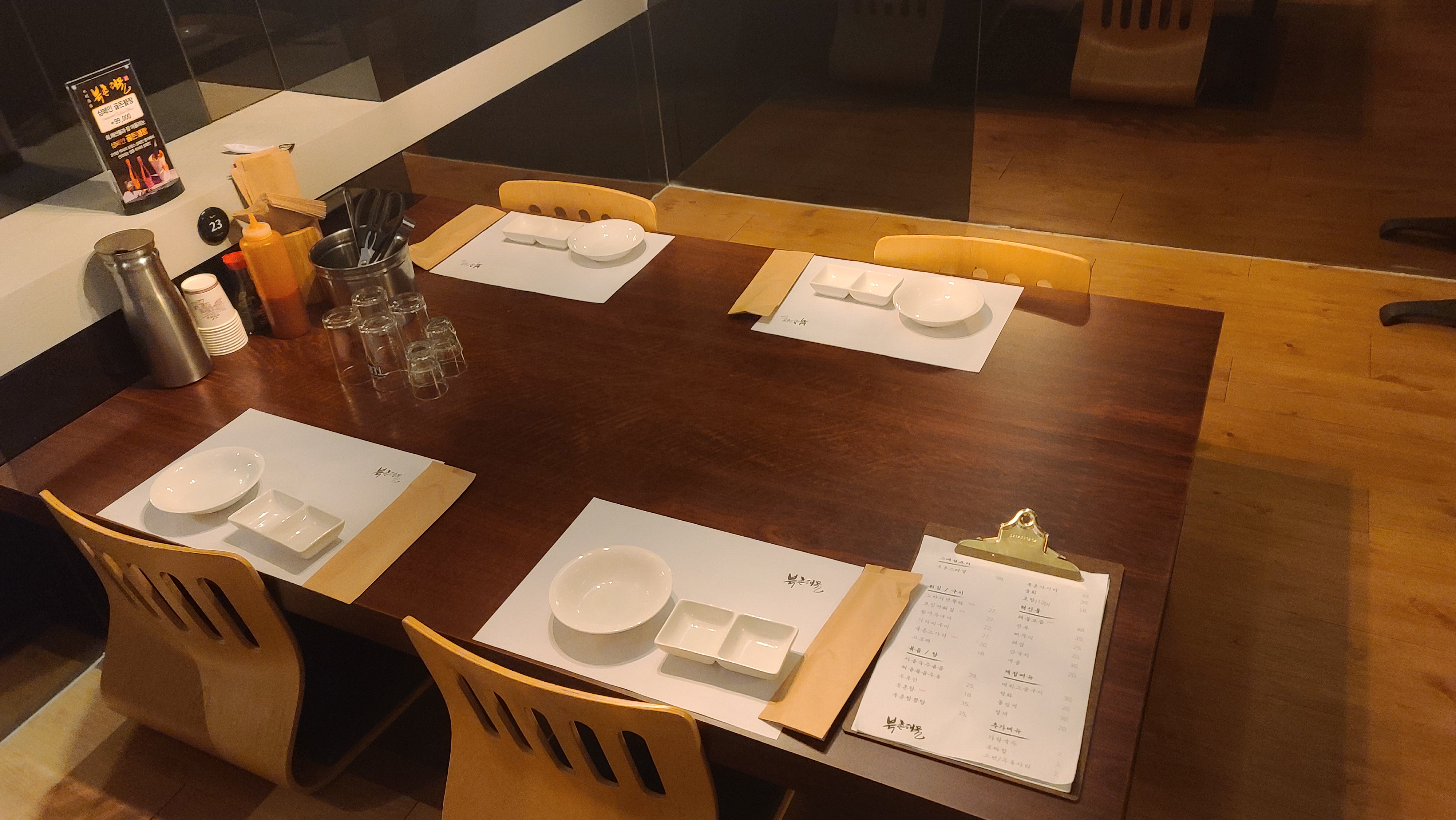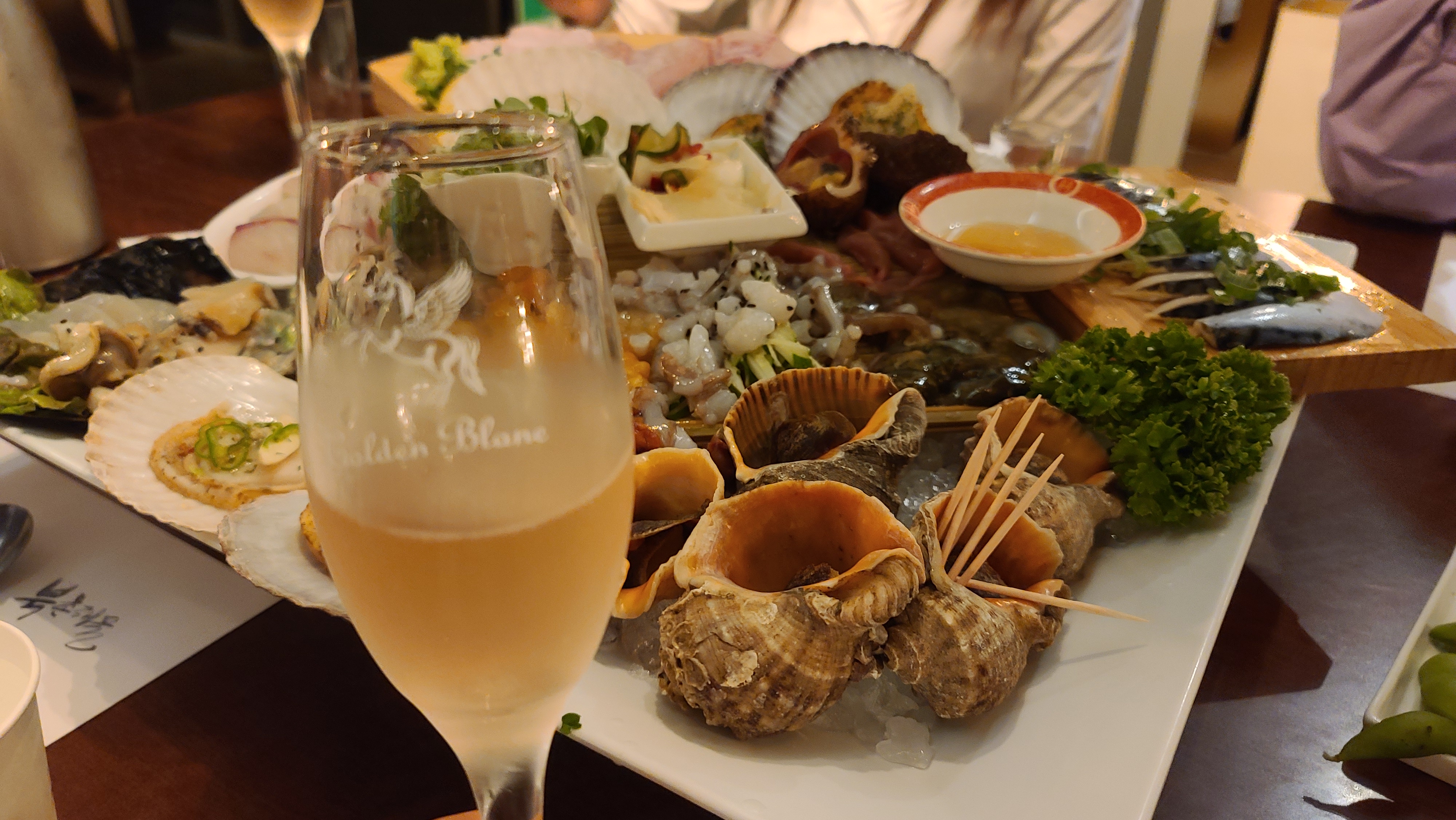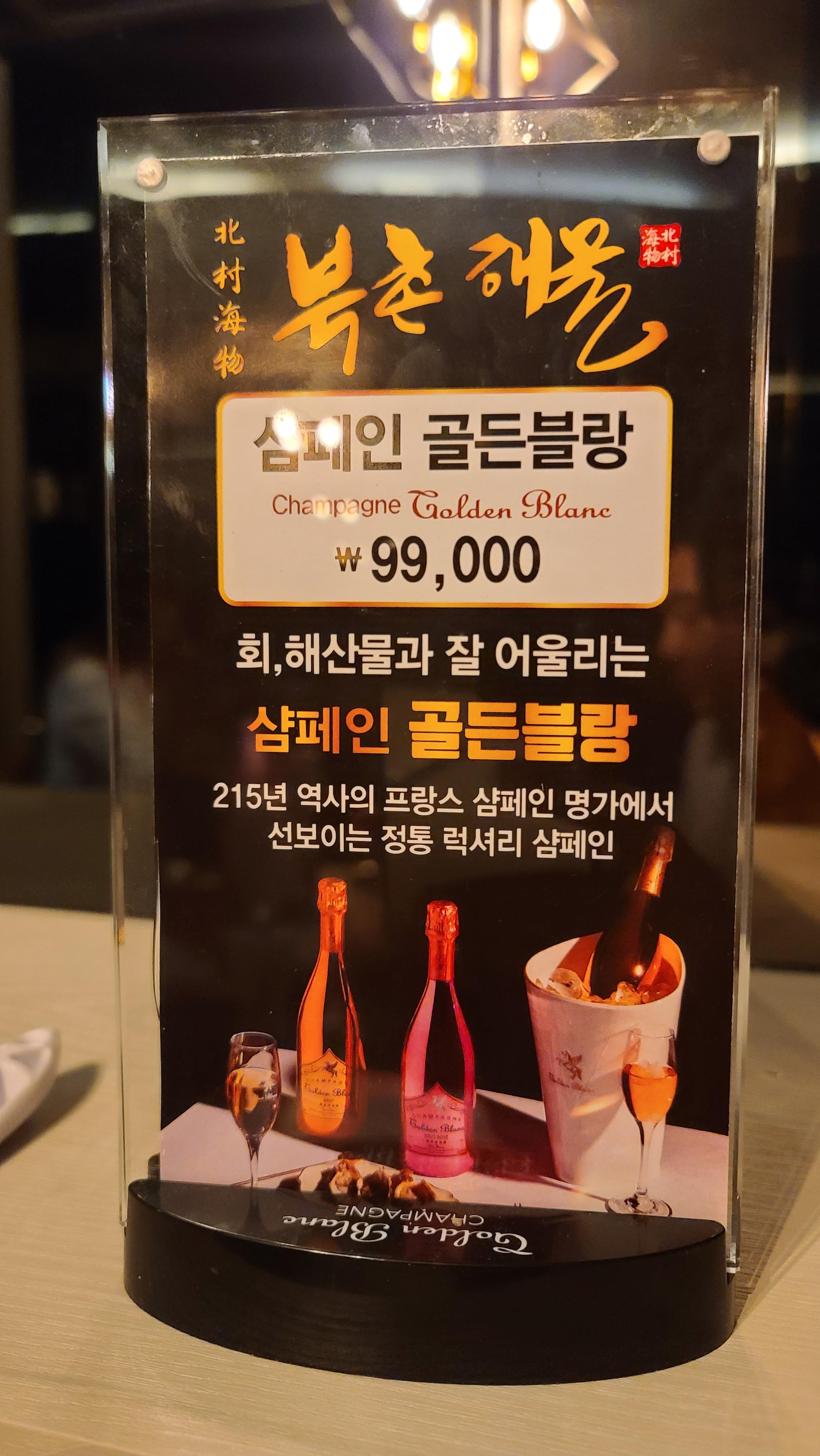 룸으로 자리를 잠고 메뉴판을 살펴봅니다. 전복, 삐뚜리, 해삼, 산낙지, 개불 등의 해물모듬과 사시미, 물회, 돌멍게, 대하, 덴뿌라 등 다양한 일식메뉴가 눈에 보입니다. 모든 메뉴를 맛볼수 있는 북촌스페셜을 주문하고 테이블위를 살펴보니 회, 해산물과 잘 어울리는 샴페인 골든블랑 광고판이 무척 고급스러워보여 축하의 자리를 위하여 샴페인도 주문을 해봅니다.