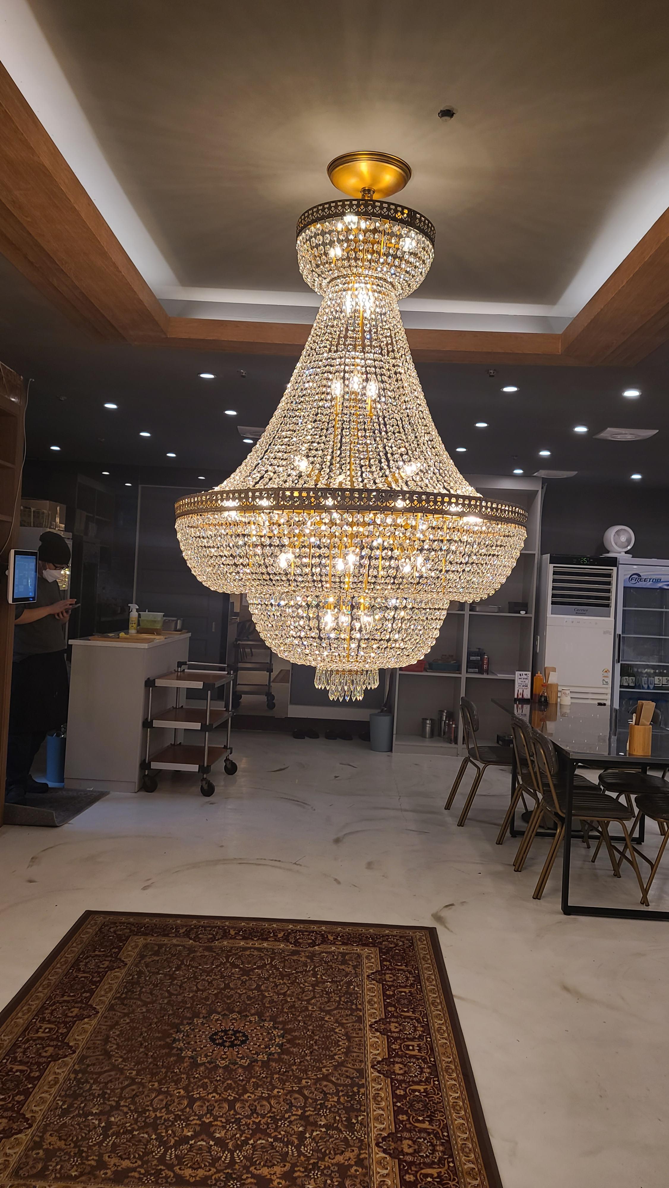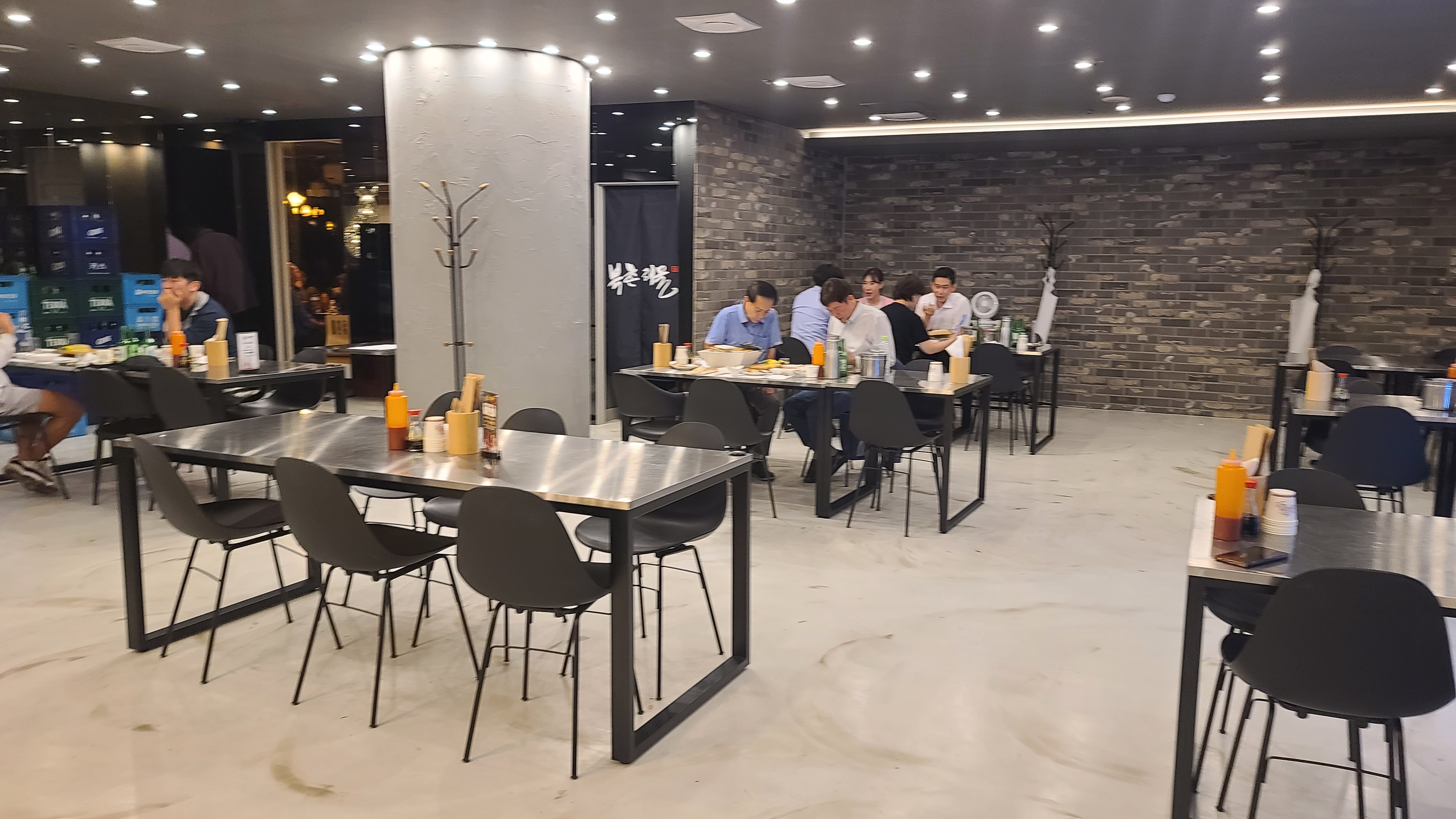입구에 들어서니 대형 샹들리에가 시선을 사로잡고 바깥으로 테이블이 배치되어 있는 모습입니다. 해물포차에 커다란 샹들리에 장식이라니 조금 의아한 인테리어지만 어떻게 보니 나름 또 멋지게 보이는것 같습니다.