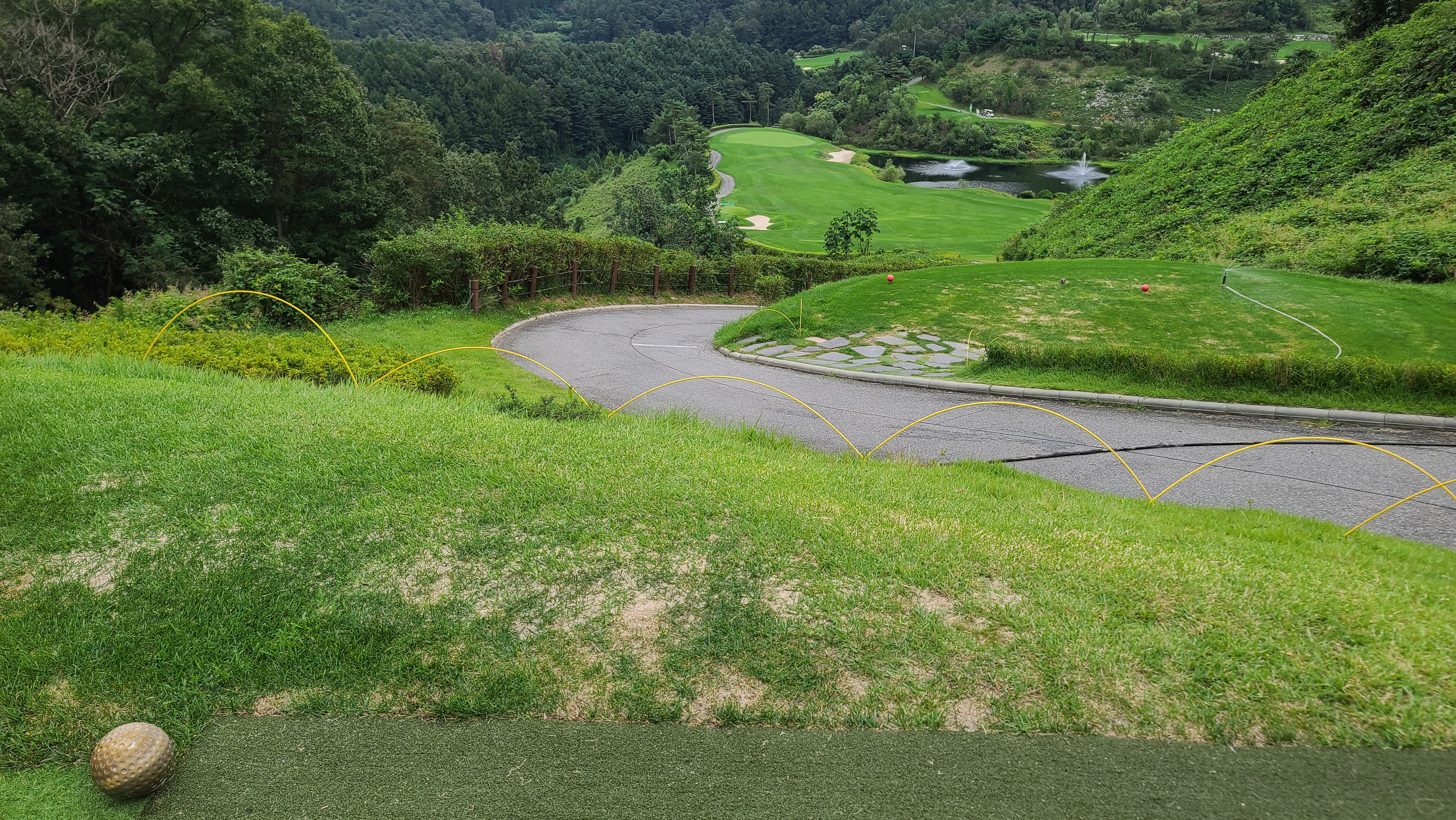 오너스 CC의 레이크 코스를 돌면서 페어웨이와 러프의 잔디상태 그리고 티샷지점 등을 살펴보며 골프장 상태를 체크해봅니다. 티샷지역은 매트를 쓰지 않고 티위치를 수시로 바꿔가며 잔디 관리를 하고 있는 모습이 보였으며 페어웨이와 그린의 디봇들도 관리하시는 분이 있어 비교적 잘 관리되어 있는 모습이 보입니다.