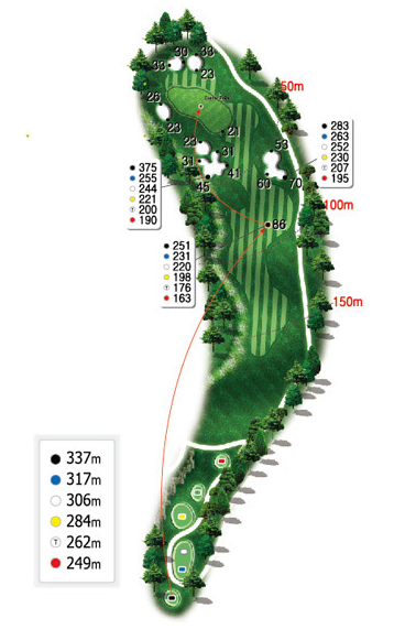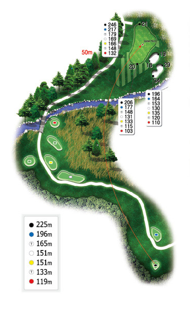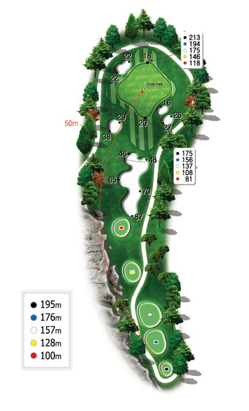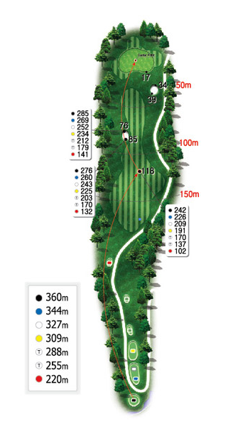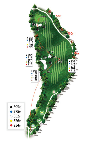 힐코스 3번 157m의 파3홀입니다. 살짝 우측 도그렉홀로 오른쪽아래로 경사가 있기 때문에 왼쪽을 겨냥하기 쉬우나 넘어가면 OB지역으로 매우 신중한 티샷이 요구되는 홀입니다. 또한 거리가 있고 그린중앙이 벙커이기 때문에 티샷실수를 할경우 의외로 스코어가 안나올수도 있으므로 주의하여야 합니다.