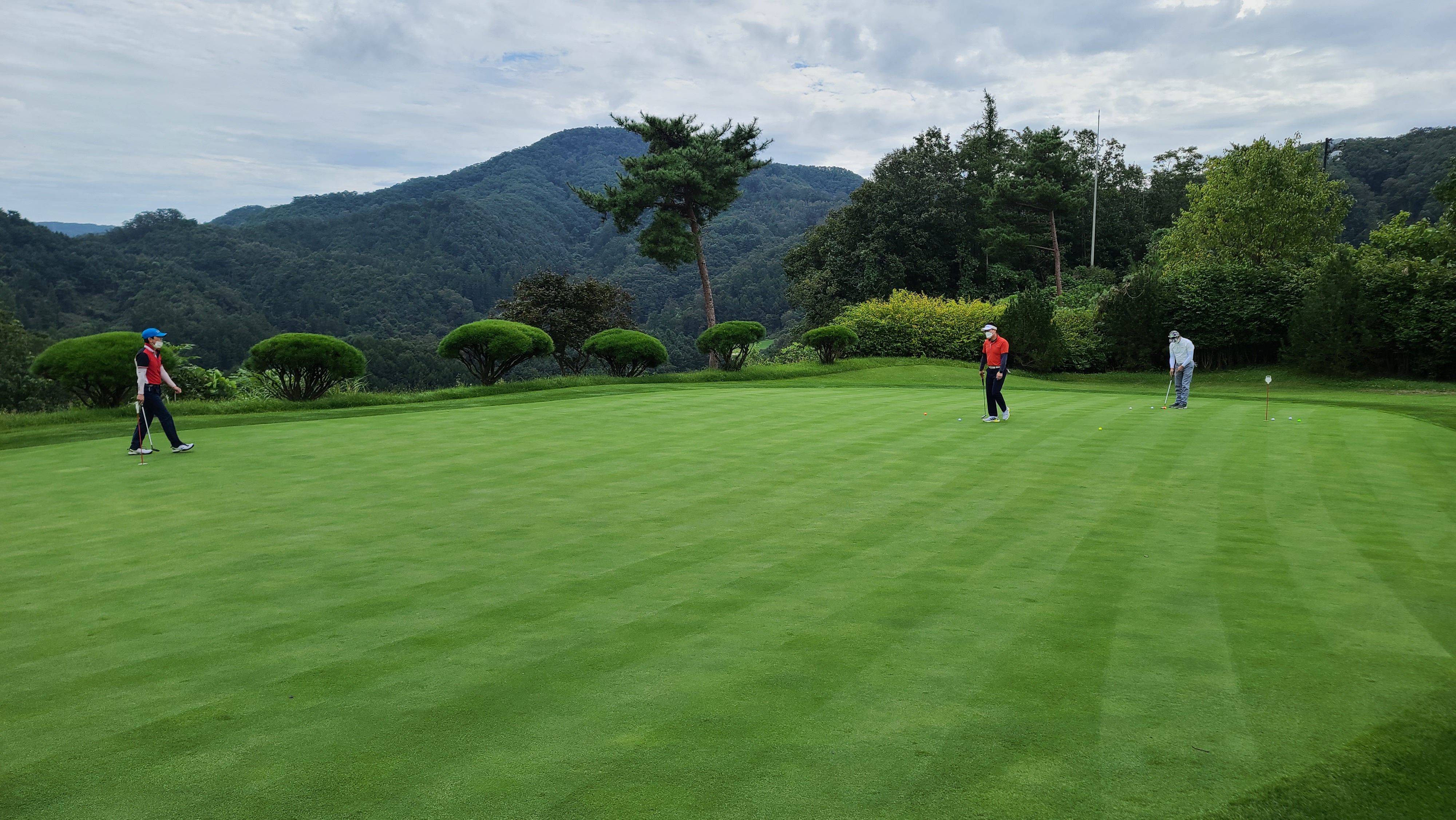 클럽하우스 밖으로 나가서 라운딩 전에 퍼팅연습을 하며 그린의 상태를 살펴봅니다. 그린의 빠르기와 잔디의 상태들을 체크해보며 오늘 라운딩 컨디션을 점검해보는 중요한 시간입니다.