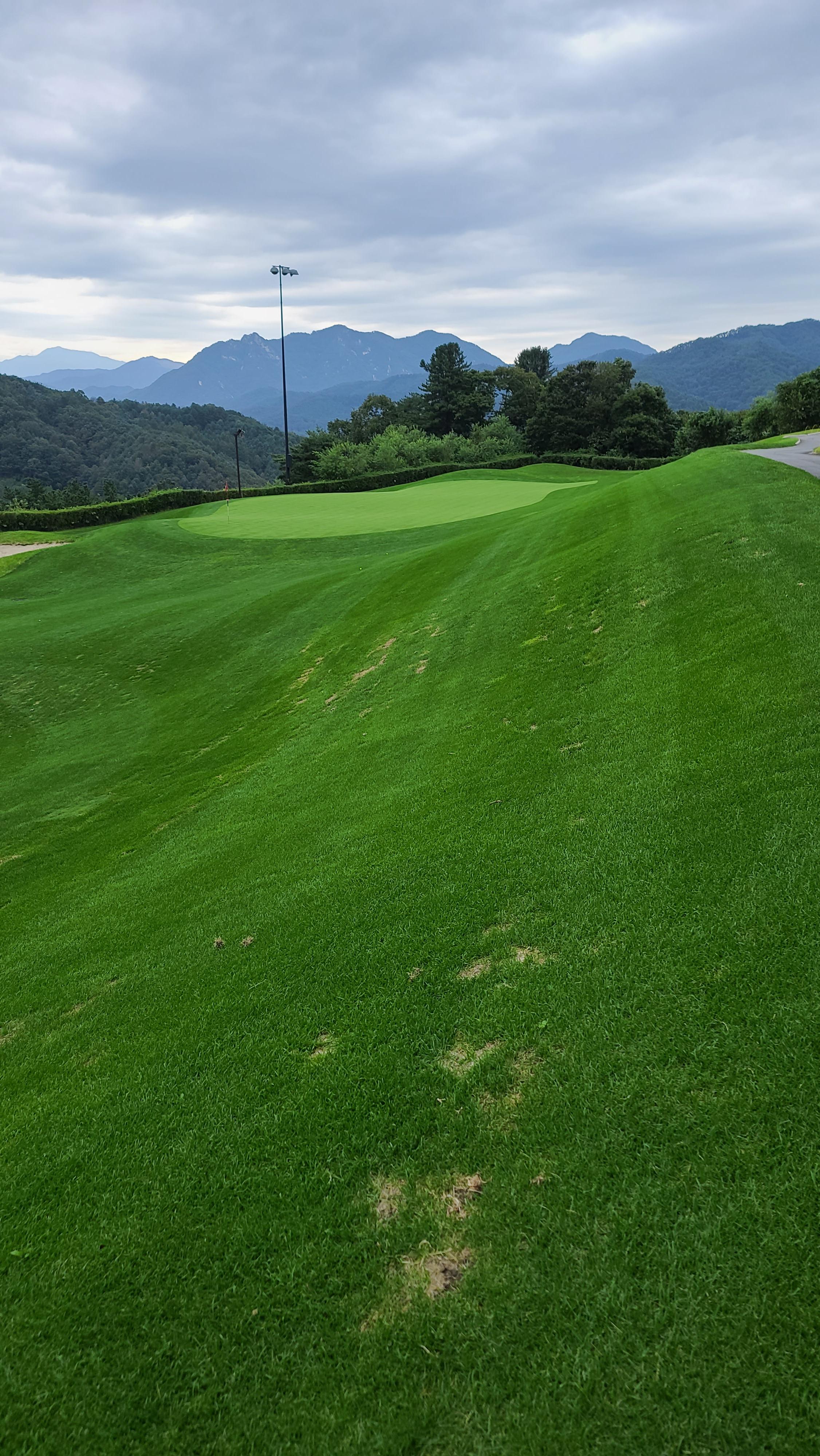 즐겁게 플레이를 즐기다 보니 어느덧 힐코스의 마지막 9번 파5홀에 다다르게 됩니다. 넓은 페어웨이와 경치를 감상하며 플레이를 한다면 기분좋게 버디로 라운딩을 마무리할 수가 있는 쉬운 홀입니다.