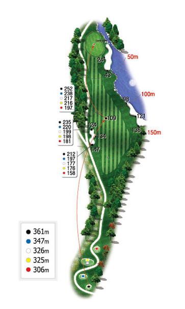 레이크코스의 1번과 2번홀을 무사히 남기고 세번째 파5홀을 맞이합니다. 490m의 비교적 긴 전장을 자랑하는 홀로 좌측으로는 레이크 코스라는 이름답게 매우 긴 워터해저드가 그린까지 이어져 있으므로 당겨치는 것에 주의하여야 합니다.