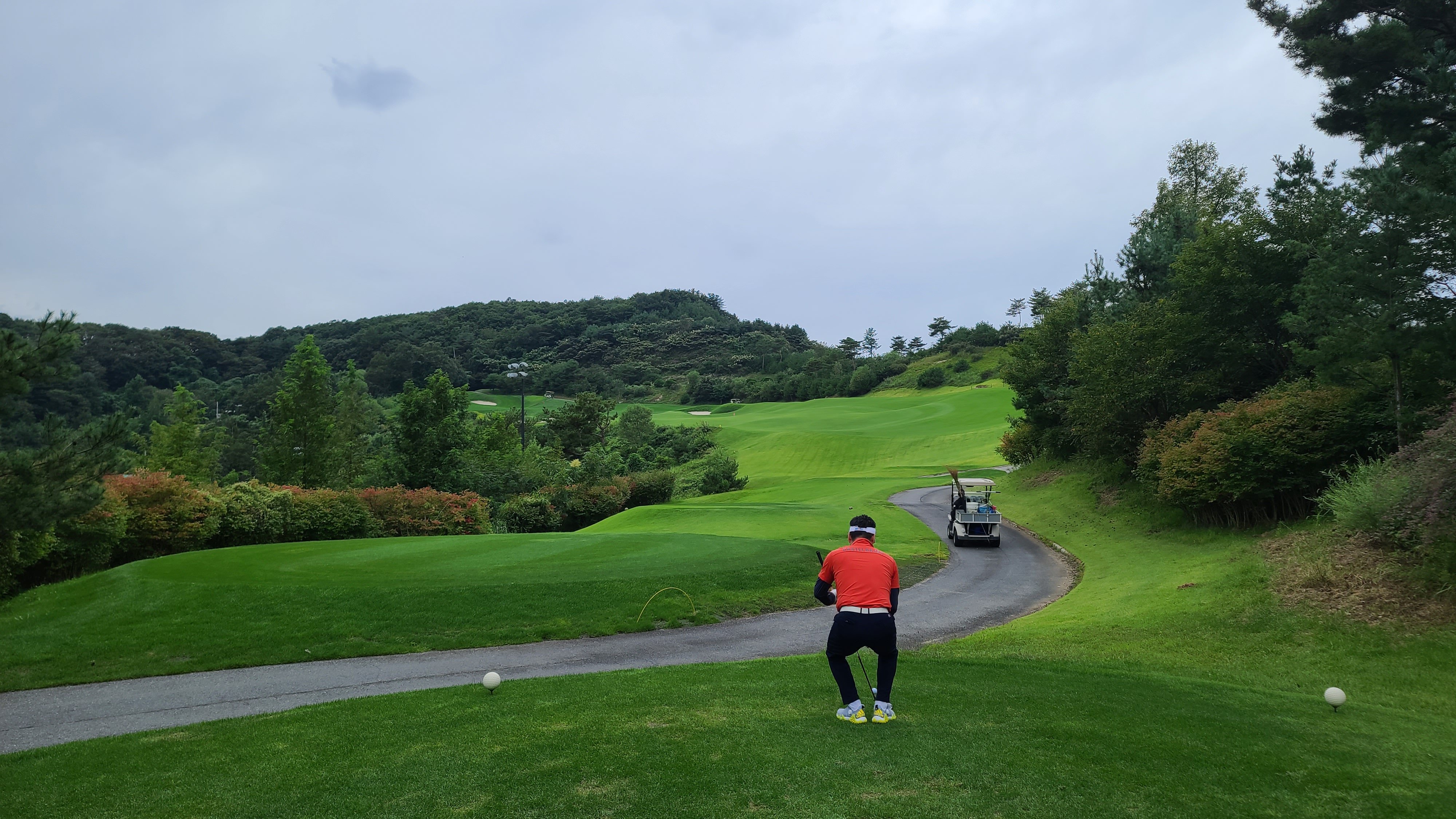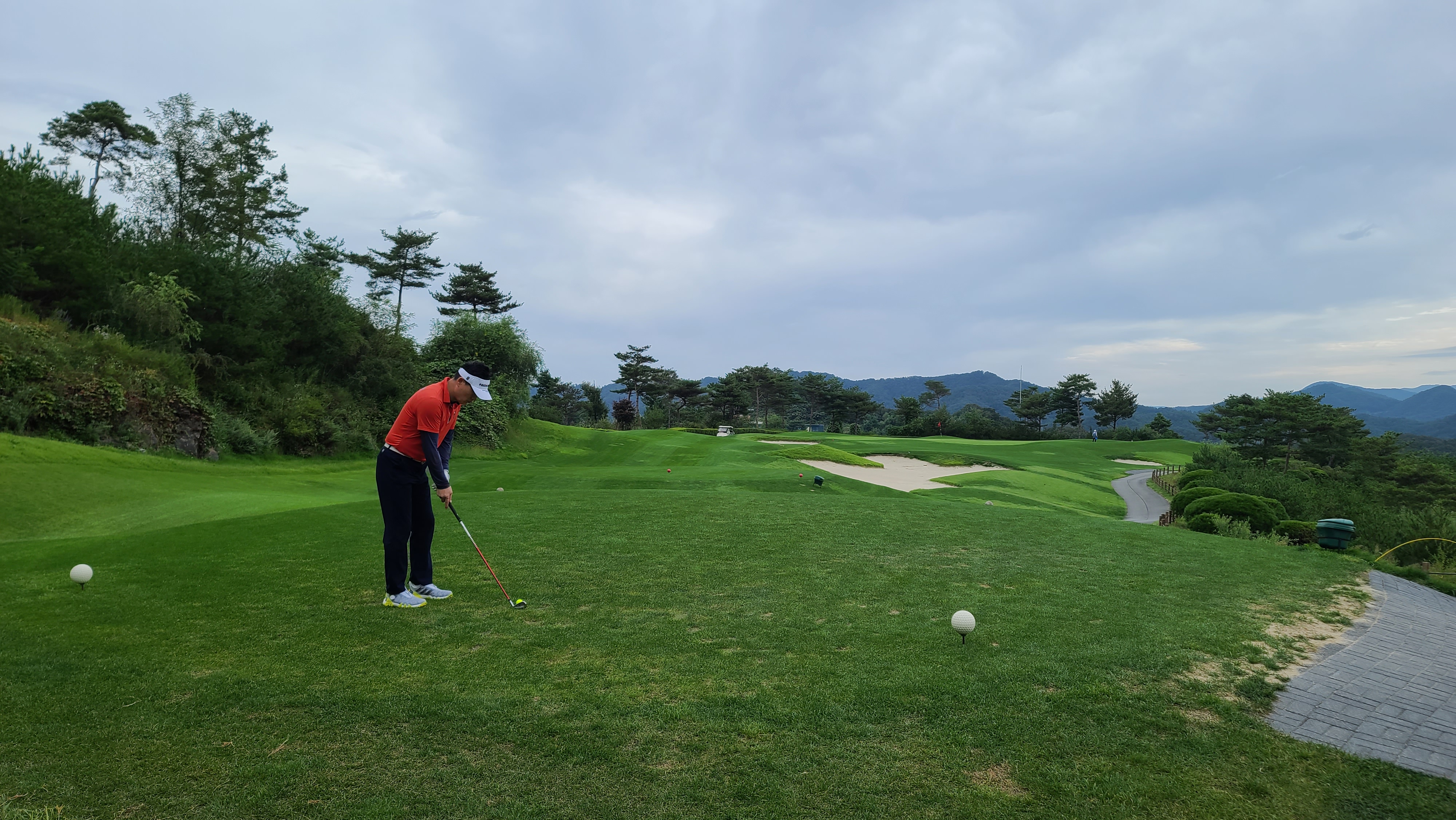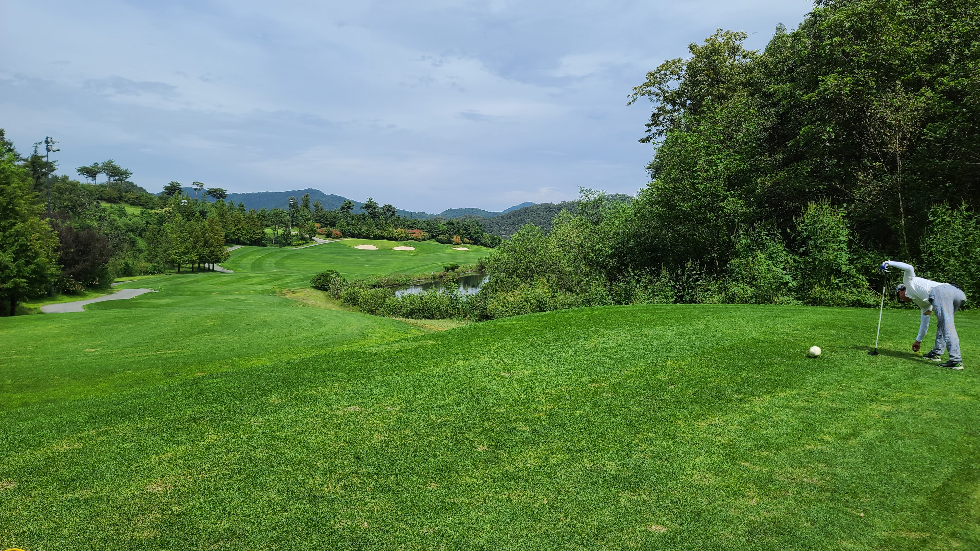 후반전 힐코스 1번 352m의 내리막 파4홀부터 시작입니다. 골프맵과 사진에서 보이듯이 페어웨이가 무척이나 넓게 펼쳐져 있어 티샷이 매우 편안하게 느껴지는 홀입니다. 캐디분께 여쭤보니 힐코스가 레이크보다 상대적으로 쉽고 페어웨이도 넓다고 하십니다. 레이크도 좁지 않게 느껴졌는데 더 넓다니 오너스는 비교적 넓은 페어웨이를 가진 골프장이구나 하는 것을 느끼게 됩니다.