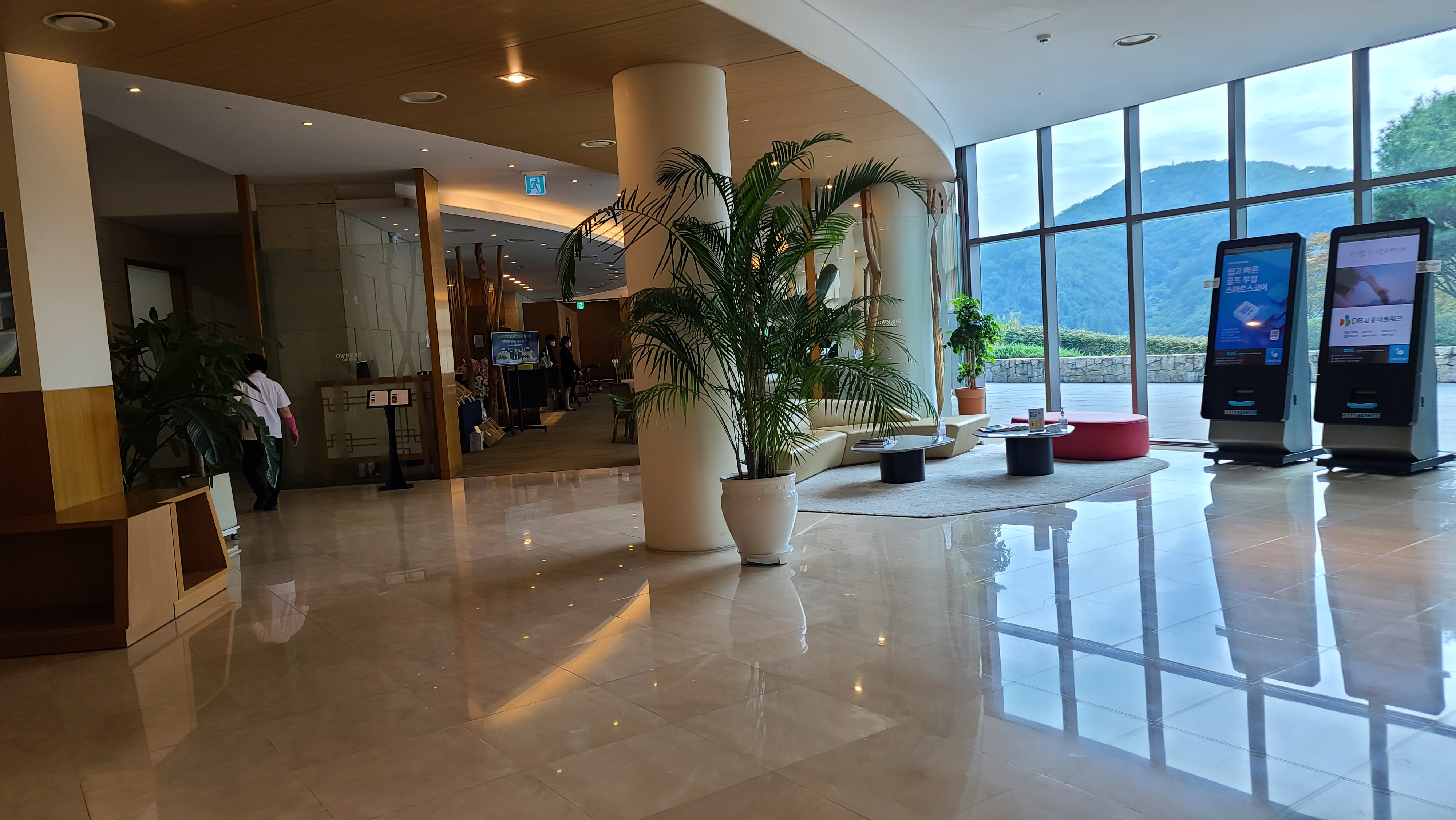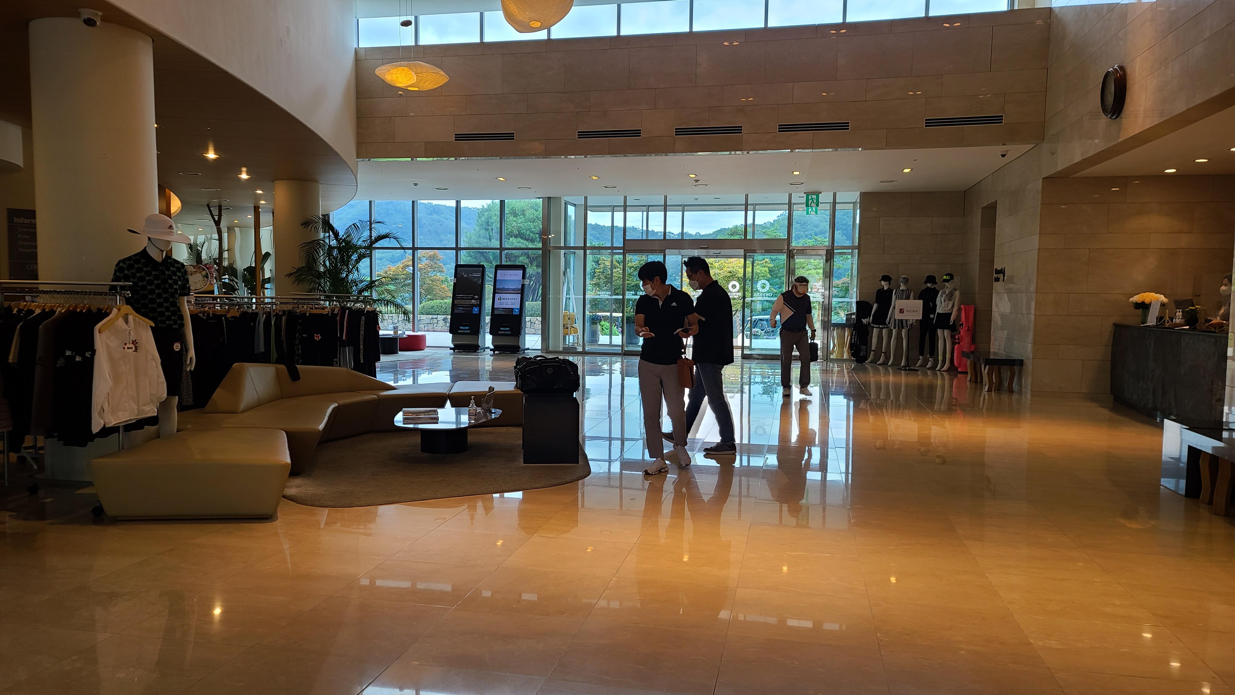 클럽하우스 내부를 둘러보니 오른편으로는 카운터와 락커룸이 위치하고 있으며 왼편으로는 골프매장과 클럽하우스 식당이 보입니다.
