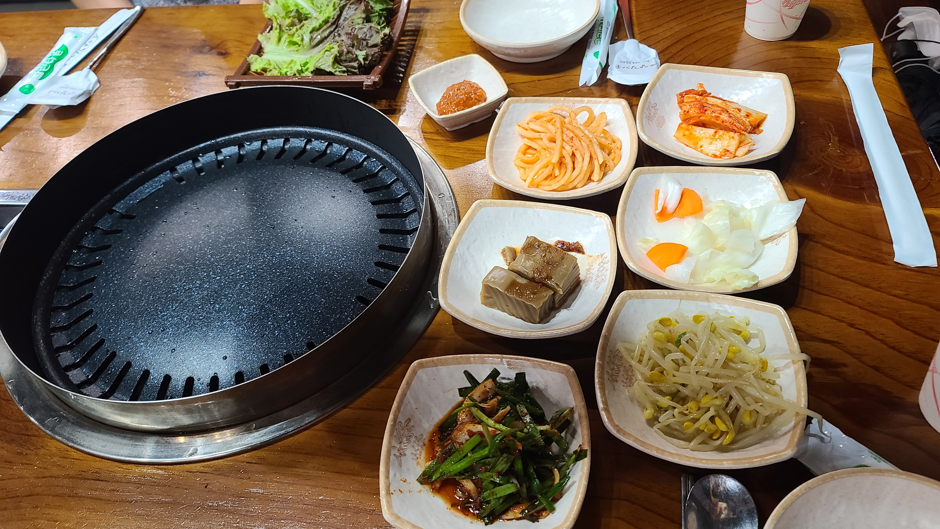 잠시 기다리자 숯불과 불판 그리고 반찬들을 세팅해 주십니다. 부추김치, 콩나물, 도토리묵, 양배추절임, 무생채, 김치, 상추 등 보기만해도 막걸리가 땡기는 맛있어 보이는 반찬들입니다.