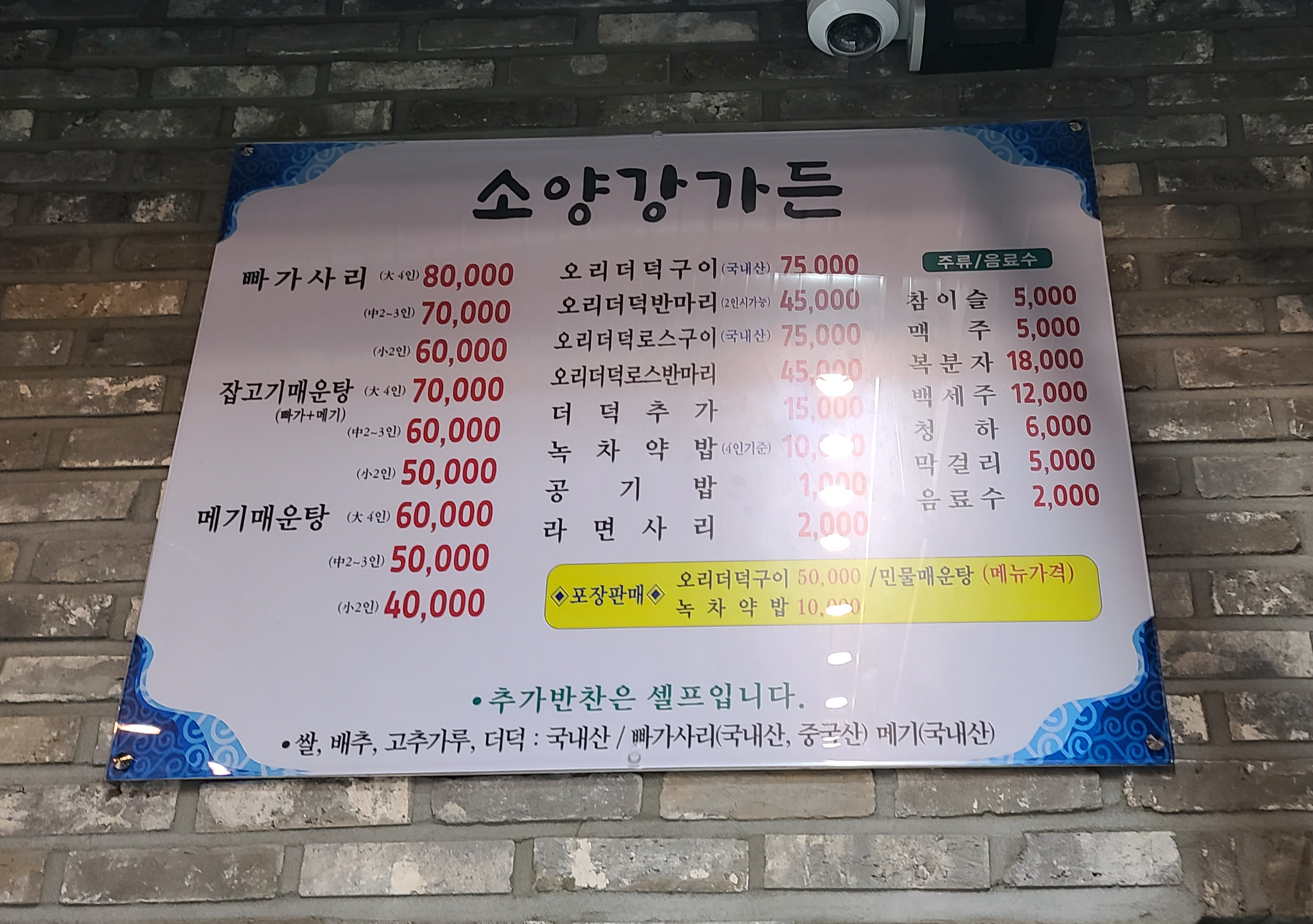 자리를 잡고 메뉴판을 살펴봅니다. 빠가사리, 잡고기, 메기 3종의 민물 매운탕이 주력 메뉴이며 오리와 더덕을 이용한 오리더덕구이가 또한 매우 인기가 높은 서브메뉴입니다. 오리더덕구이를 주문하고 밥은 일반밥대신 녹차약밥으로 주문을 합니다.