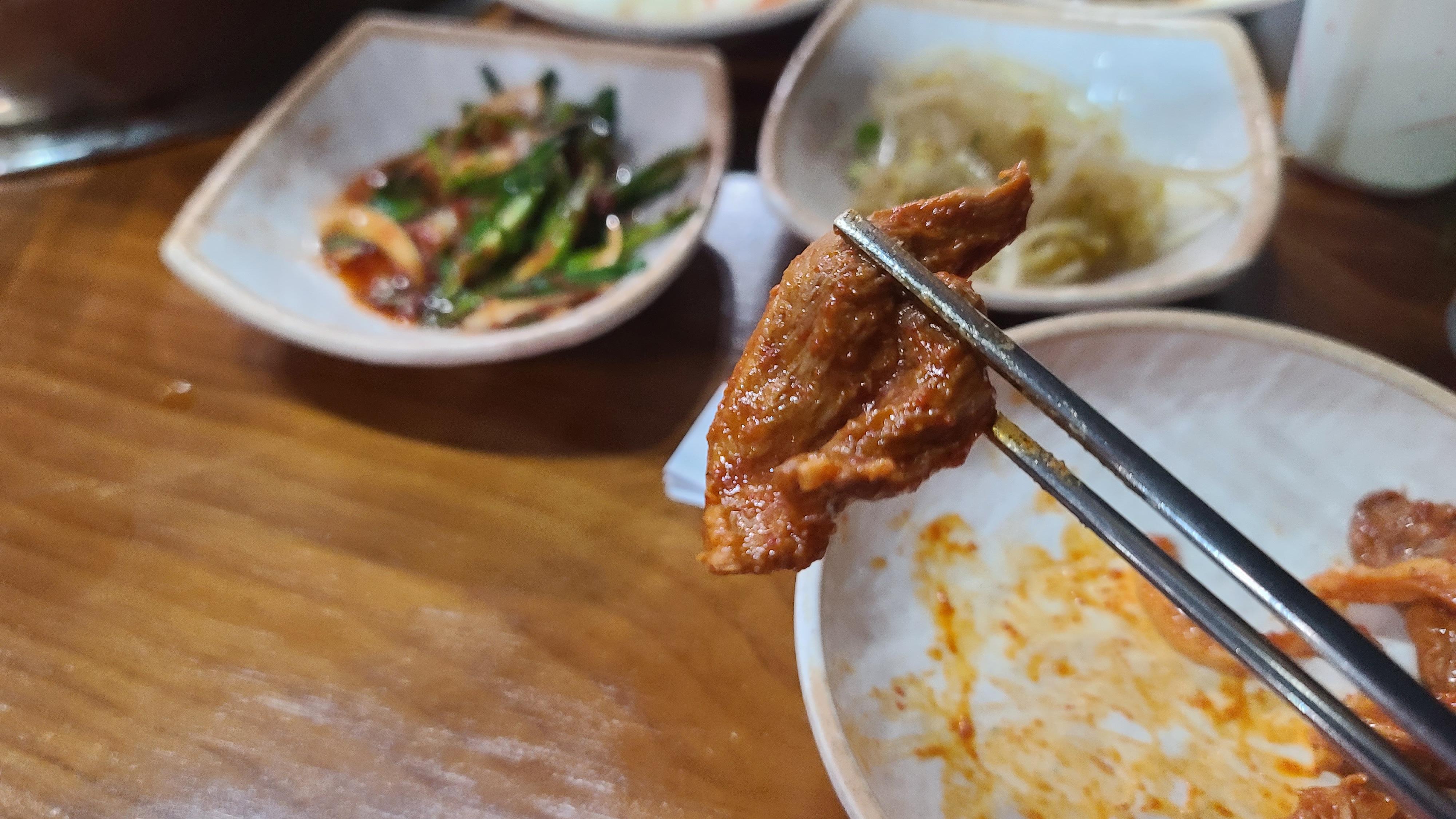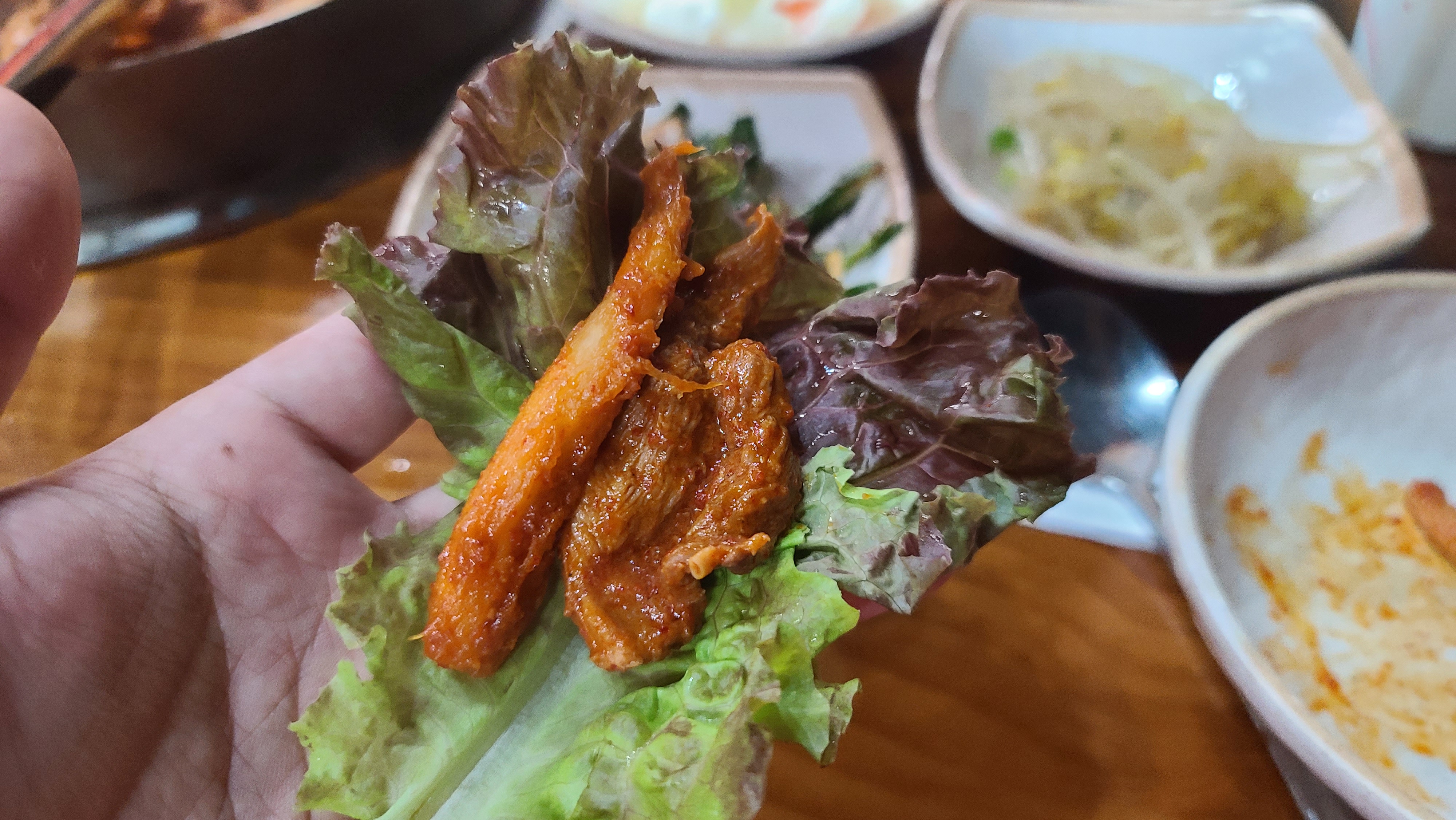 잘 익혀진 오리고기를 그냥도 먹어보고 상추에 더덕과 함께 싸서도 먹어보고 콩나물도 얹고 다양한 조합으로 오리의 맛을 봅니다. 야들야들 질좋은 오리고기에 특제 양념이 잘 배어들어 천상의 맛을 자아내고 있습니다. 더덕도 양념과 오리의 육즙을 흡수하여 감칠맛을 제대로 내는 최고의 영양식품으로 조리가 되어 끝도 없이 흡입하게 됩니다.