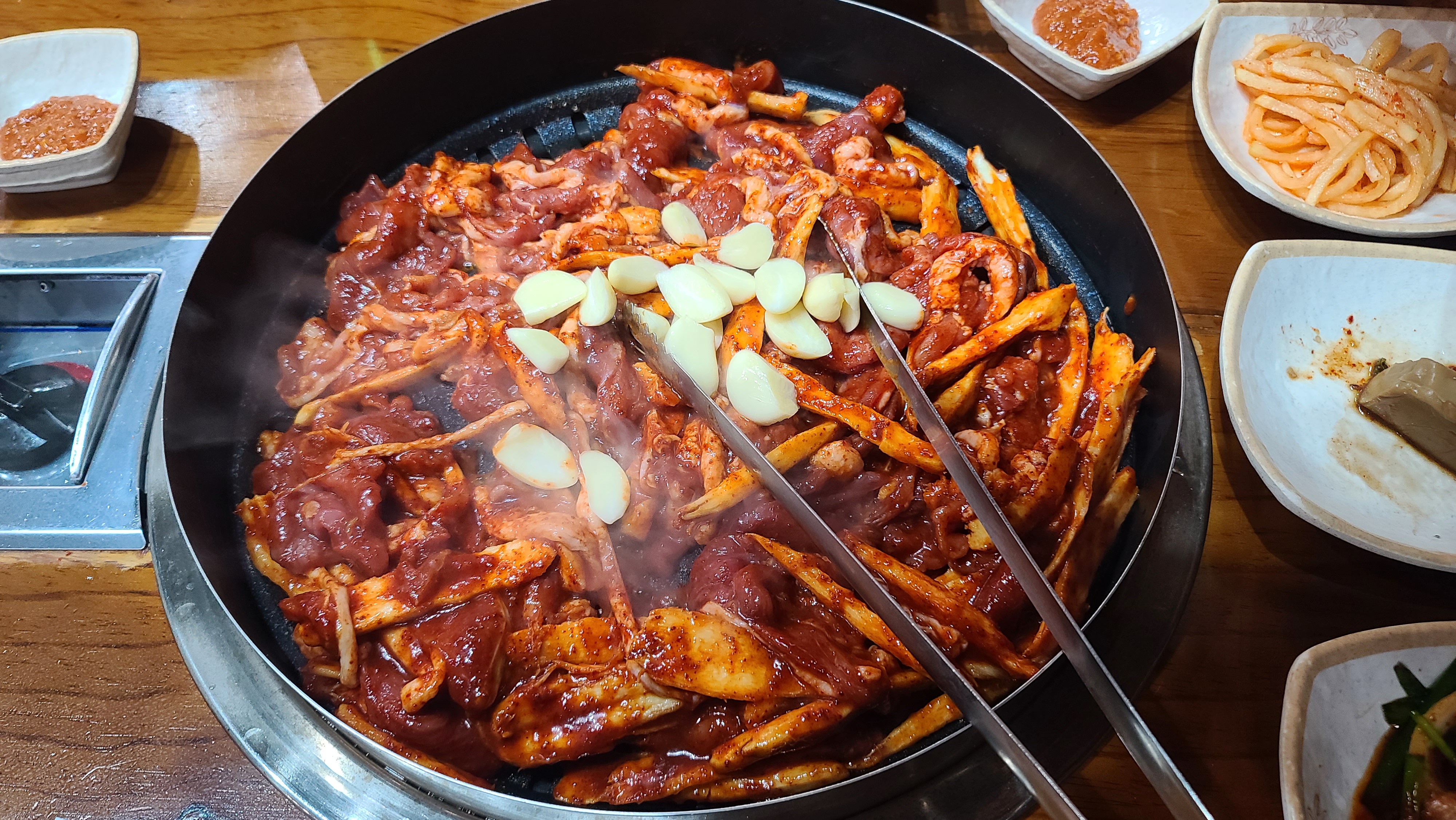 화력이 좋은 숯불위에 오리고기를 잘 섞으면서 익혀주니 더덕과 마늘도 함께 보기좋게 익어갑니다. 오리더덕구이는 직원분께서 직접 구워주시기 때문에 옷에 튀거나 오리를 못구울 걱정없이 조리가 될때까지 느긋한 마음으로 기다리면 되는 참으로 편리한 시스템입니다.