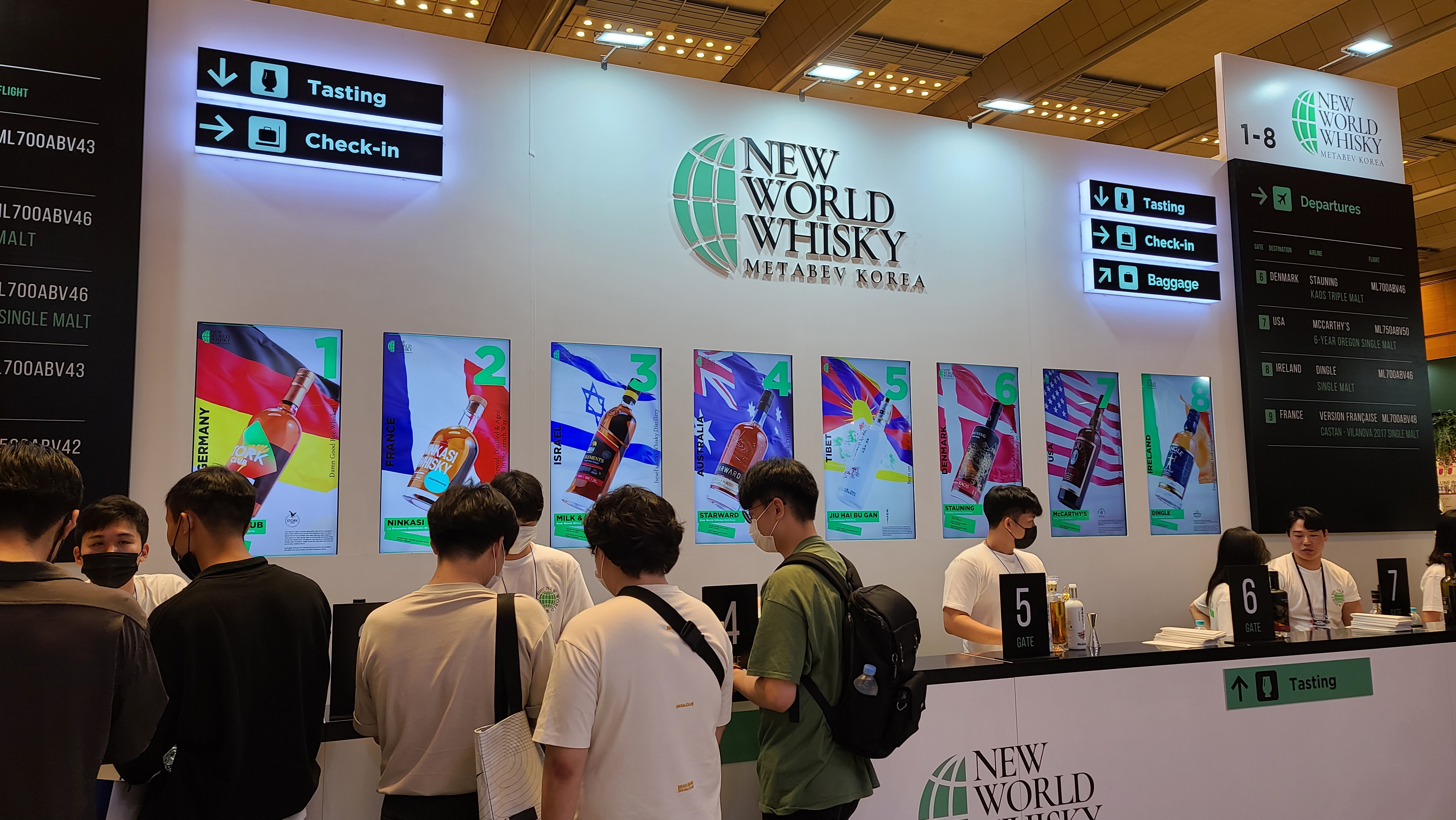 페르노리카 바로옆으로는 메타베브 코리아의 부스가 보였으며 특이하게 공항컨셉으로 스튜어디스 복장의 진행요원분께 티켓을 받고 출국심사를 하면 각나라의 위스키를 시음하는 컨셉으로 주류시음을 공항 출국과 같은 이벤트로 녹여내어 매우 사람들의 호평을 받는 모습이 보였습니다.