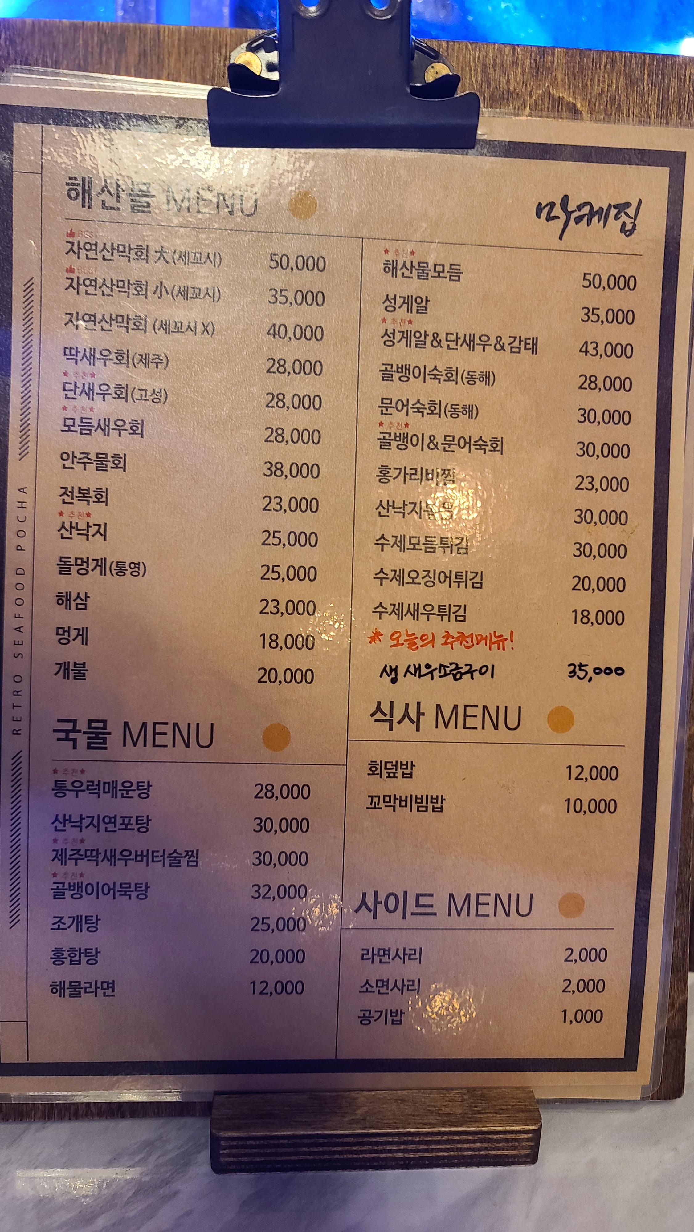 자리를 잡고 메뉴판을 살펴보니 자연산막회가 메인이며 아래로 다양한 해산물들이 보입니다. 가장 눈에 들어오는 것은 제철 딱새우회(제주), 단새우회(고성). 메뉴에 별표까지 있는 추천메뉴로 매우 궁금해져서 단새우회를 주문해봅니다.