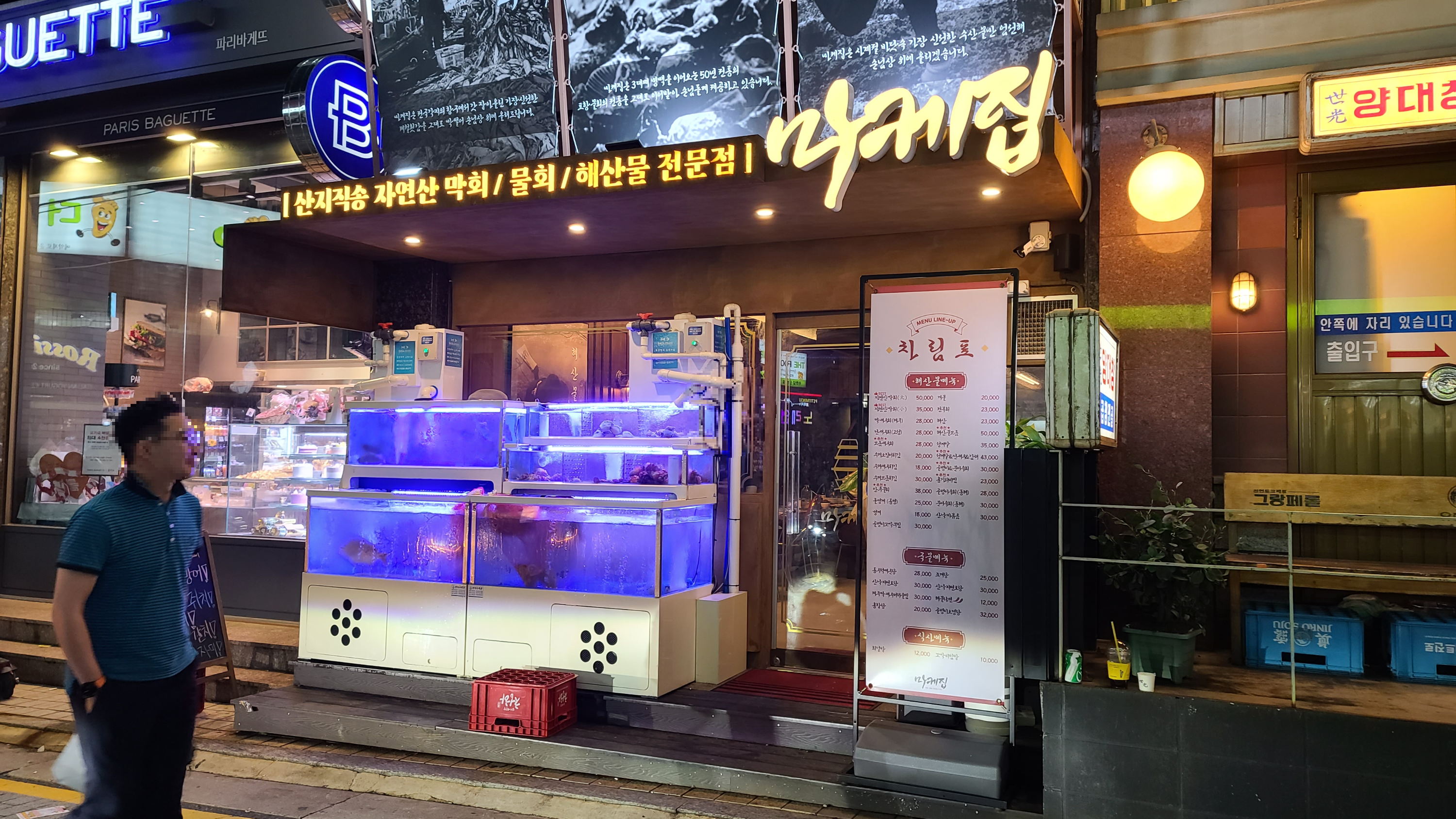 신논현역 부근 가볍게 한잔하기 위해 안주를 찾다가 멋진 수족관이 가게앞에 보이는 집이 눈에 들어옵니다. 마케집 산지직속 자연산막회, 물회, 해산물 전문점이라고 쓰여있는 것이 호기심을 자아내는 부분입니다.