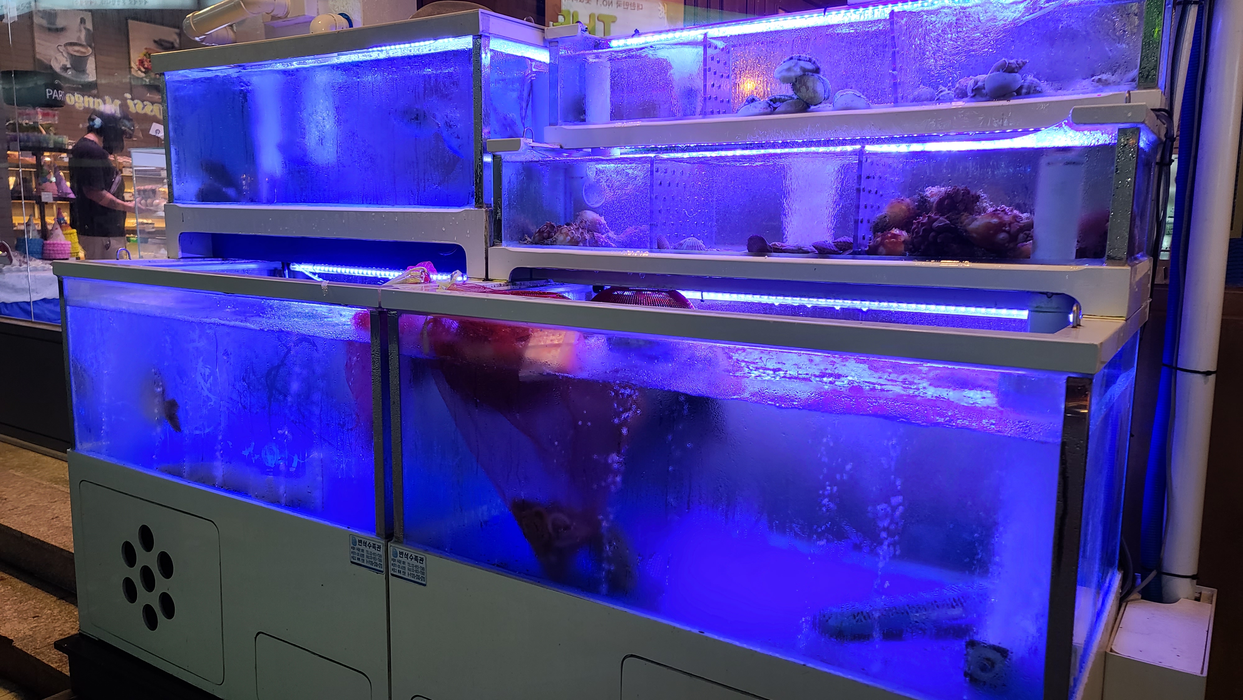 가까이서 수족관을 살펴보니 멍게, 전복, 잡어, 낙지 등 다양한 종류의 해산물이 보입니다. 수족관을 보면서 해산물에 가볍게 한잔하고 싶은 마음이 저절로 생기게 되어 가게에 들어가보기로 합니다.