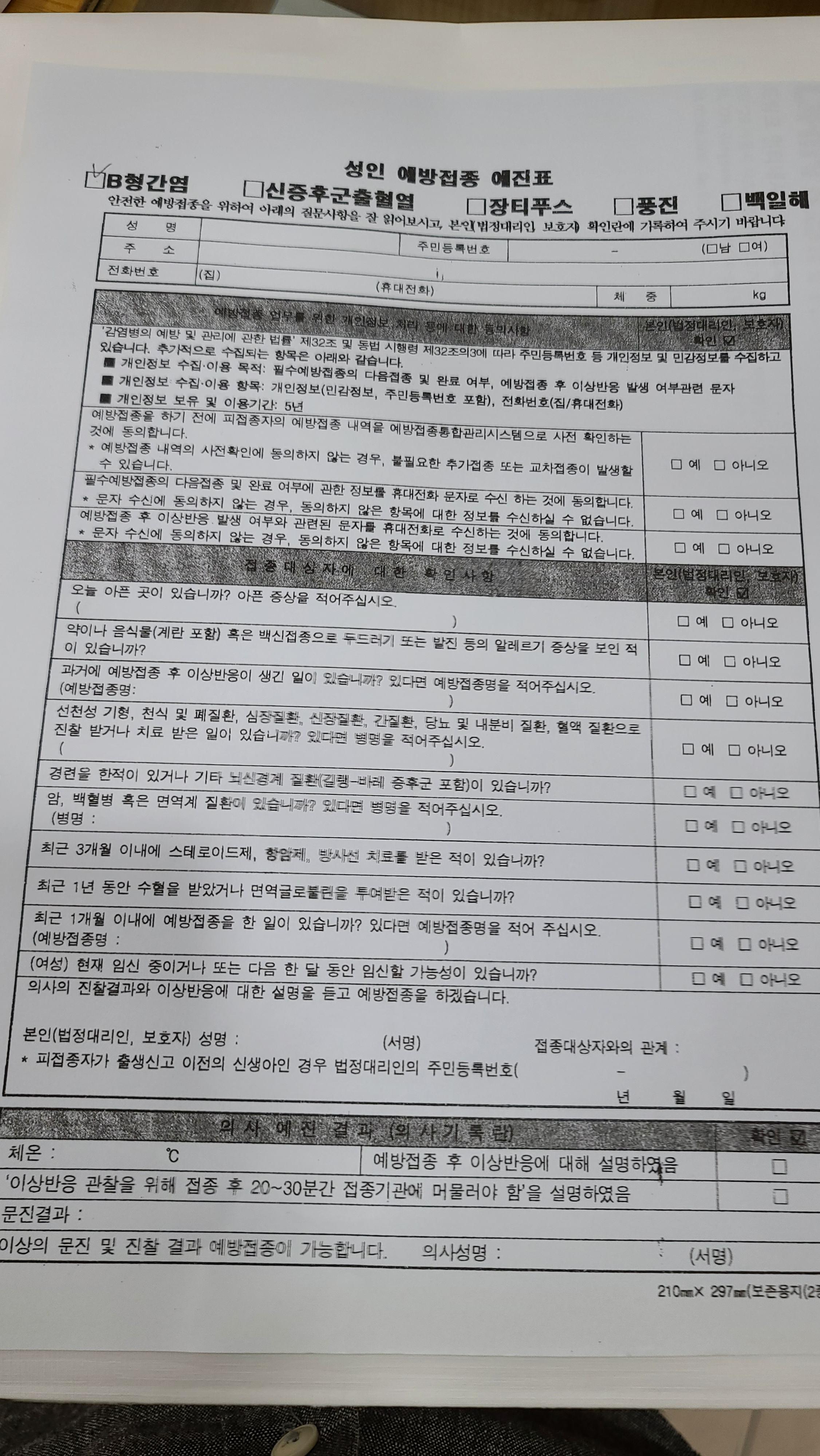 보건소에 방문을 하니 안내직원분께서 친절하게 예진표를 작성하 접수하라고 안내해주십니다. 기본적인 신상정보와 지병 및 기타질환등을 묻는 예진표를 작성해봅니다. 예진표를 작성하면 직원분께서 마지막으로 체온을 재서 기입한 후 데스크로 접수하는 것을 안내해주십니다.