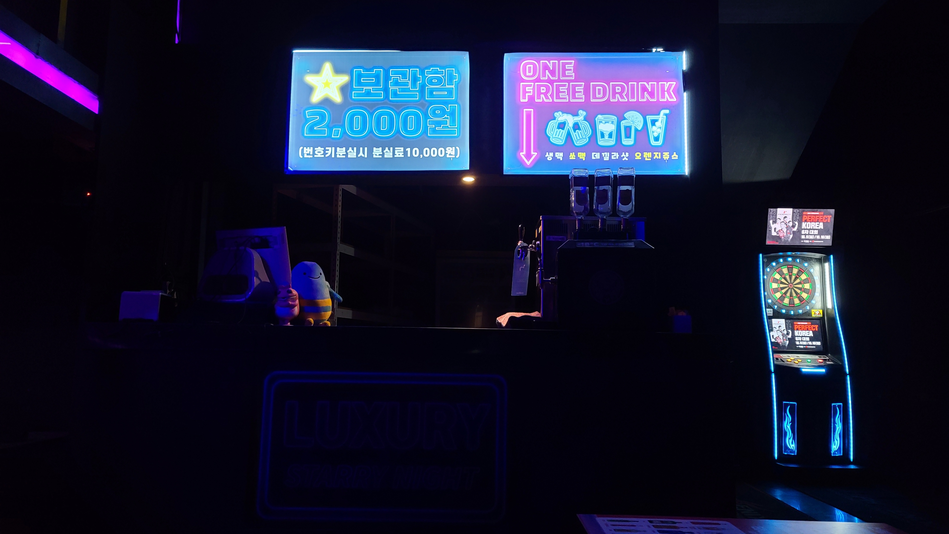 자리를 잡고 주변을 둘러보니 스테이지 단상 위쪽으로는 디제잉 부스가 마련되어 있고 한쪽으로는 짐을 보관할 수 있는 보관함과 다양한 칵테일 및 드링크를 제공하는 바 스타일의 데스크가 마련되어 있는 것이 보이며, 구석으로는 다트 게임기도 보이는 것이 다채로운 분위기들이 퓨전되어 상당히 이색적으로 느껴지고 있습니다.