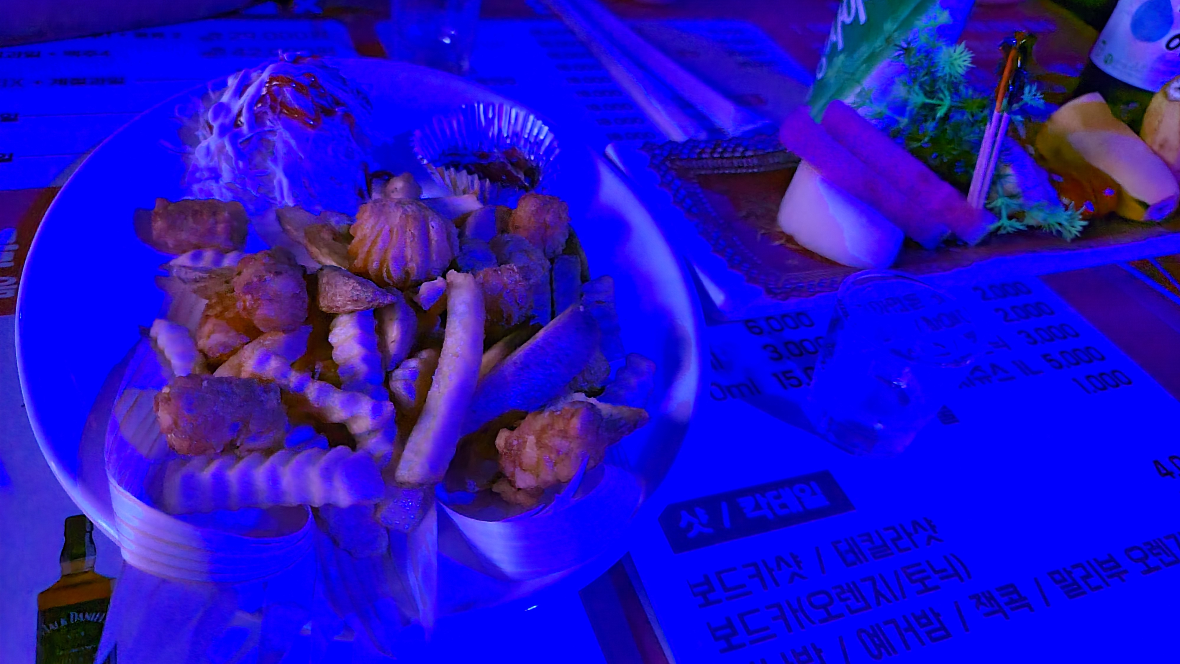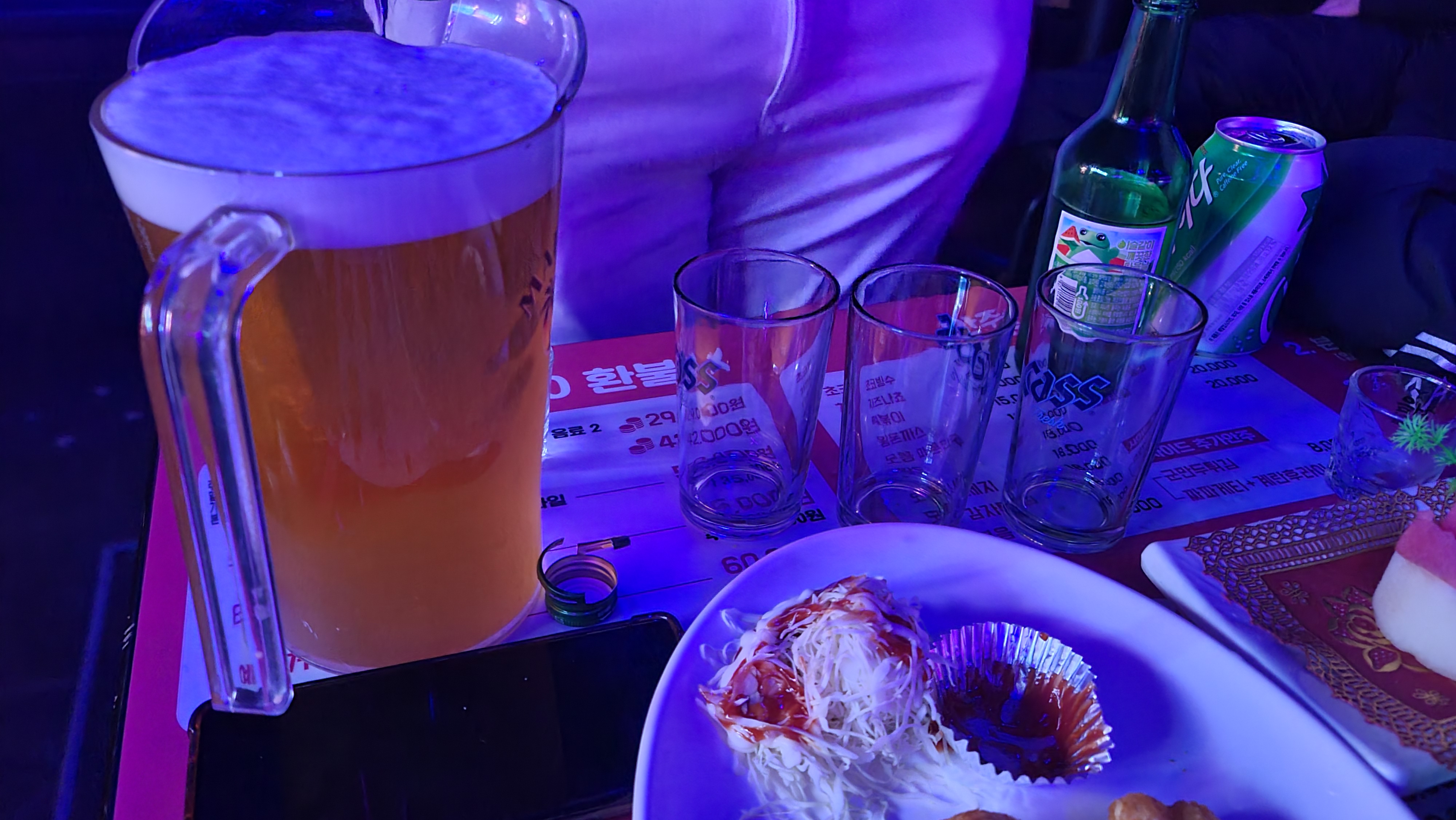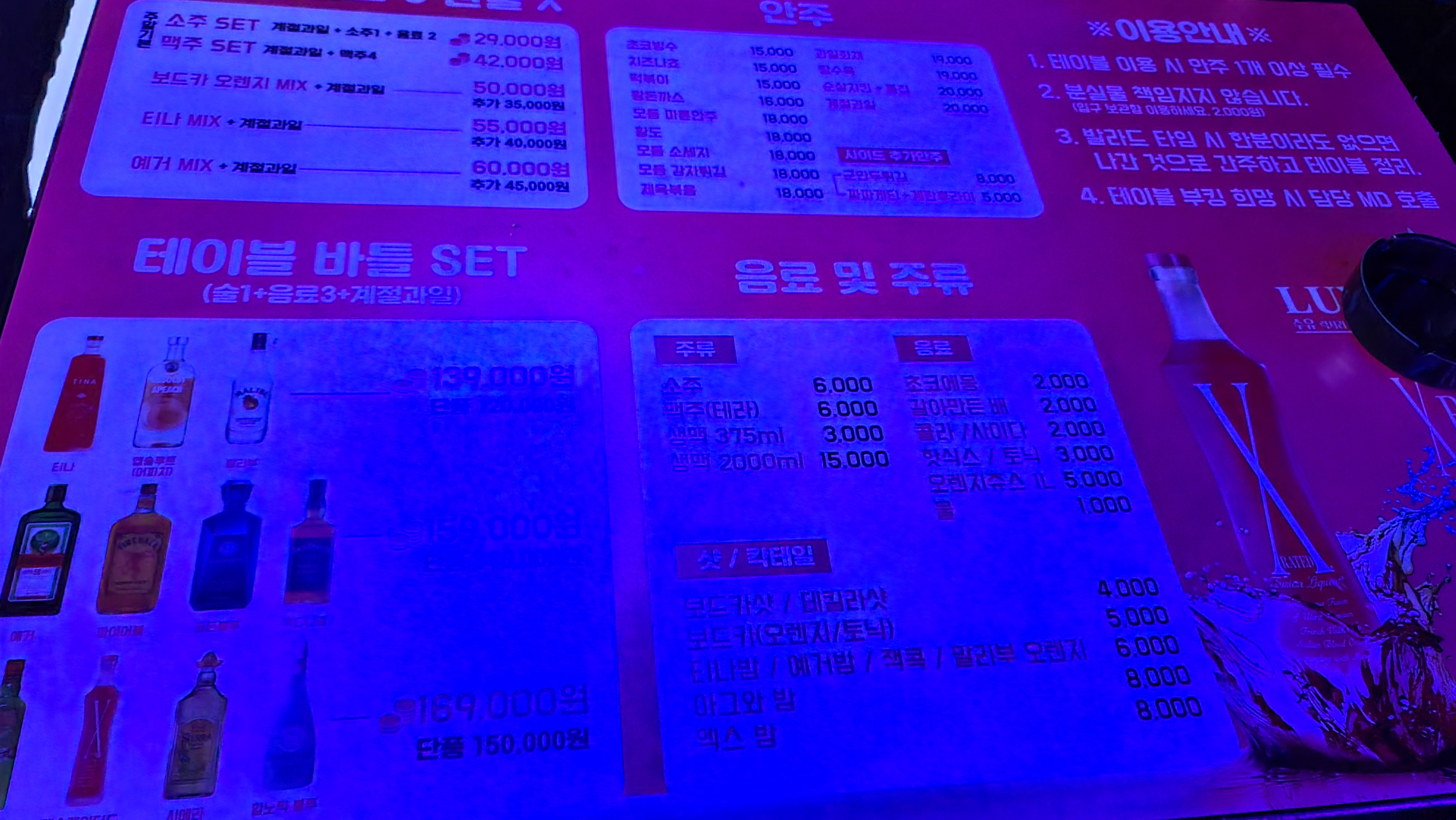 입장후 대충 분위기를 살펴본 후 주문을 해보기로 합니다. 테이블마다 메뉴판이 밑받침형태로 비치되어 있어 언제든지 메뉴판을 보고 마음에 드는 주류와 안주를 주문할 수가 있습니다. 주류를 살펴보니 소주, 맥주, 보드카, 데킬라, 위스키, 진 등 다양한 종류의 술들이 보입니다만 클럽에서 흔히 보이는 샴페인 제품과 루미너스 제품은 잘 보이지 않습니다. 주변을 살펴보니 소주와 맥주가 가장 잘 나가는 것이 보입니다. 가벼운 마음으로 소맥으로 주문하고 분위기를 살펴보기로 합니다.