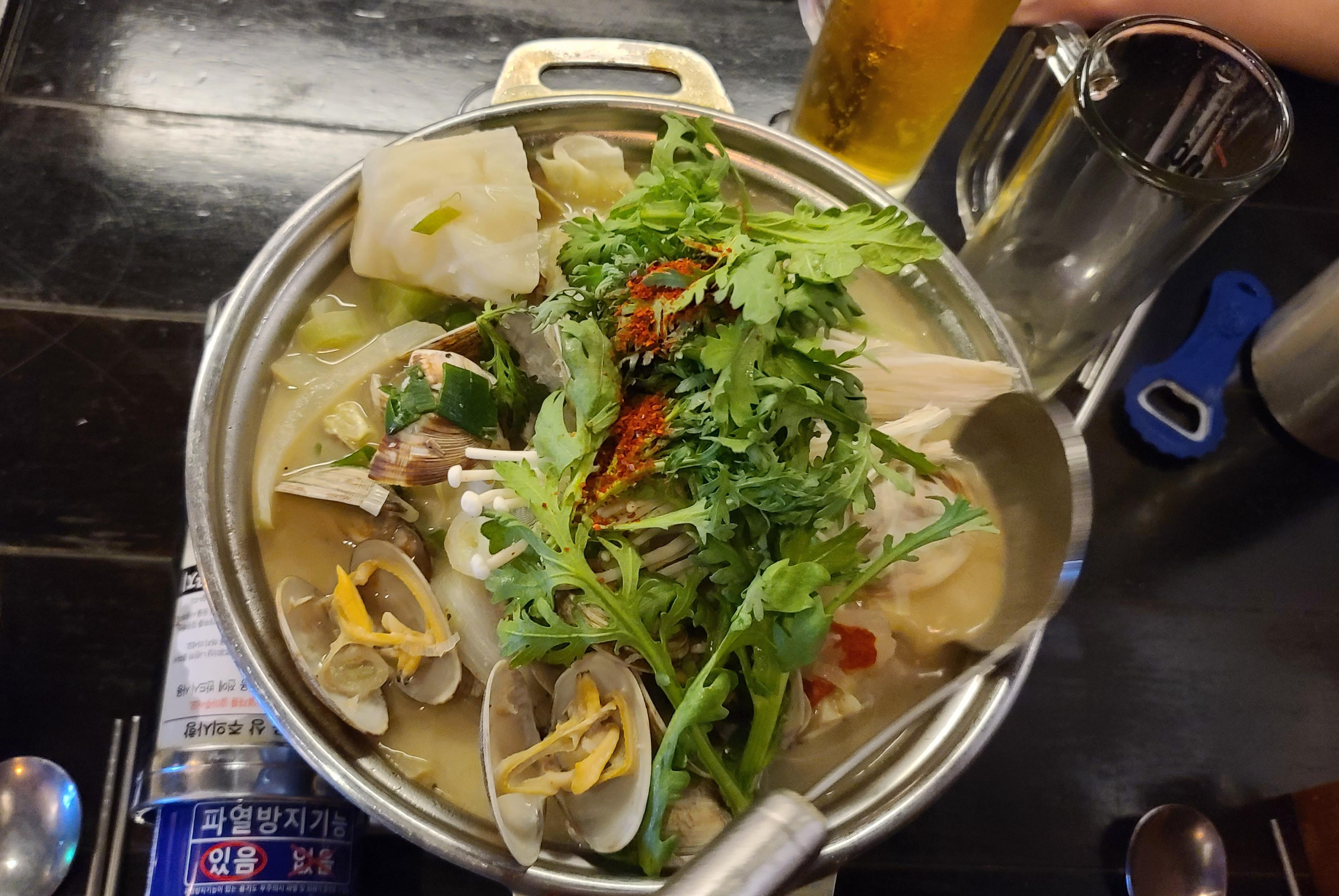 잠시 기다리자 바지락 술찜 안주가 나왔습니다. 뽀얀 해물육수에 바지락과 버터를 넣고 간을 맞춘후 쑥갓과 고춧가루로 동양식의 향과 풍미를 더한 비주얼이 매우 인상적입니다. 잘 끓여주면서 골고루 육수의 간이 배도록 저어주니 바지락과 버터의 향이 풍겨오며 시원한바람과 어우러지는게 역시 네임드 이자카야는 다르구나 하는 것을 느끼게 됩니다.