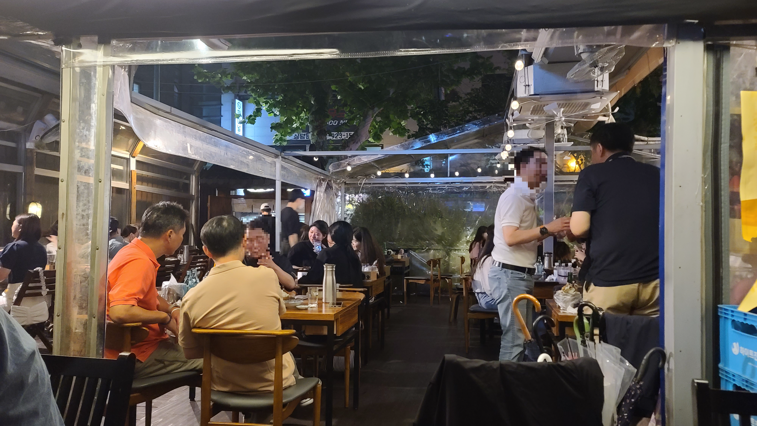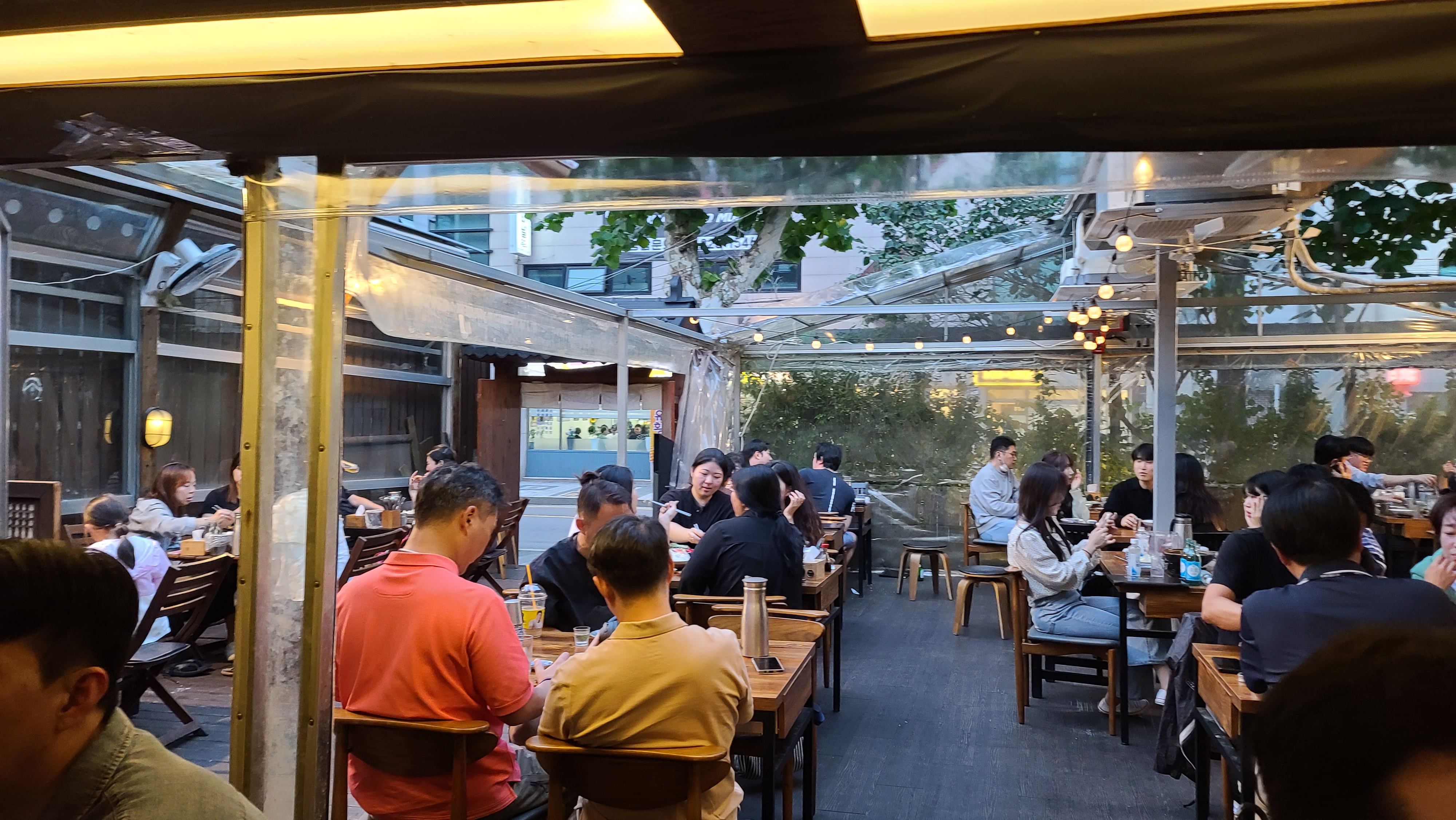 안쪽에 이어서 바깥쪽 자리를 살펴봅니다. 하늘이 쾌청하게 보이는 마당에 테이블이 세팅되어 있으며 많은 사람들이 이미 자리를 꽉 차지하고 술과 안주를 즐기고 있는 모습입니다. 날씨가 좋아서인지 가벼운 옷차림에 시원한 저녁바람을 맞으며 술자리를 즐기는 모습이 무척 여유로워 보입니다.