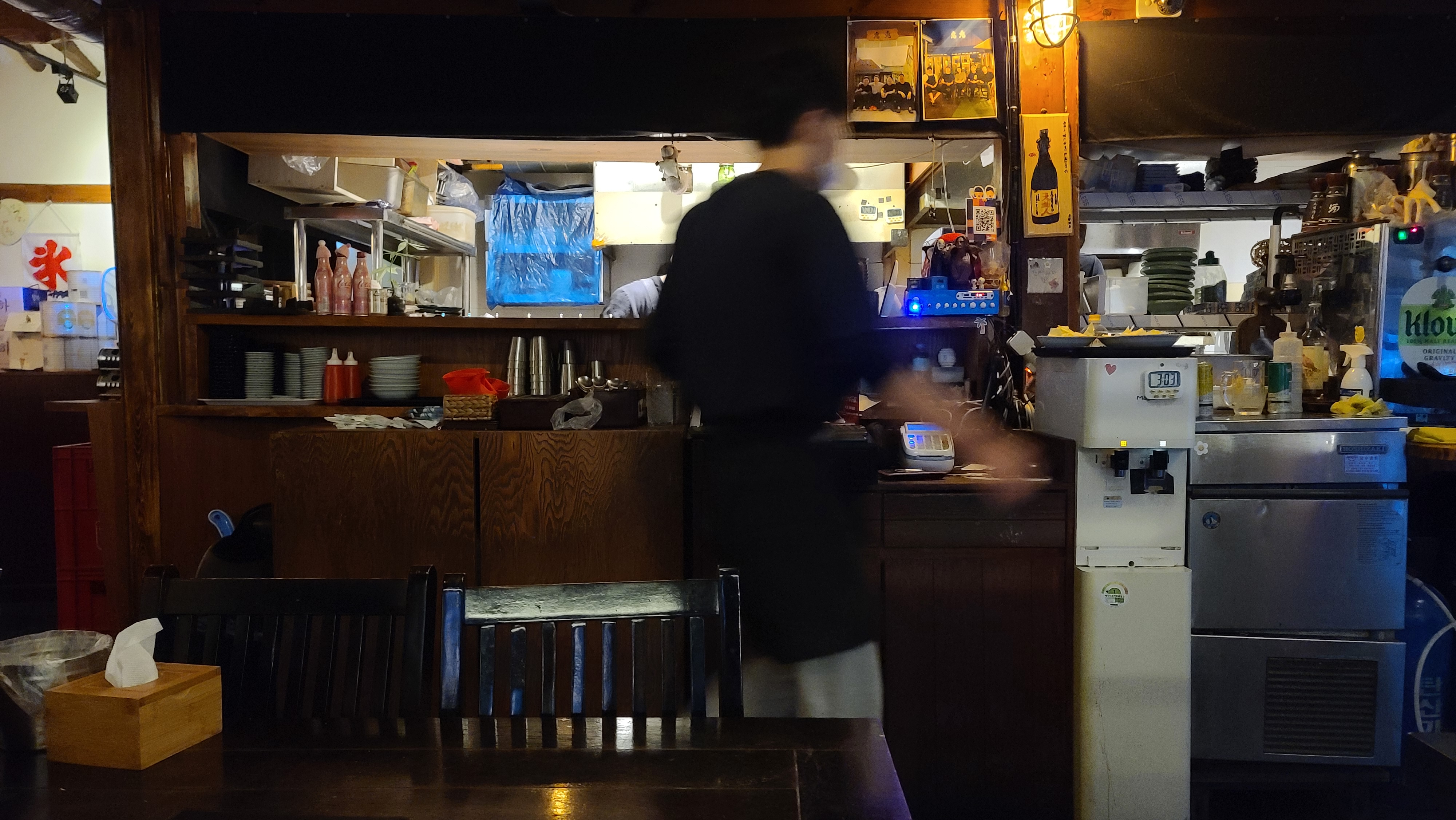 바깥쪽에는 사람들이 많아 가게 안쪽으로 자리를 잡아봅니다. 일본식 목조건물의 인테리어에 오픈형 주방으로서 안쪽에서는 은은한 조명과 함께 이자카야 특유의 소박함과 분위기를 느낄 수가 있도록 구성되어 있습니다.
