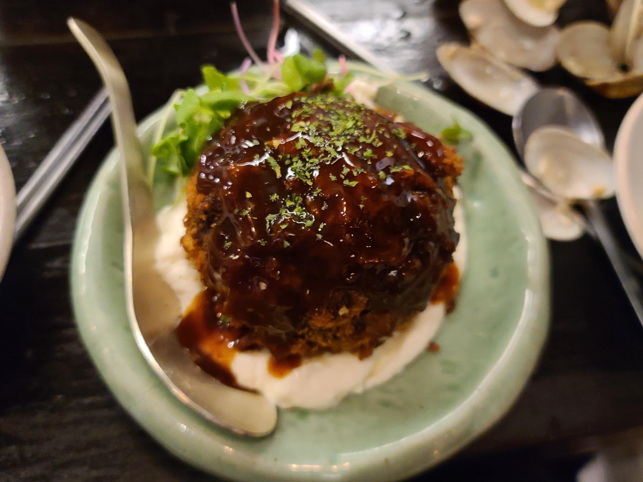 바지락의 시원한 국물과 조갯살을 맛보다 보니 이자카야의 고기 안주류가 갑자기 생각나서 멘치카츠를 주문해봅니다. 삶은 계란 겉으로 다진고기를 뭉치고 튀겨내어 소스로 마무리한 비주얼이 무척이나 맛있어 보입니다.