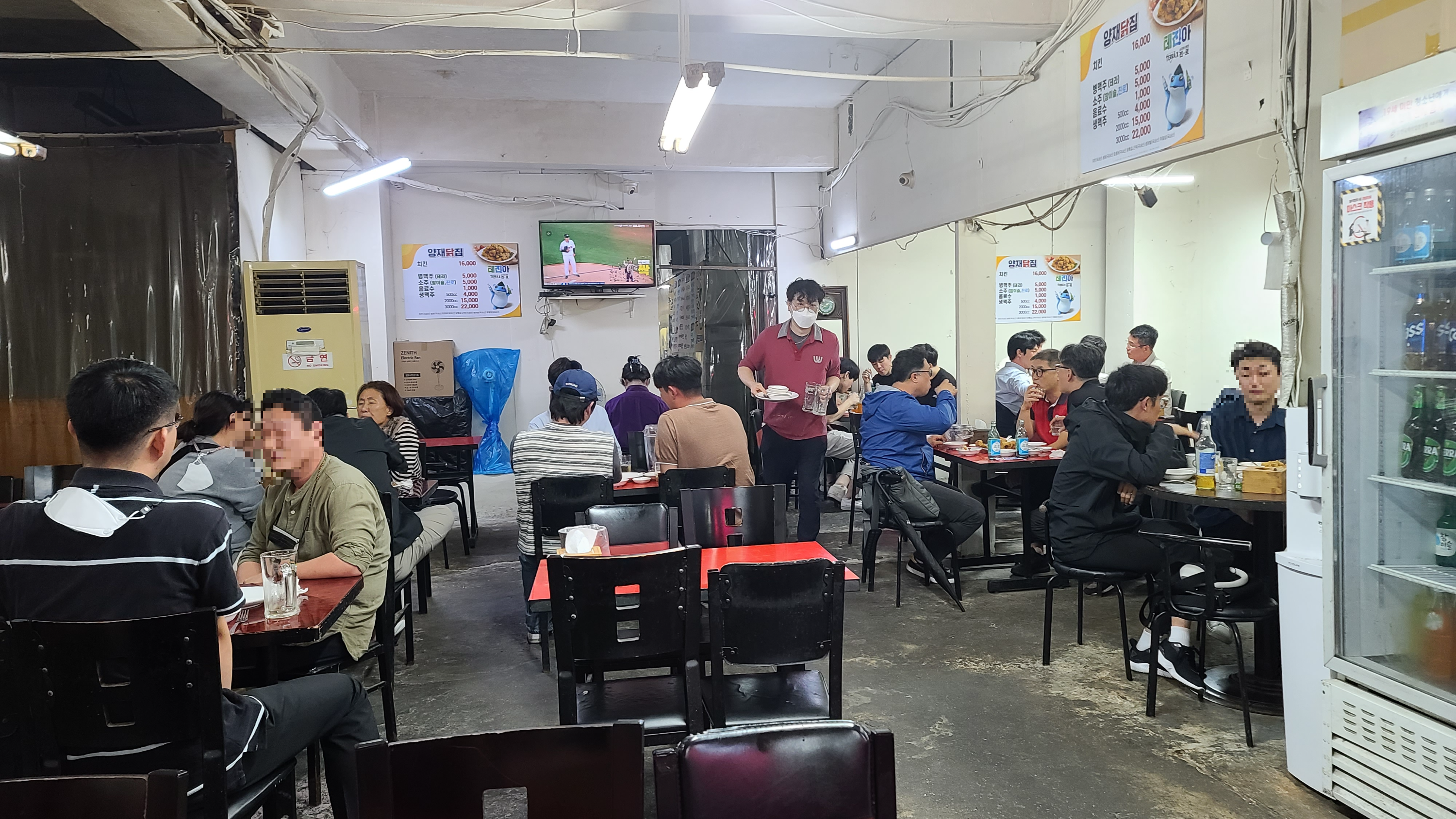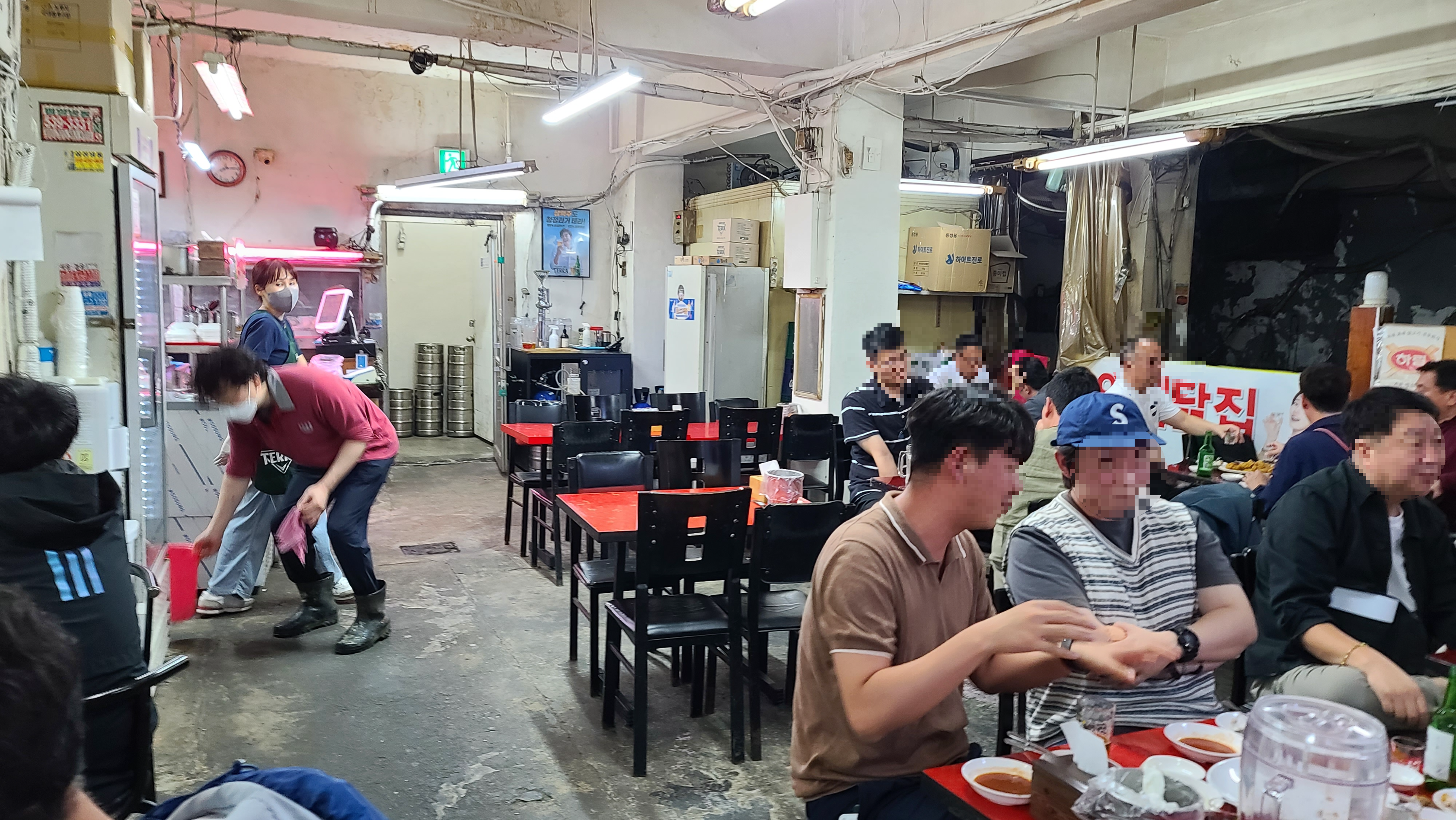 입구에서 테이블쪽을 바라보니 사람들이 가득차 있는 모습입니다. 저마다 치킨을 주문하고 맥주와 소주를 곁들이며 상당히 시끄러운 분위기가 느껴집니다. 조용한 시장구석의 통닭집에 이렇게 사람이 웅성대다니 점점 치킨맛에 환상이 심어지기 시작합니다.