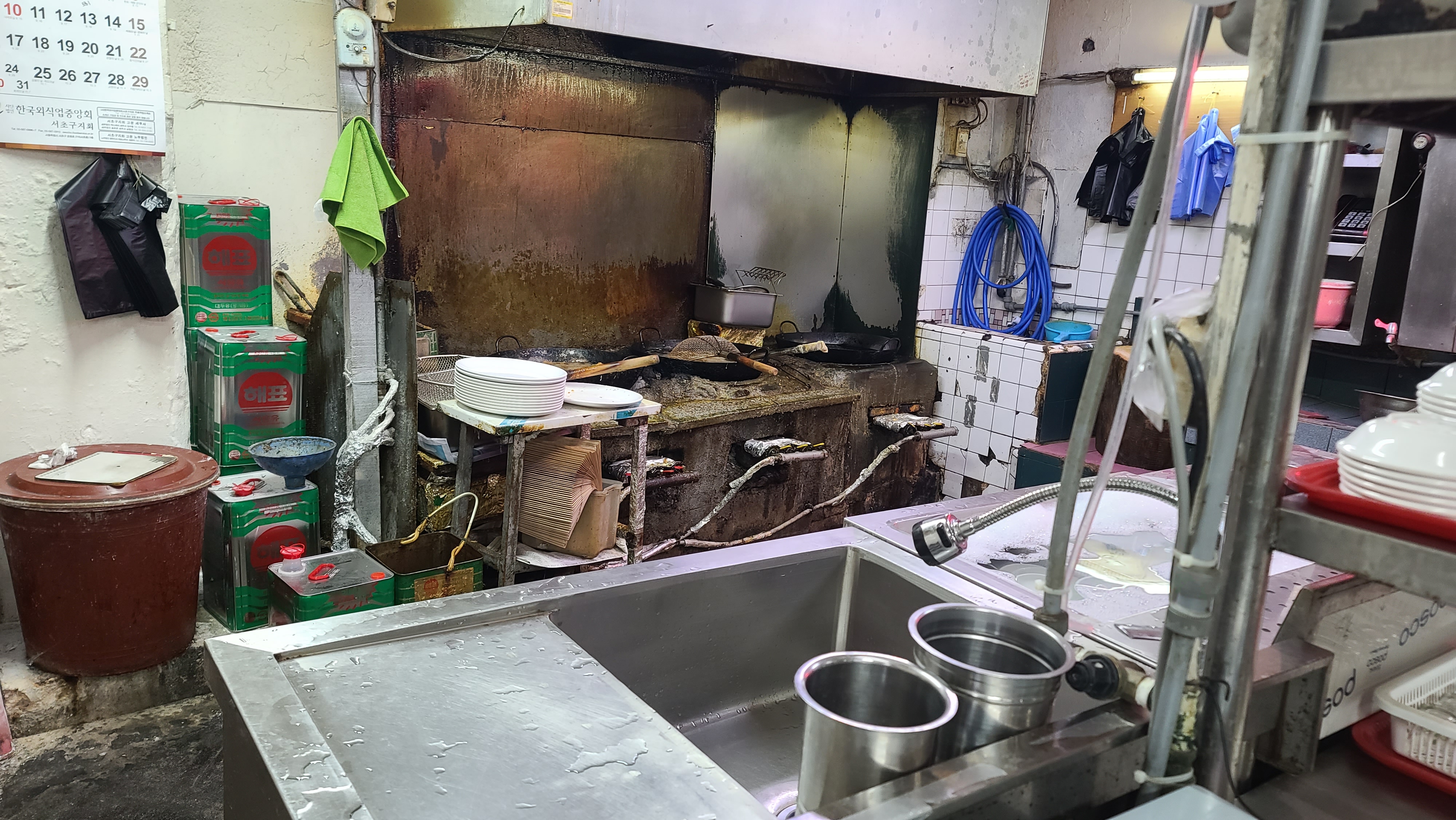 가게를 들어가자마자 입구에 오픈형의 주방이 보였으며 거대한 가마솥에 치킨을 쉴새없이 튀기고 있는 장면이 보입니다. 요즘은 전부타 튀김기계로 치킨을 조리하는 것과 다르게 정말 옛날 시장에서 보던 통닭 그대로의 조리기법이 인상적인 장면입니다.