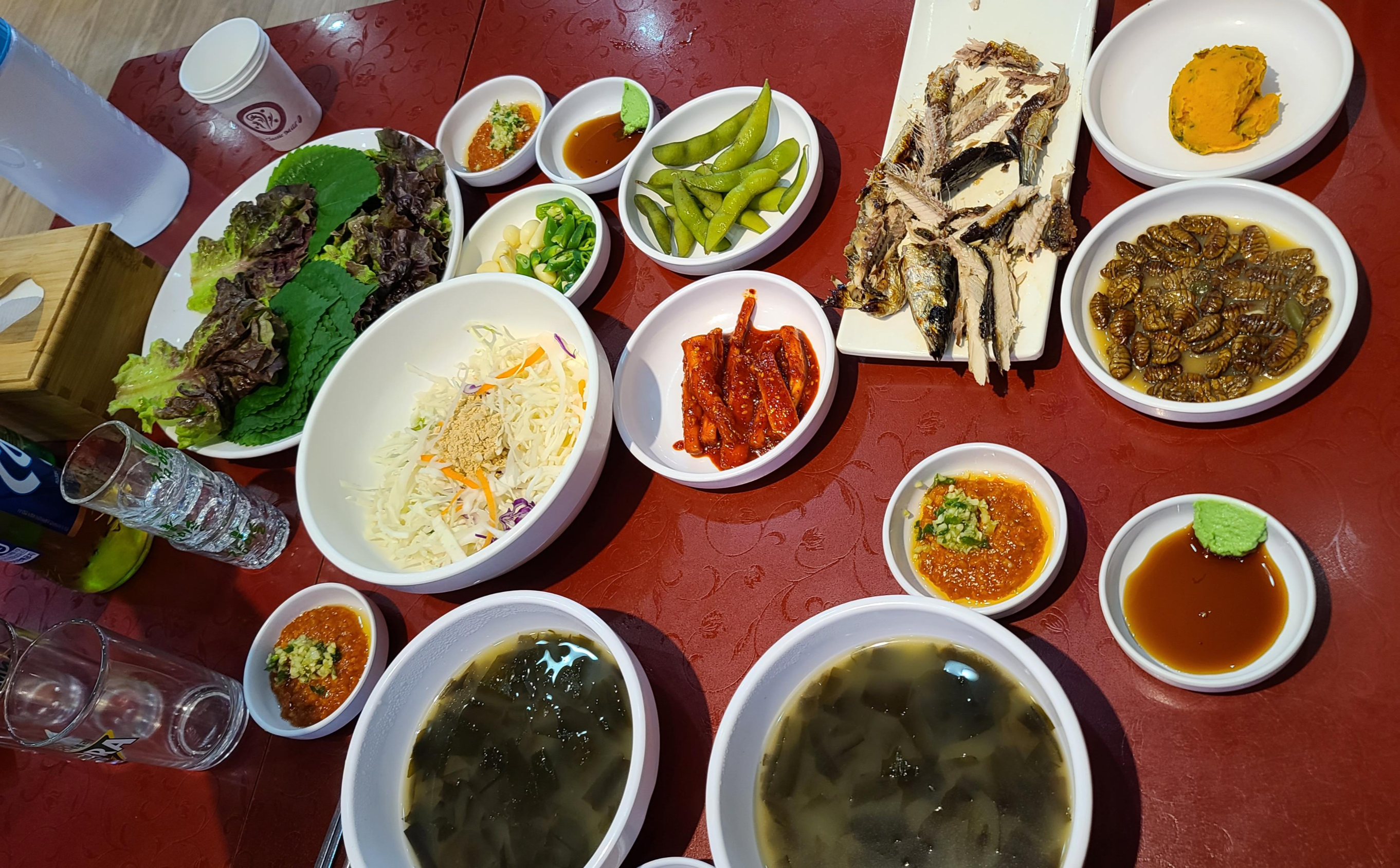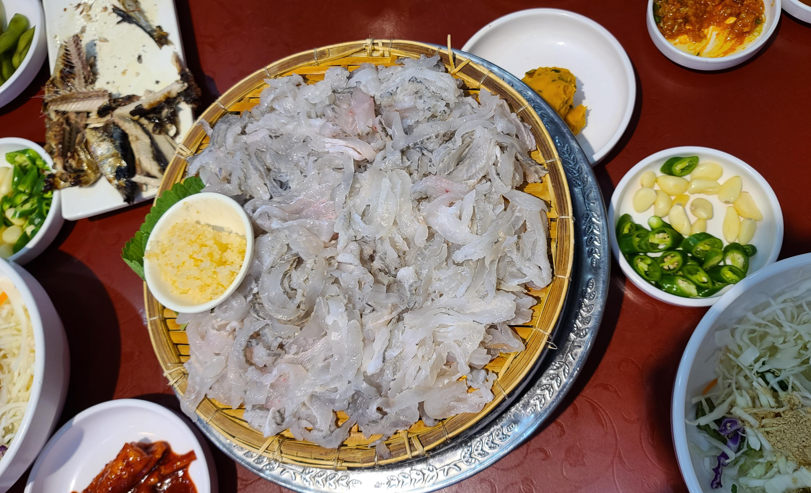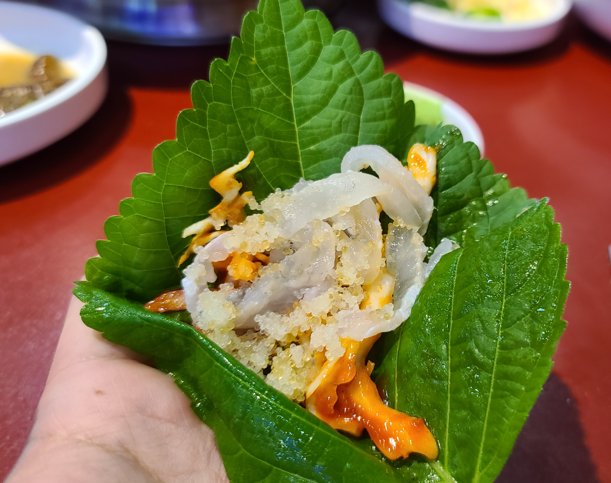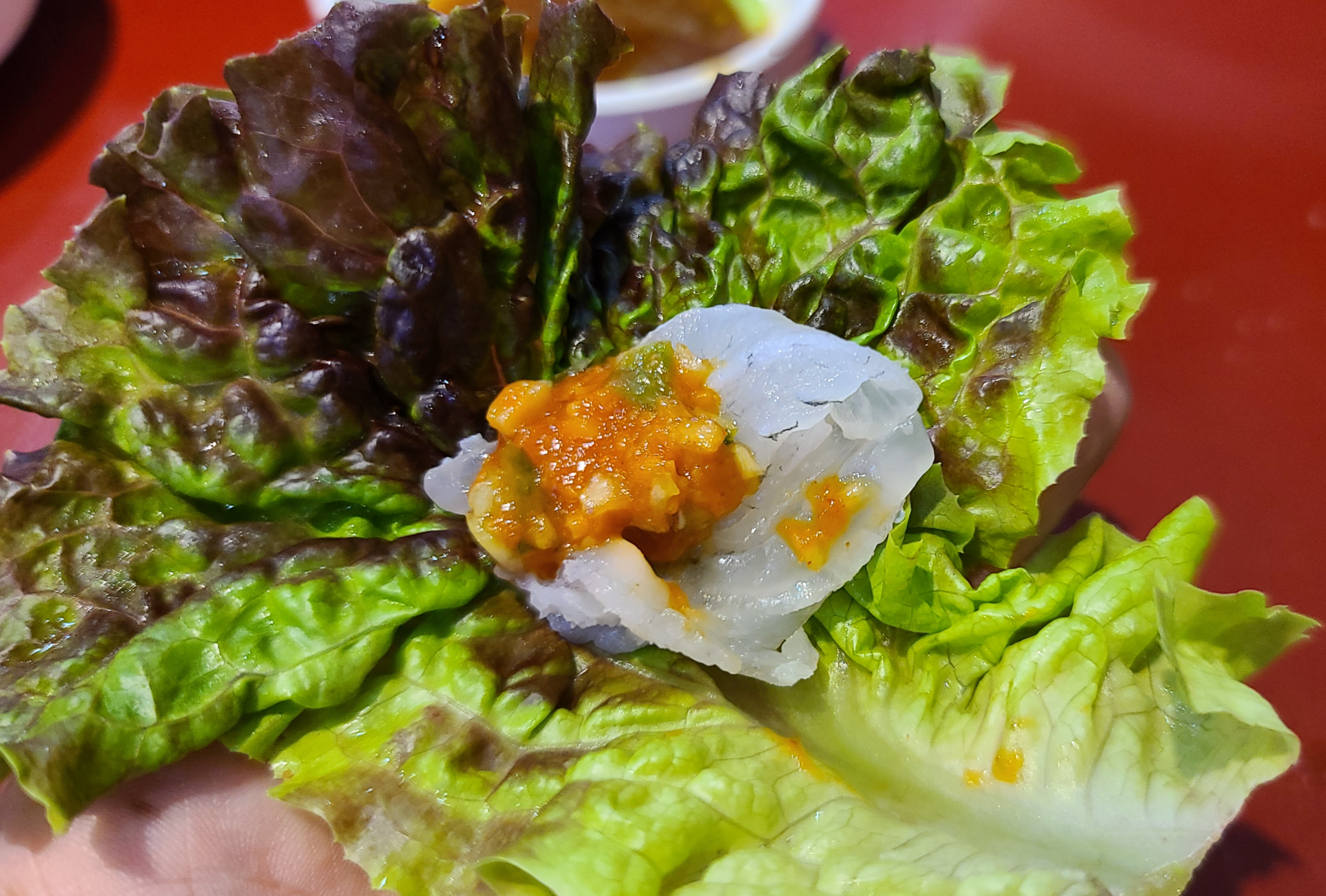 아름다운 비주얼의 도다리세꼬시를 직접도 먹어보고, 깻잎에 양배추샐러드와 함께 날치알을 올려서도 먹어보고 상추와 쌈장을 조합하여서도 먹어보고 다양한 방법으로 세꼬시 맛을 봅니다. 그냥 먹으면 도다리의 지방맛이 자연스럽게 올라오는 향을 느껴서 좋고, 깻잎과 양배추는 고소한 맛을 올려주며 입안에 터지는 날치알이 포인트를 주며, 쌈장은 토속적인 맛을 느끼게 해주고 어떻게 즐겨도 좋은 도다리 세꼬시의 맛을 감탄하며 계속 즐겨봅니다.