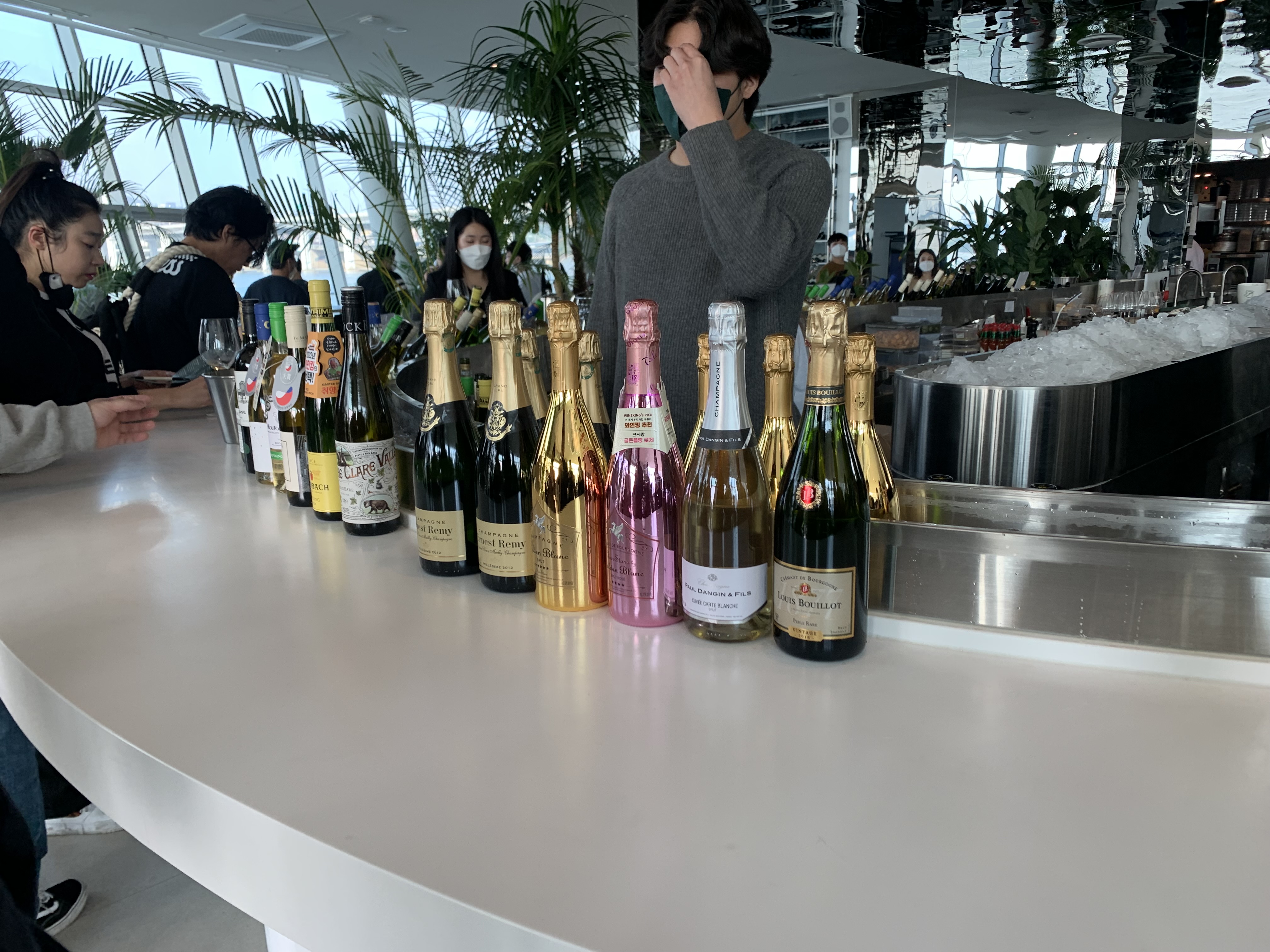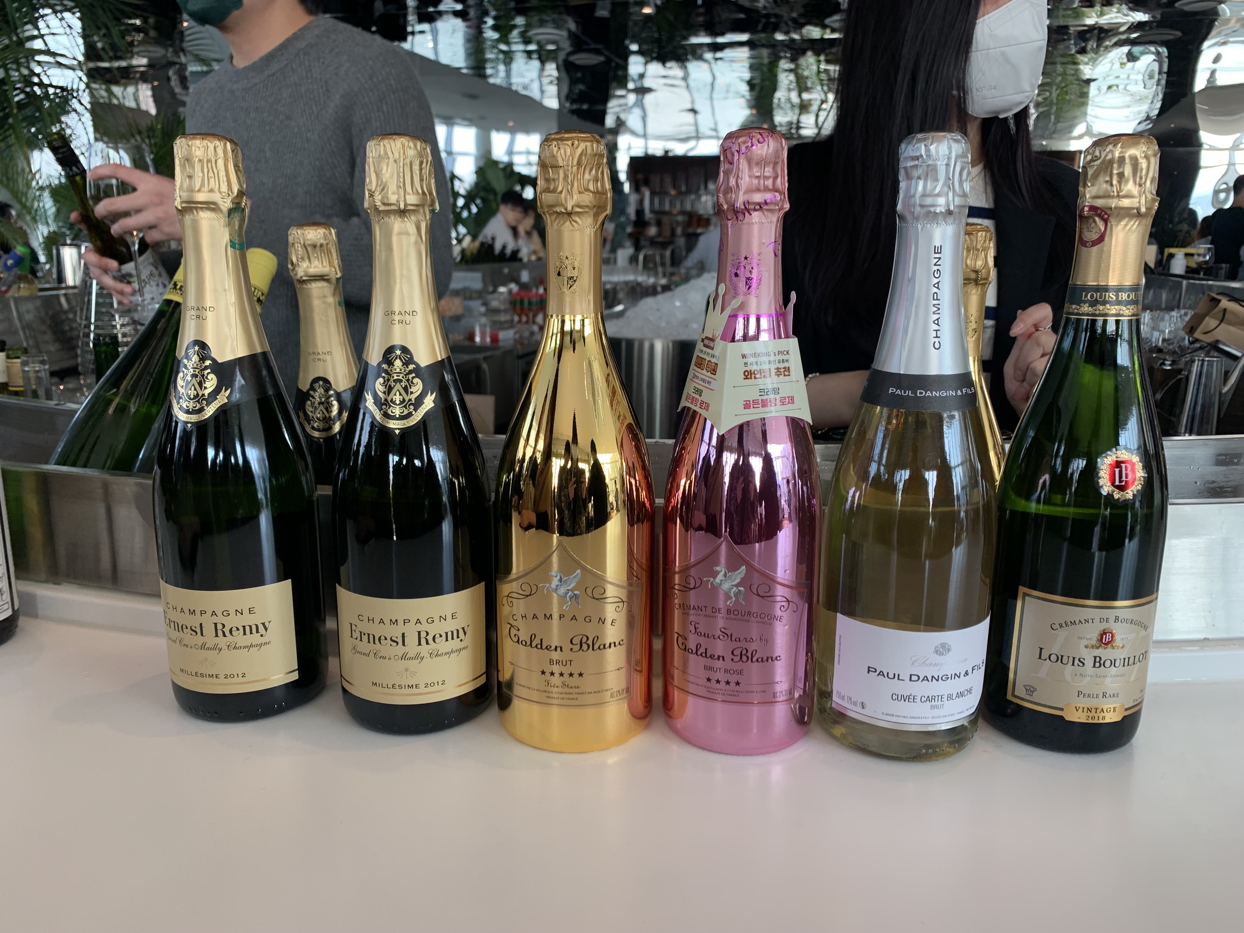 이날 가장 인기가 있는 와인킹의 선택을 받은 샴페인 시리즈들을 담아봅니다. 왼쪽부터 어니스트 레미, 골든블랑, 폴당장, 루이부요 순으로 진열되어 있으며 고가의 와인이다보니 시음회에서 인기가 많은 것은 어쩔 수 없나 봅니다.